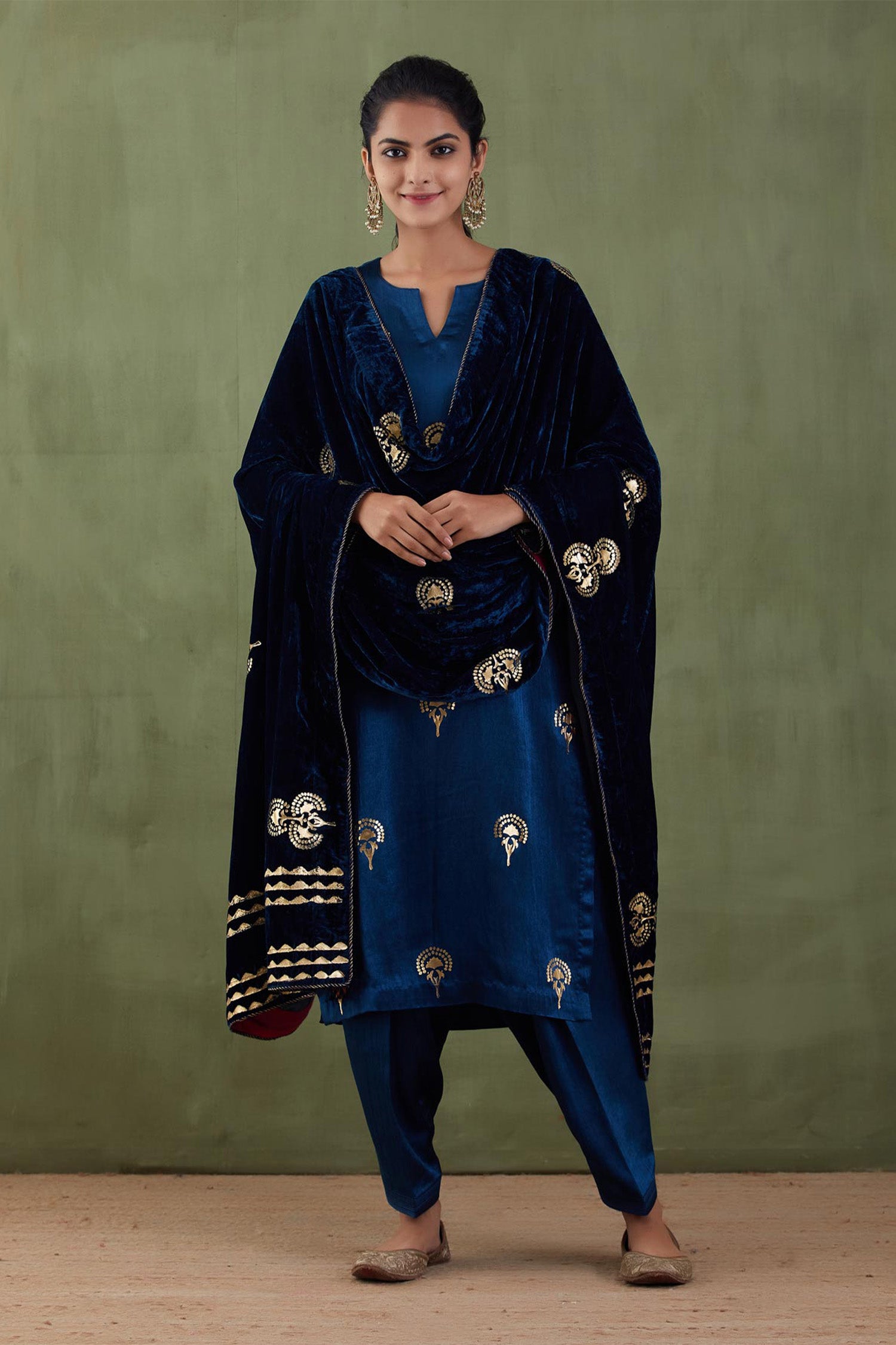 Dark Blue Foil Printed Mashru Silk Straight Kurta And Salwar With Velvet Shawl Set