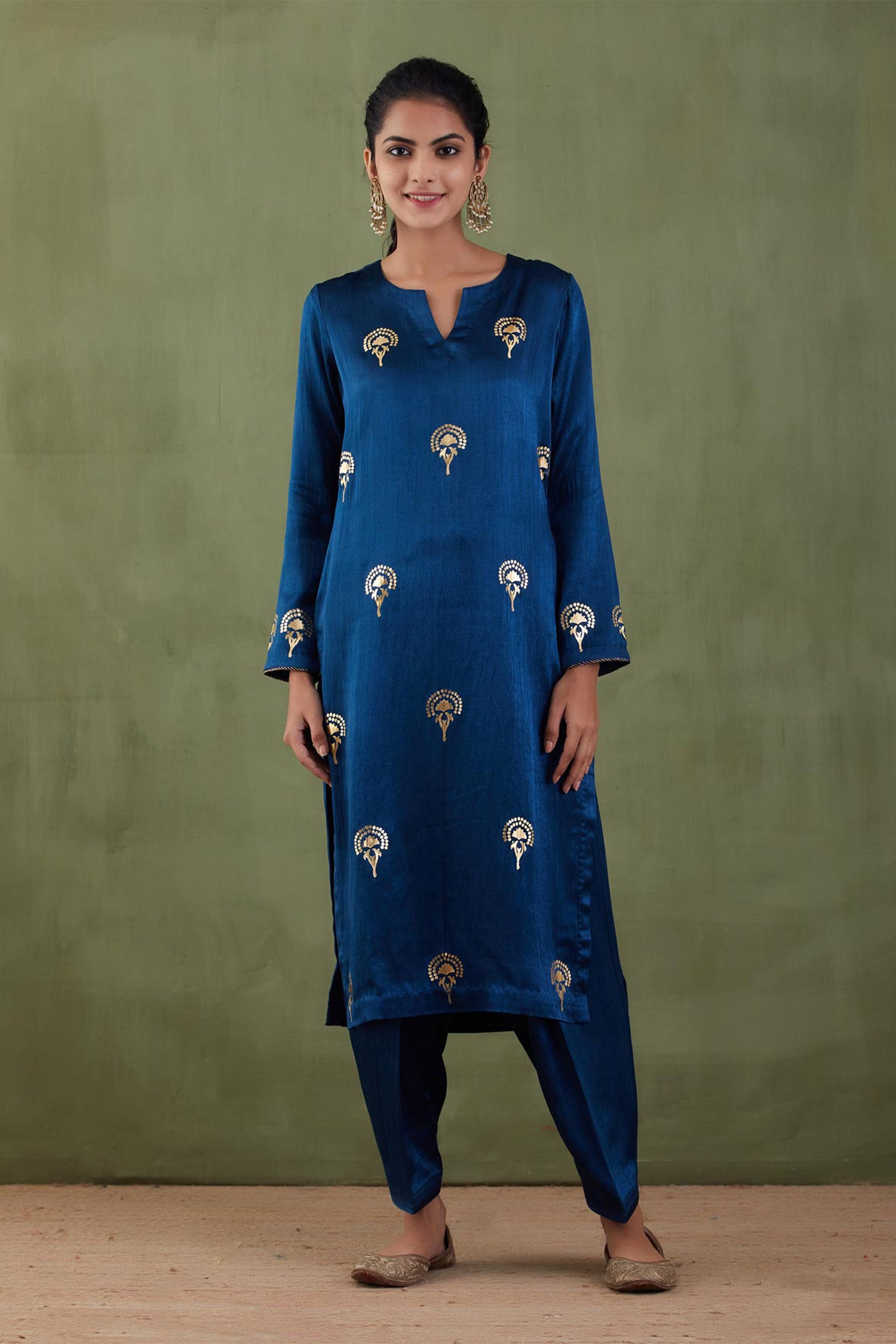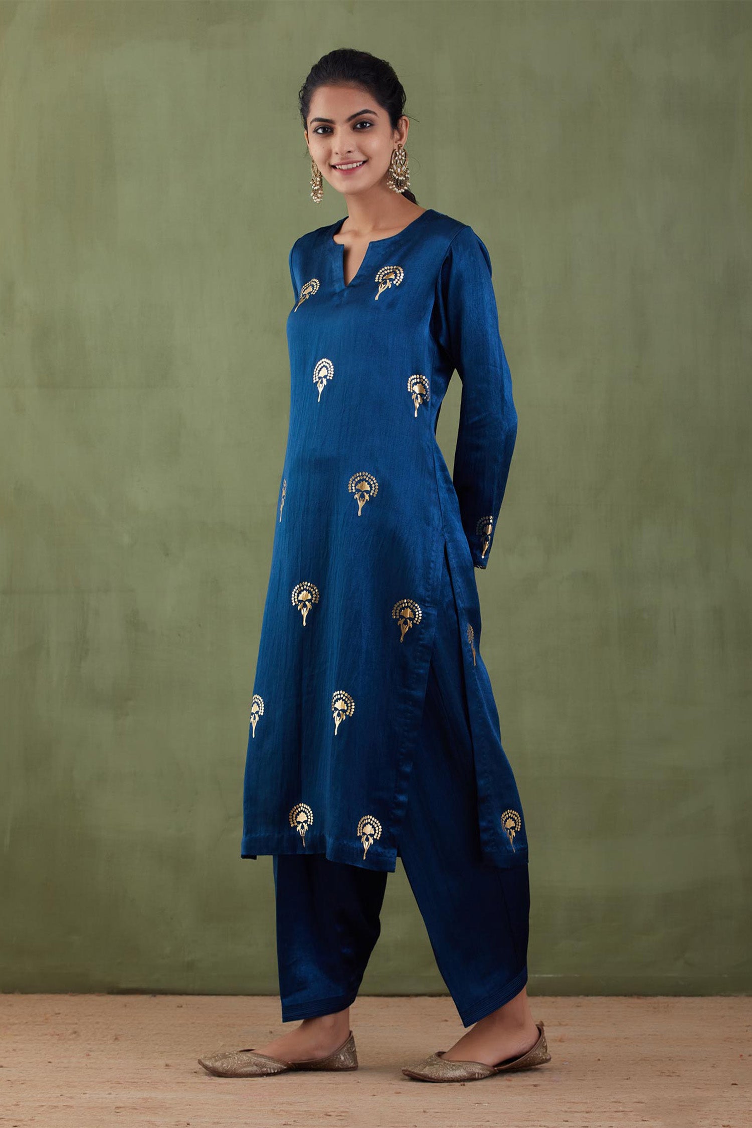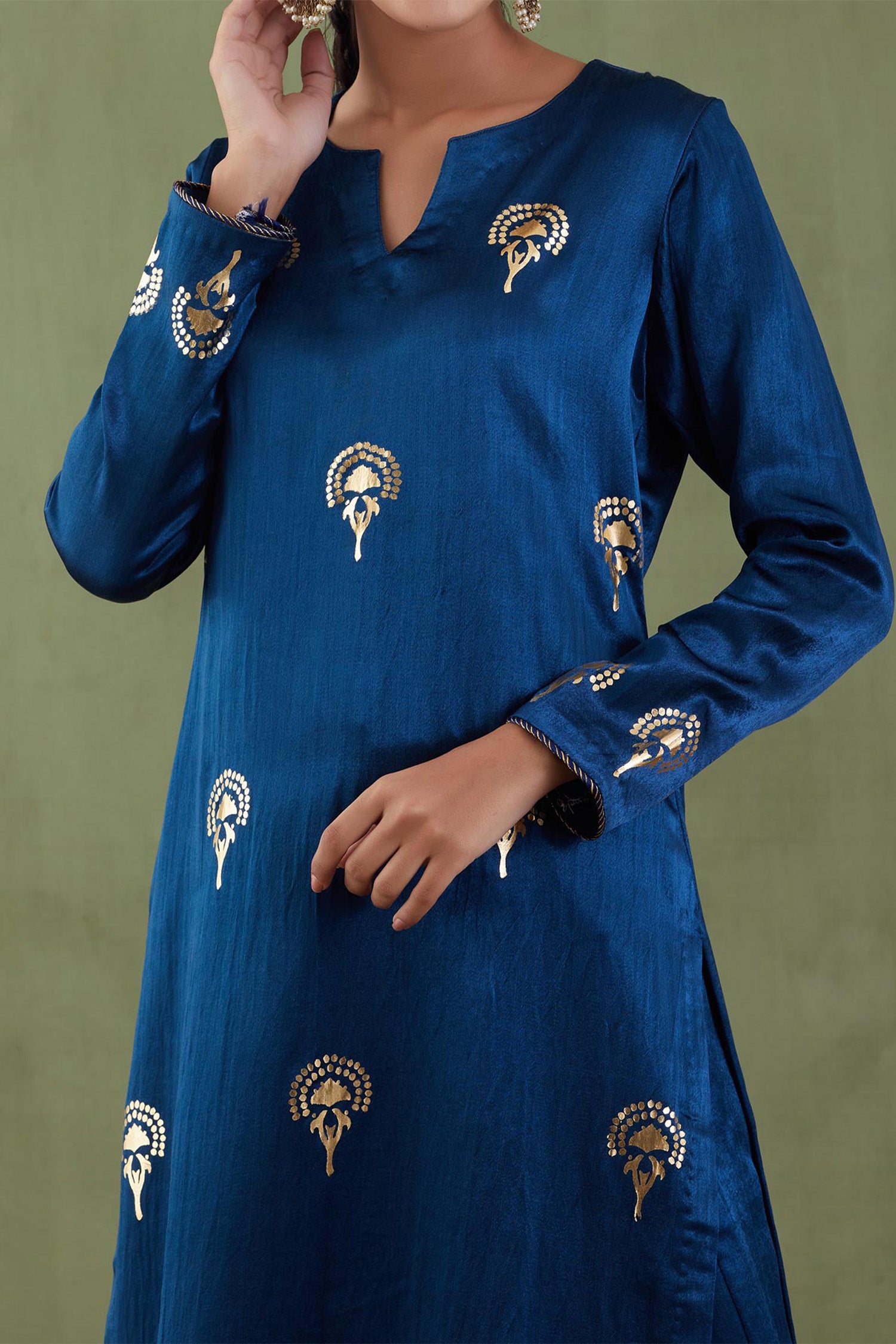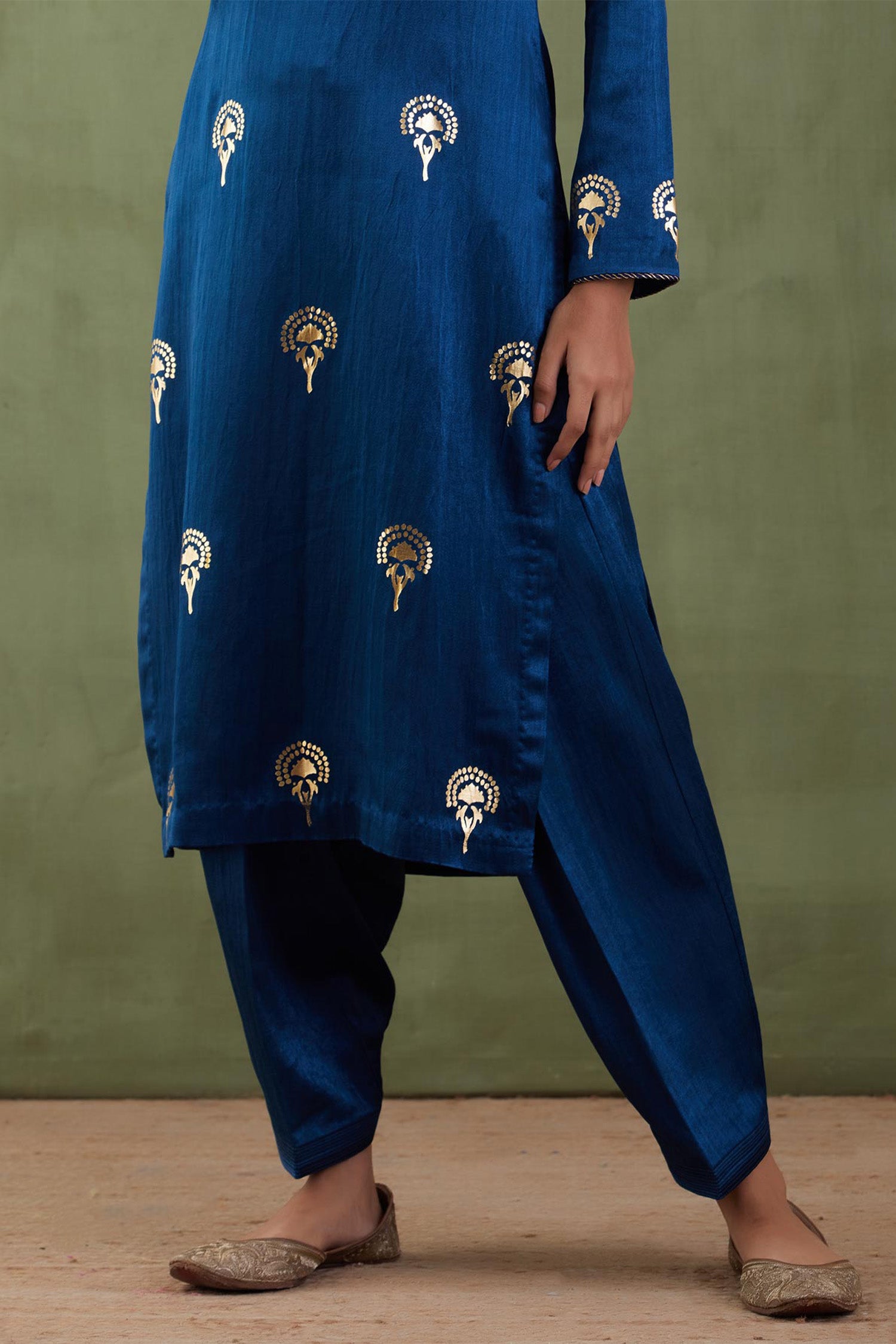 The elegant dark blue straight kurta set with the matching pants set along with the foil printed design for a rich look in casual and festive occasions with the desired comfort for the dignified touch.