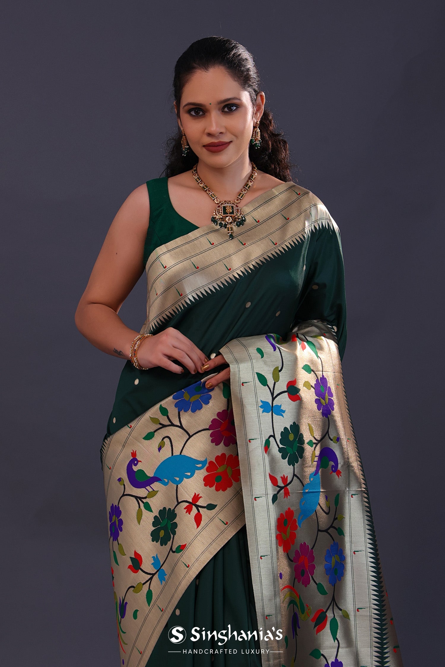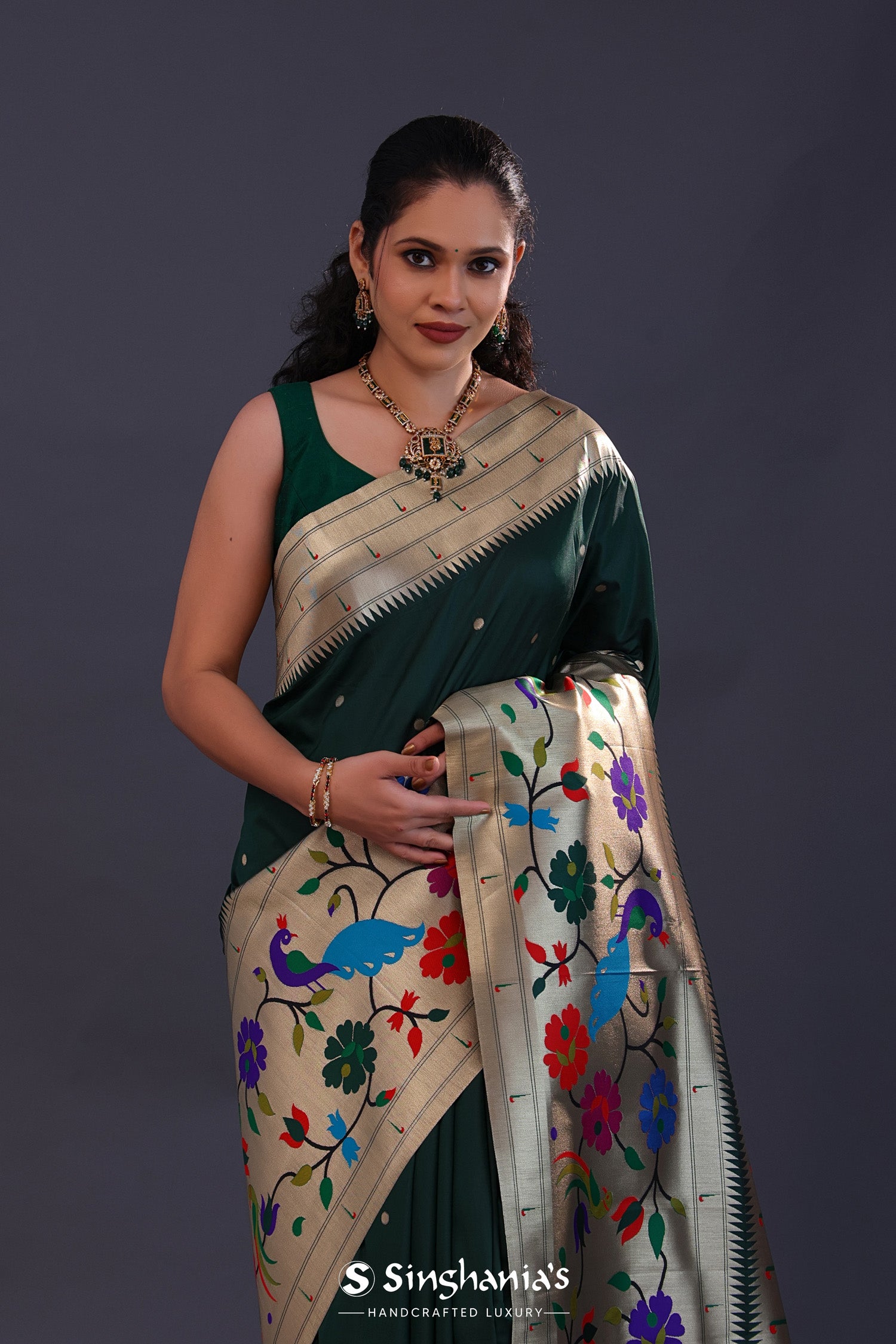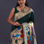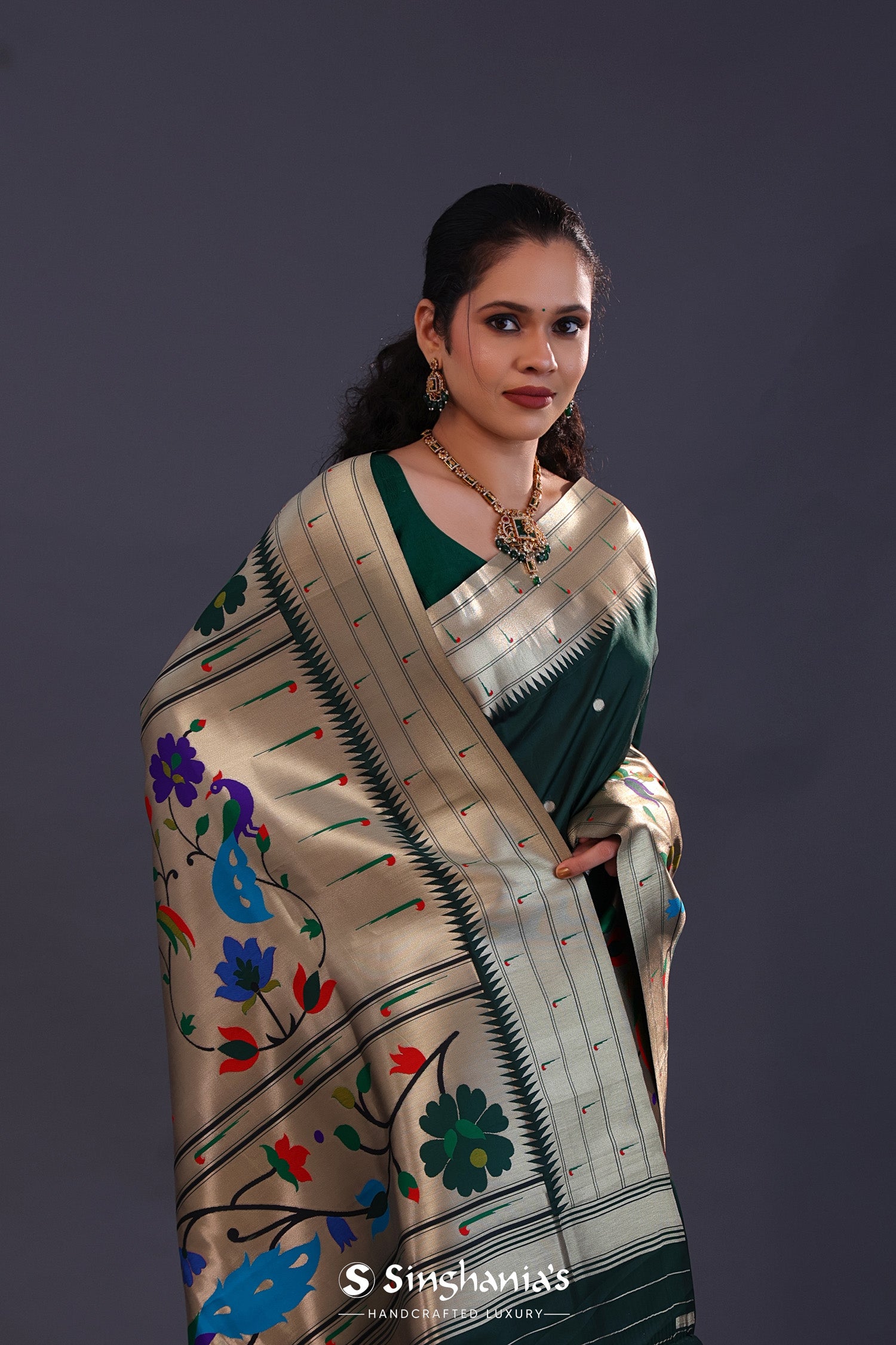 The Dark bottle green paithani saree features butti's woven with gold zari complemented with paithani border and unstitched blouse