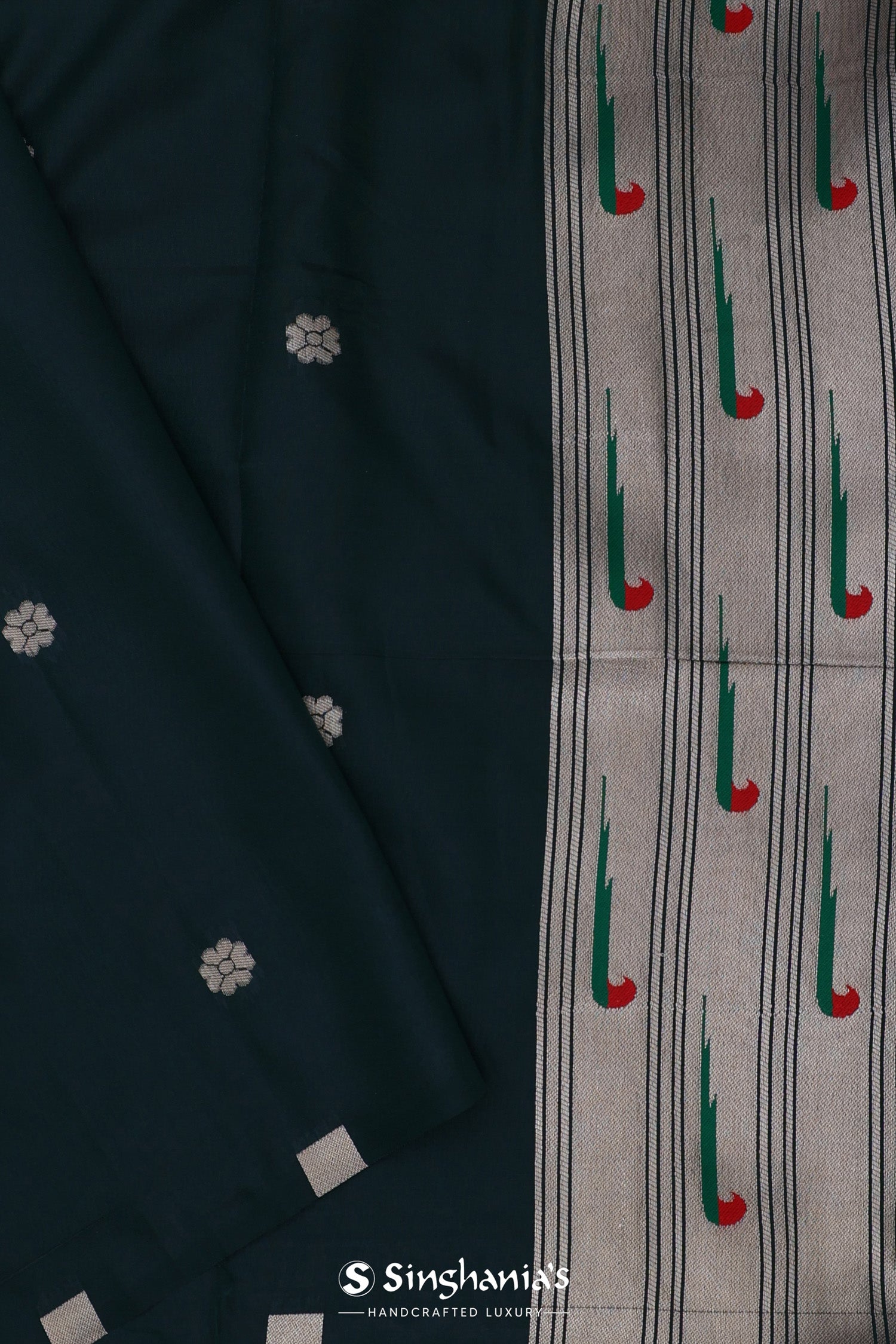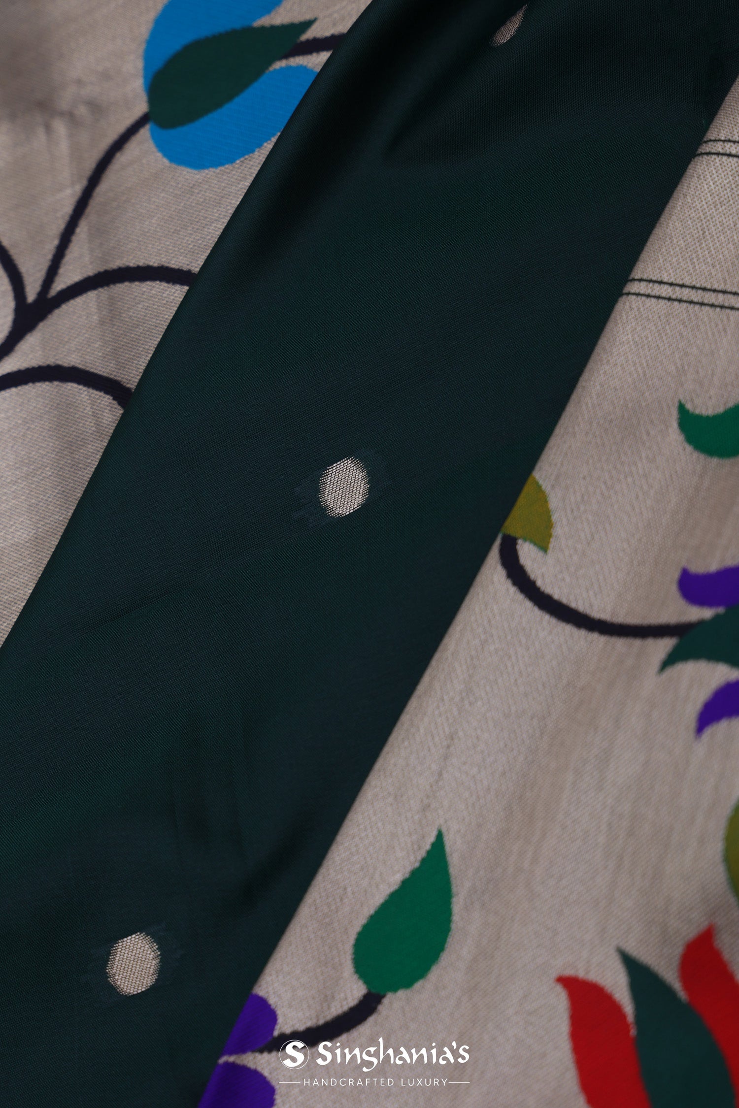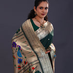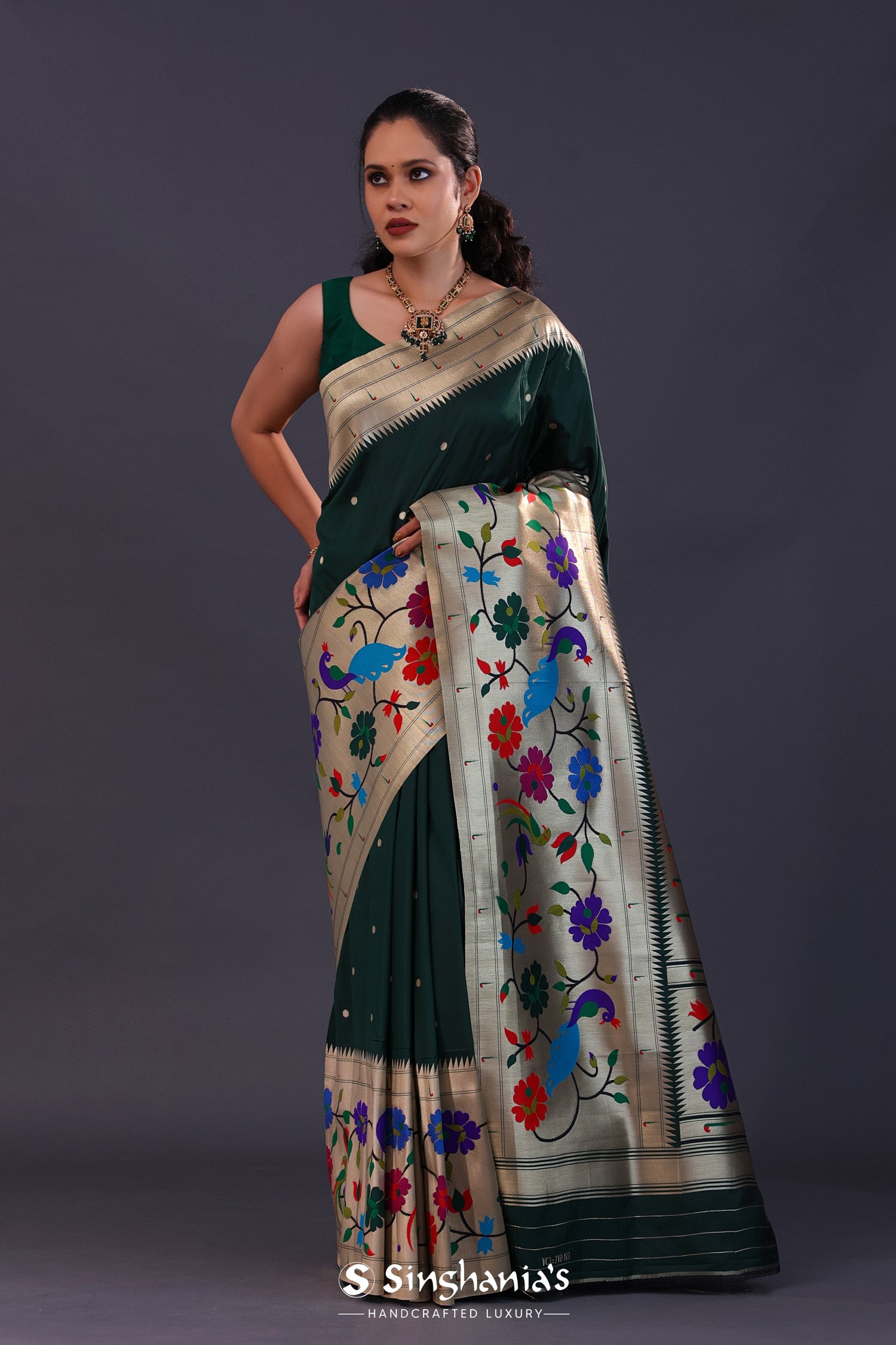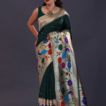 The Dark bottle green paithani saree features butti's woven with gold zari complemented with paithani border and unstitched blouse