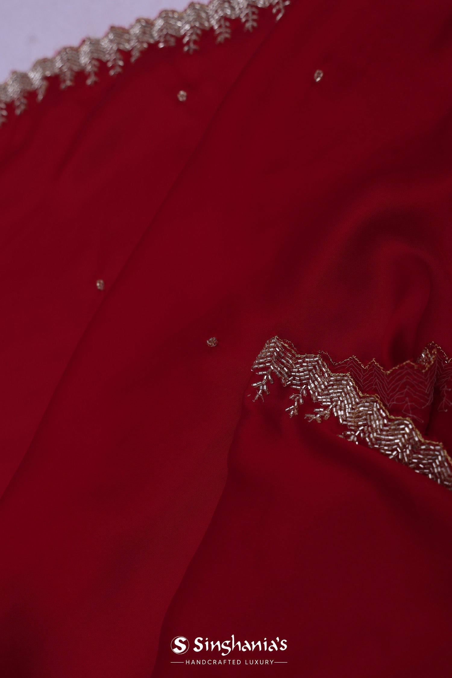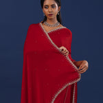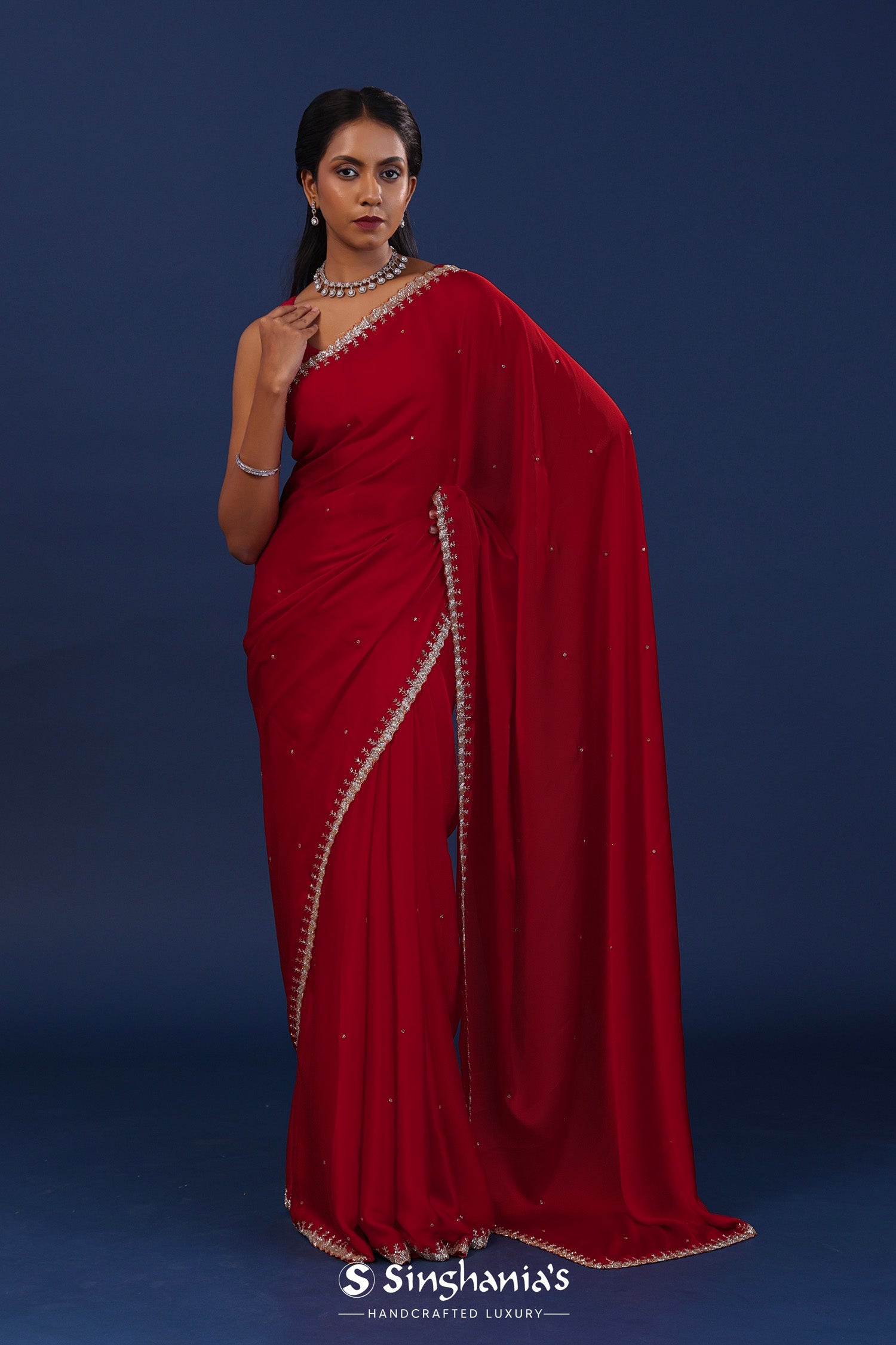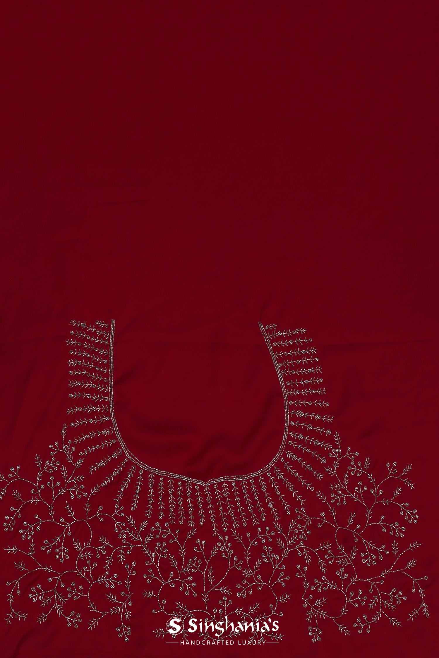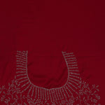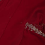 The embroidered dark crimson red satin saree with cutdana work with an unstitched self blouse for a decent and dignified look.