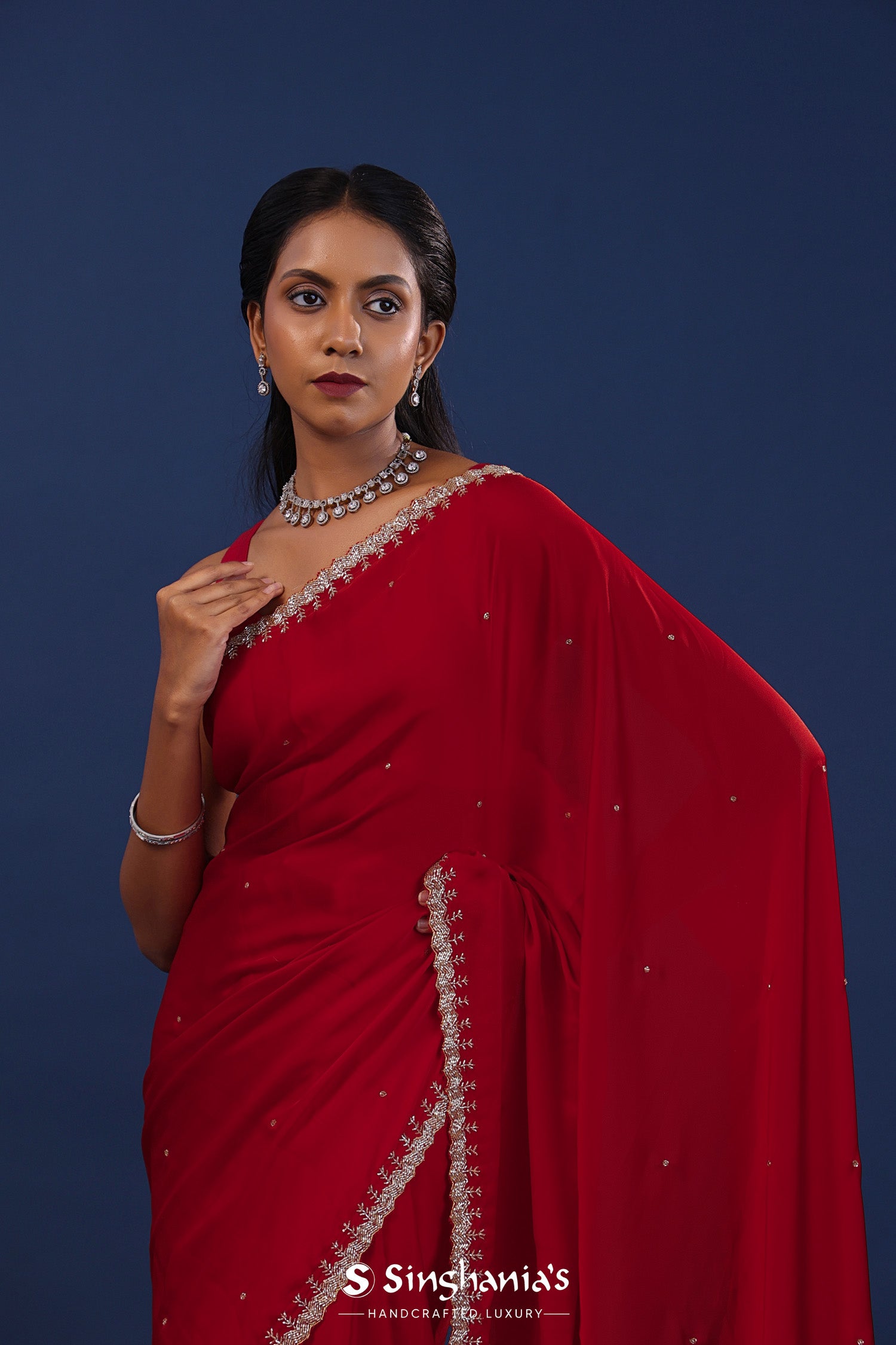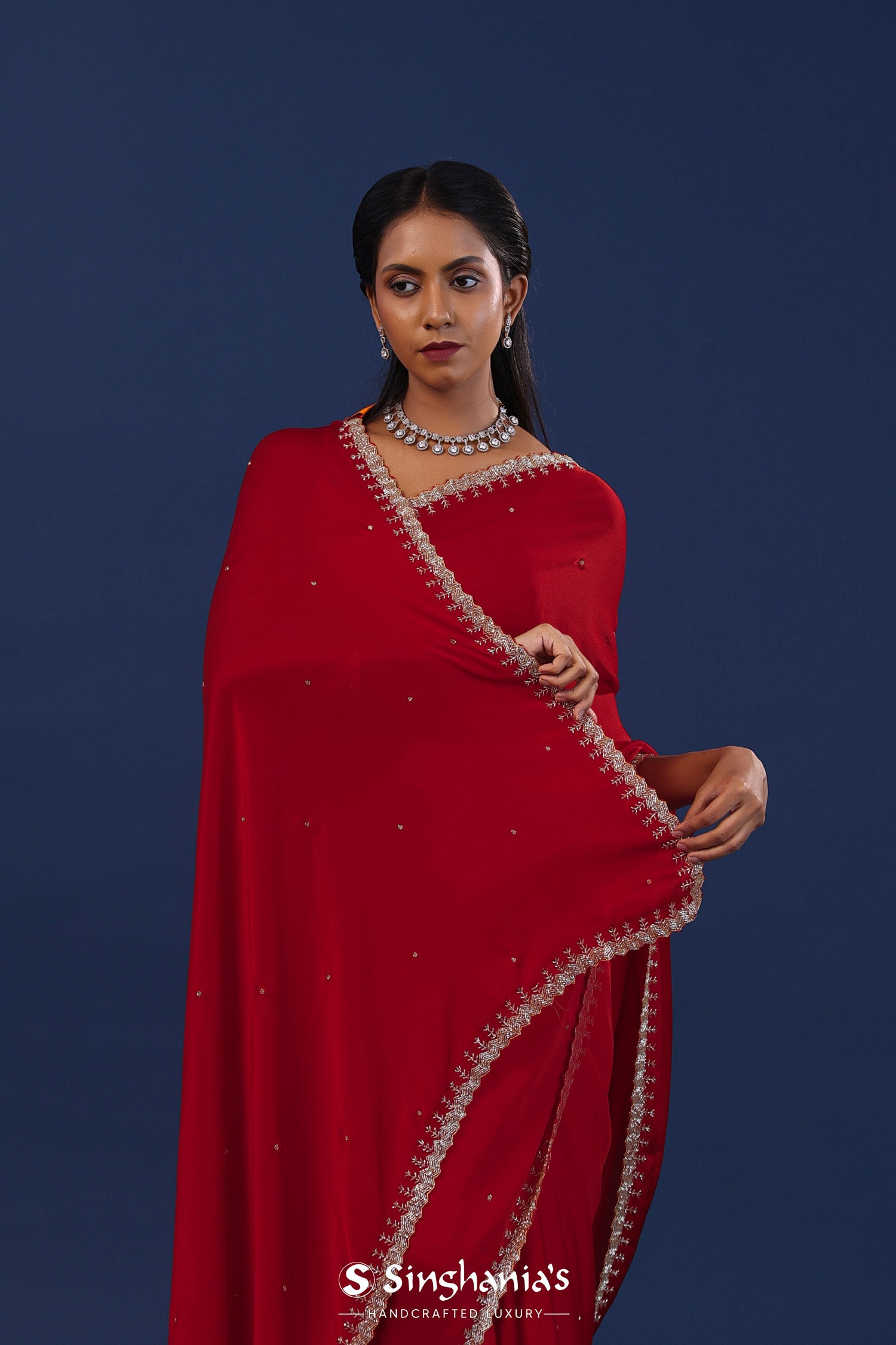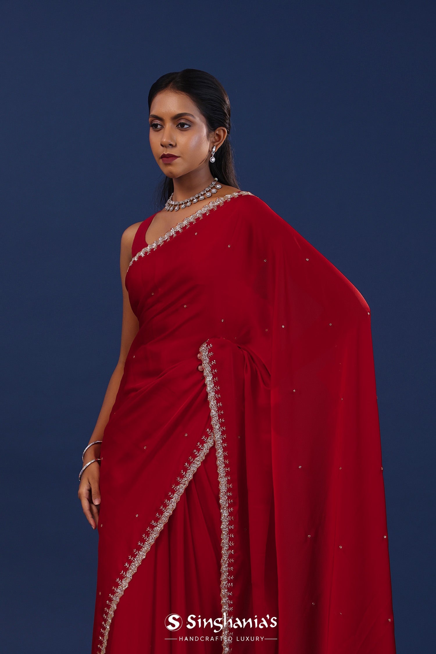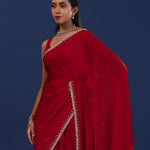 The embroidered dark crimson red satin saree with cutdana work with an unstitched self blouse for a decent and dignified look.