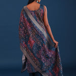 The dark forest green crepe banarasi butti floral printed kurti set with raw silk pant and crepe silk dupatta for a simple and neat look.