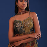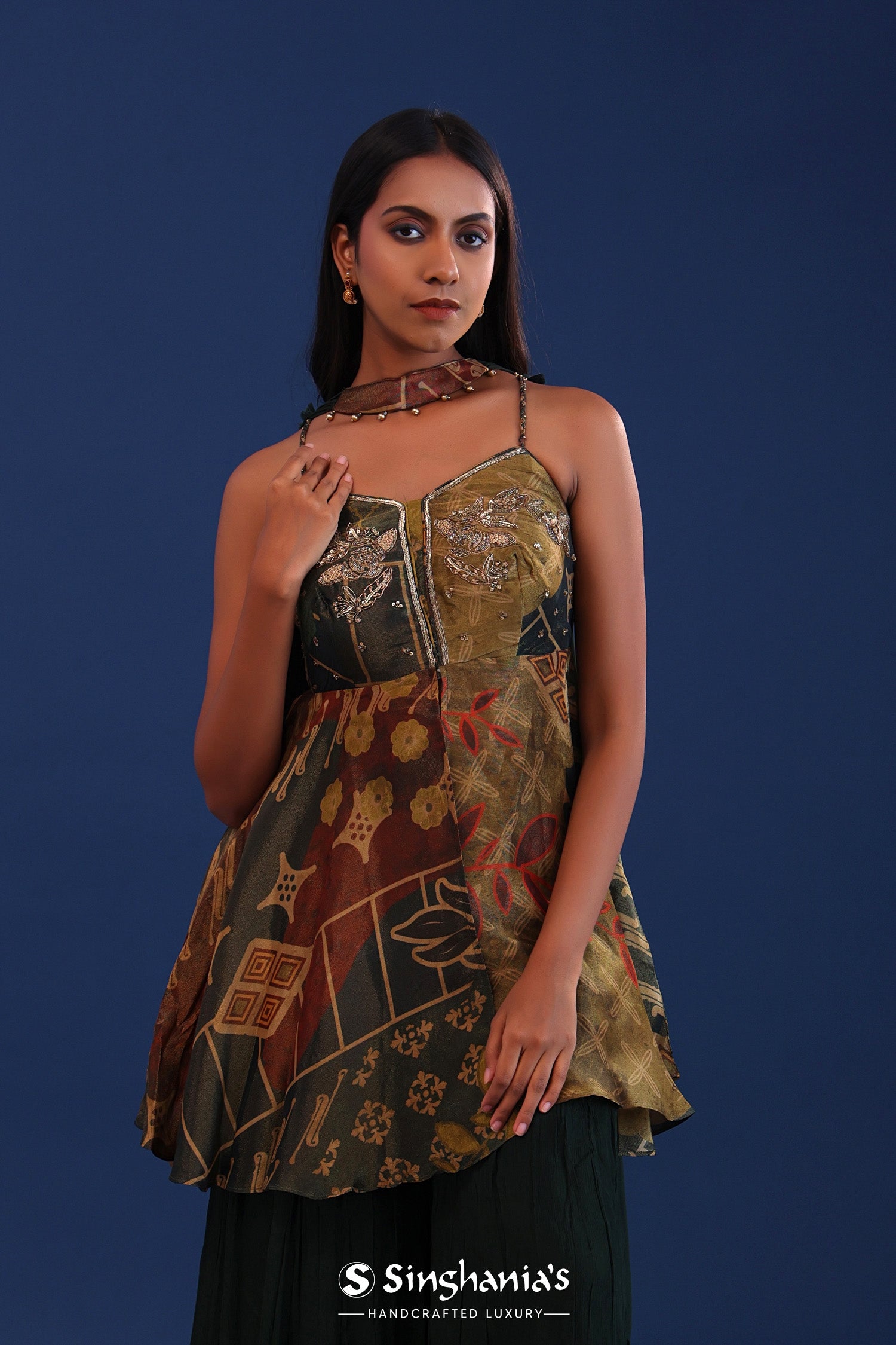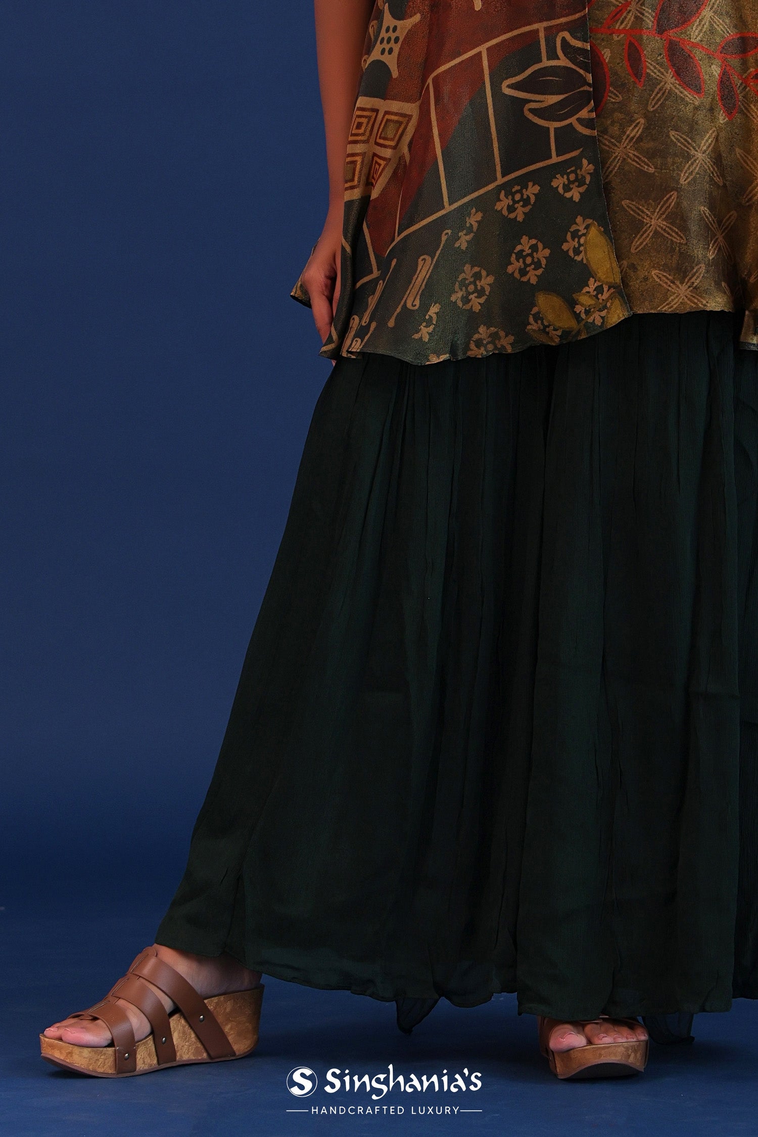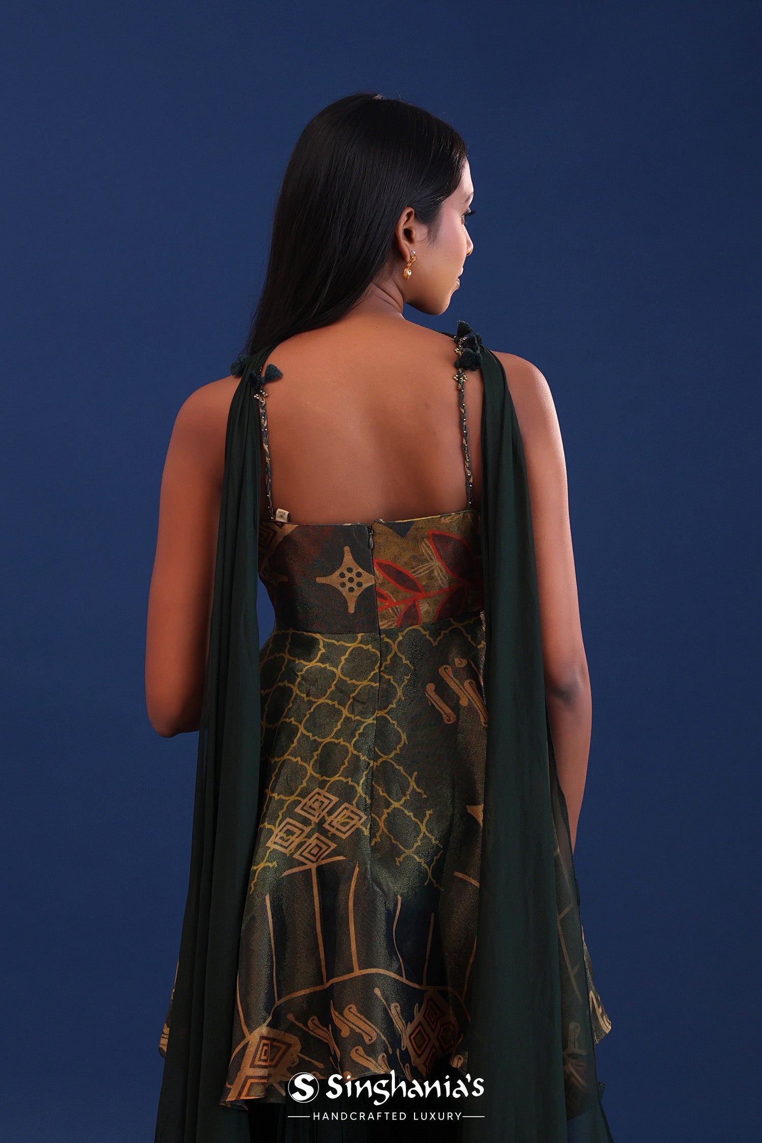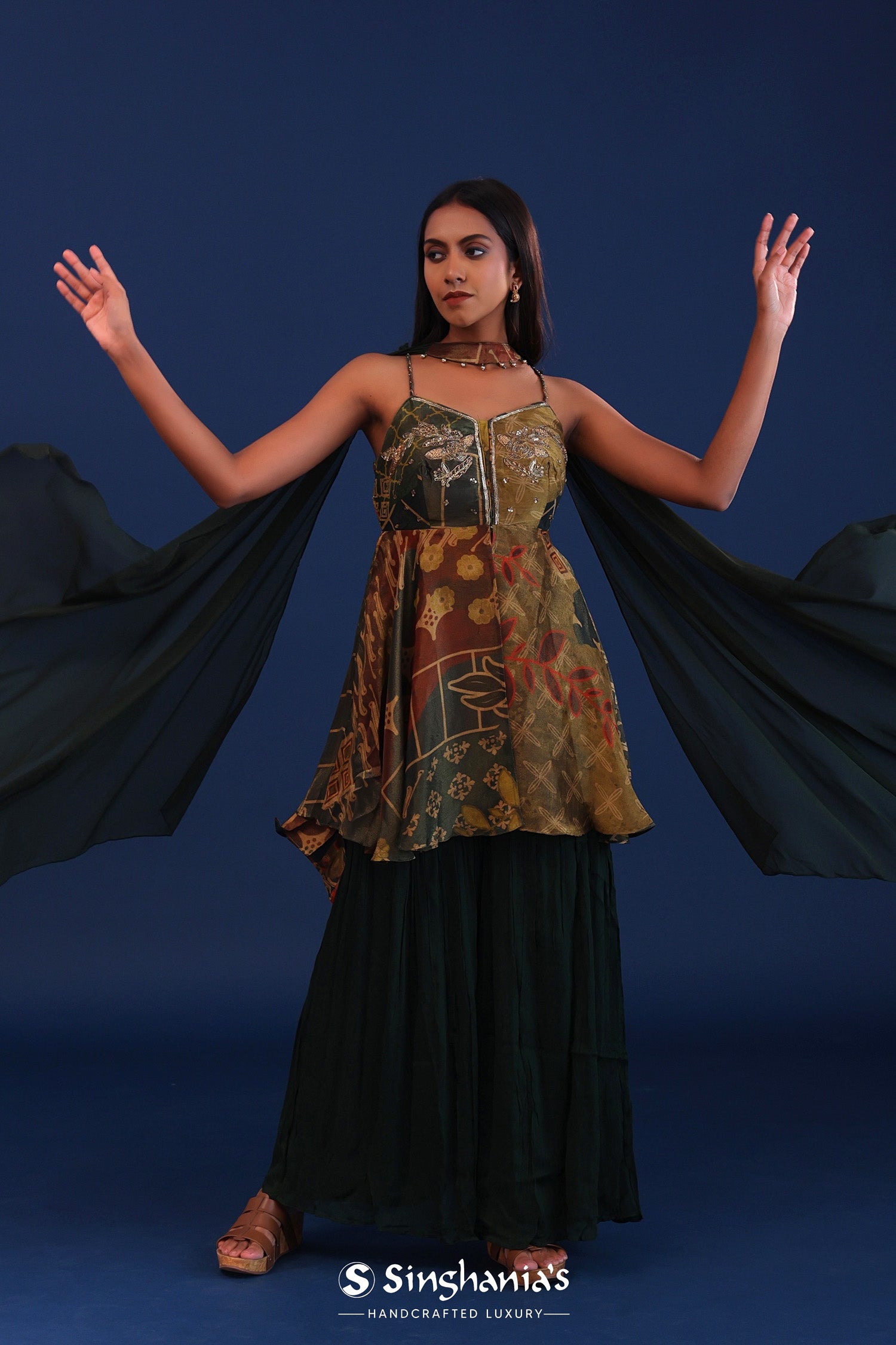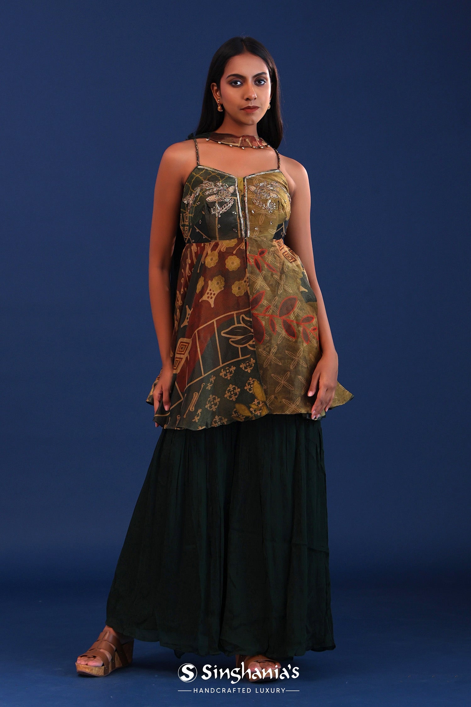 The dark forest green organza printed kurta with crepe silk sharara and georgette dupatta for a perfect blend of tradition and style.