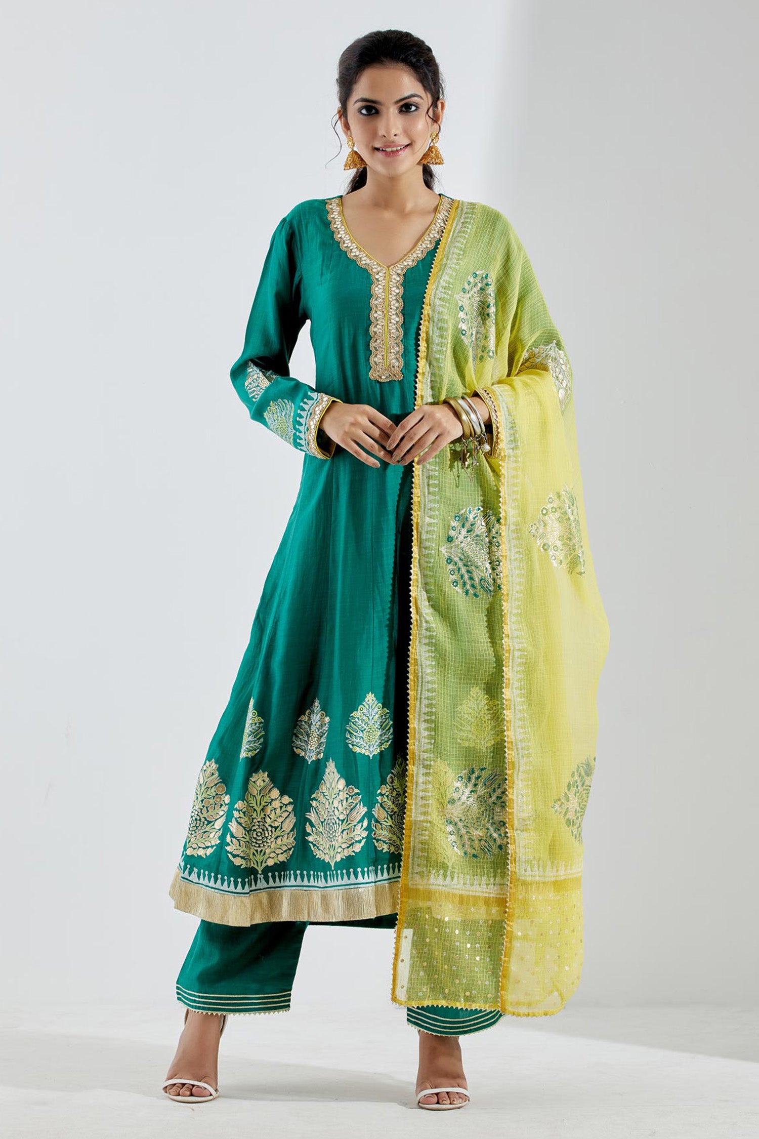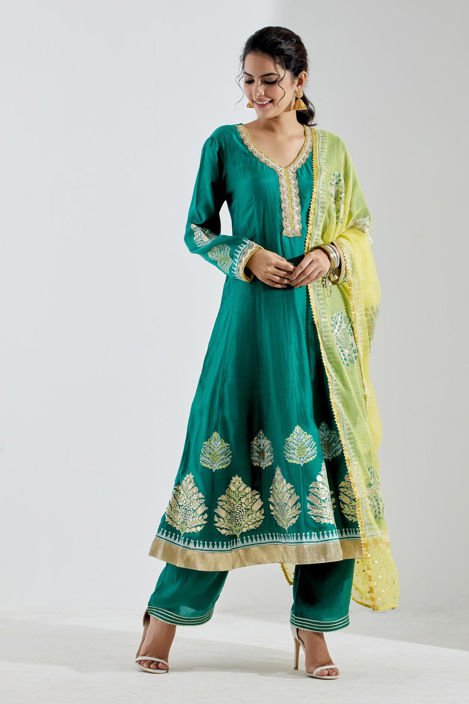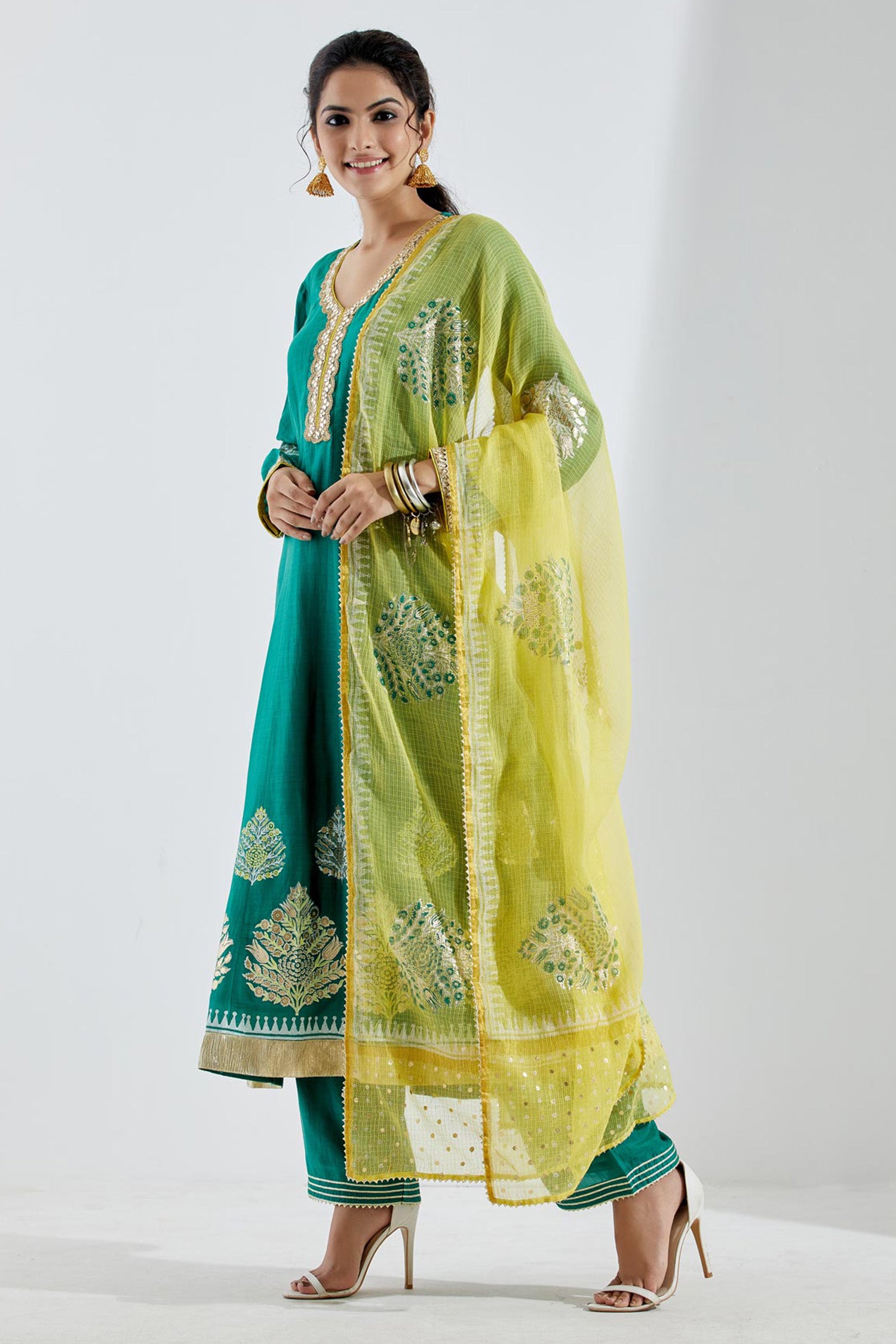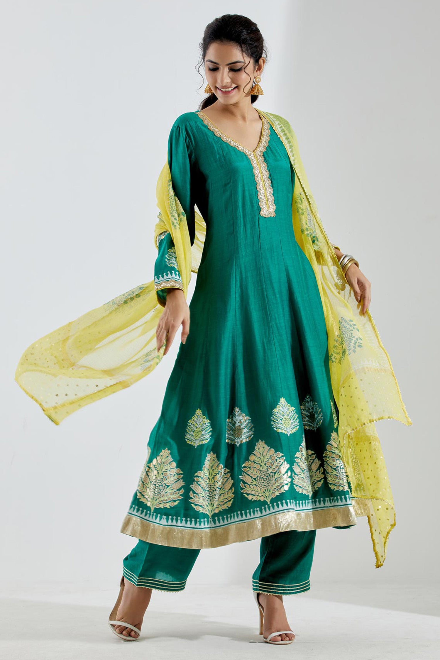 The Dark Green cotton silk anarkali set with subtle golden floral patterns along with the gota patti work with contrasting Yellow dupatta with lace and subtle golden printed design for an charismatic and stand out look.
