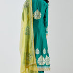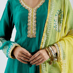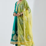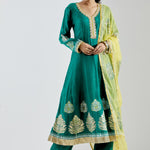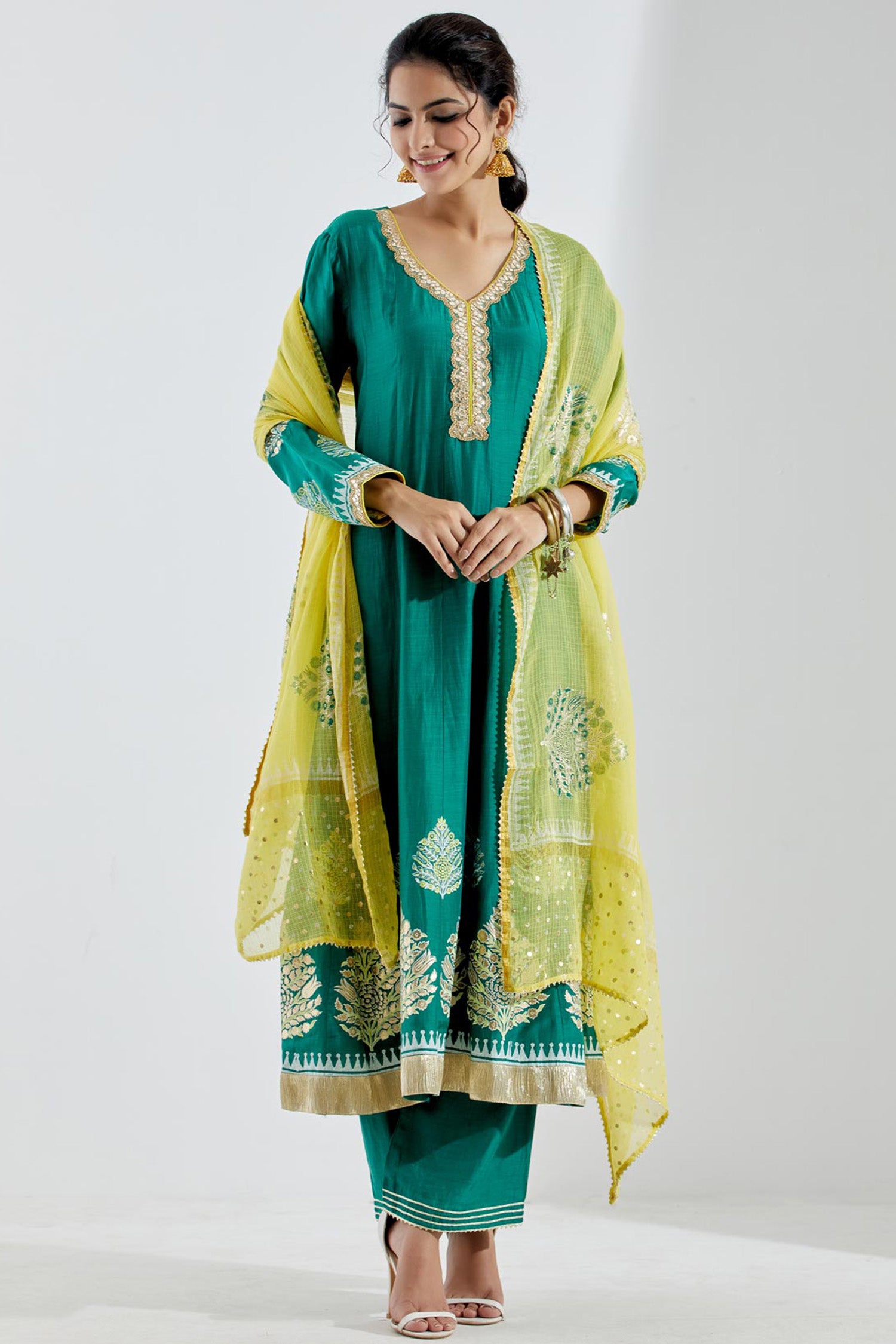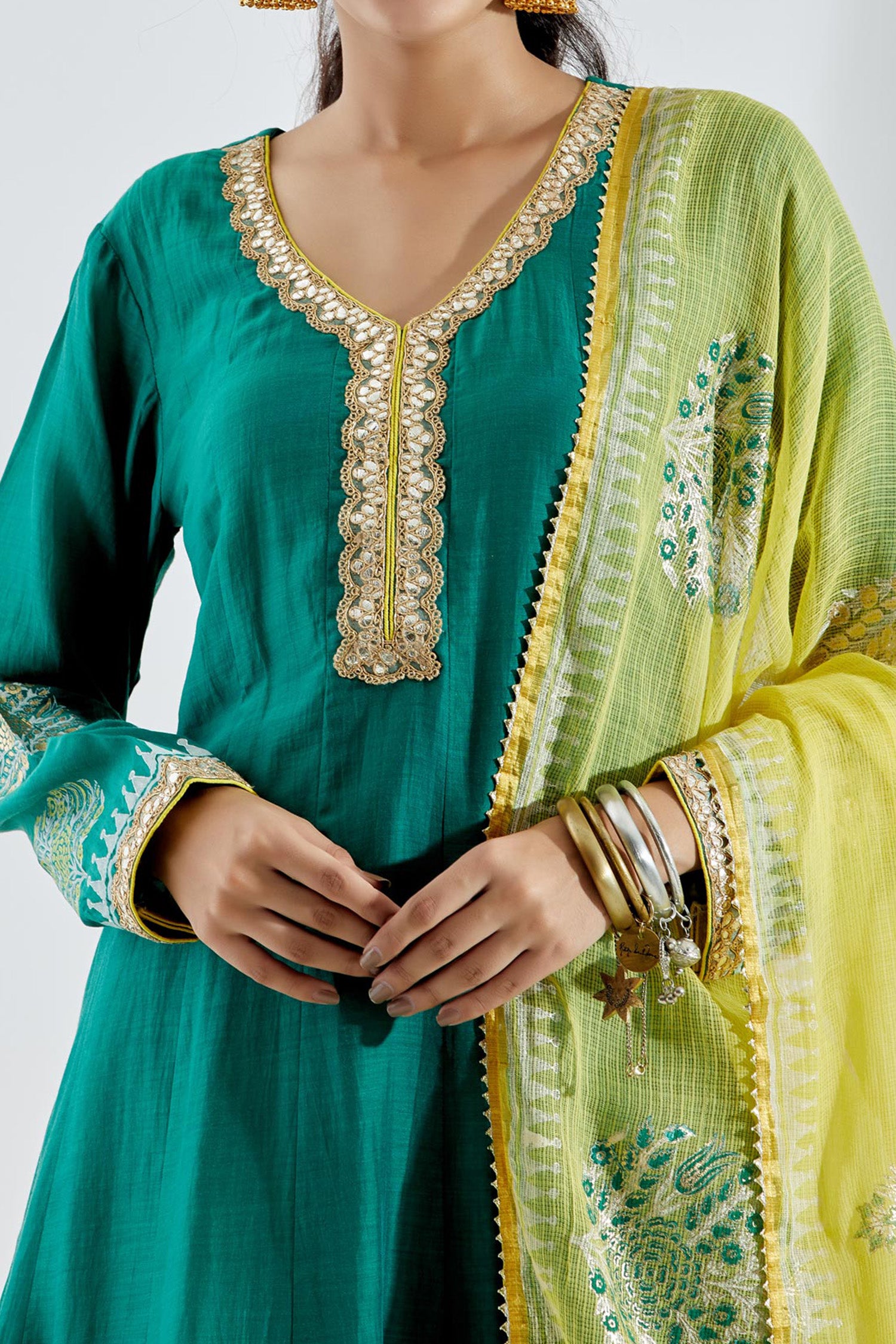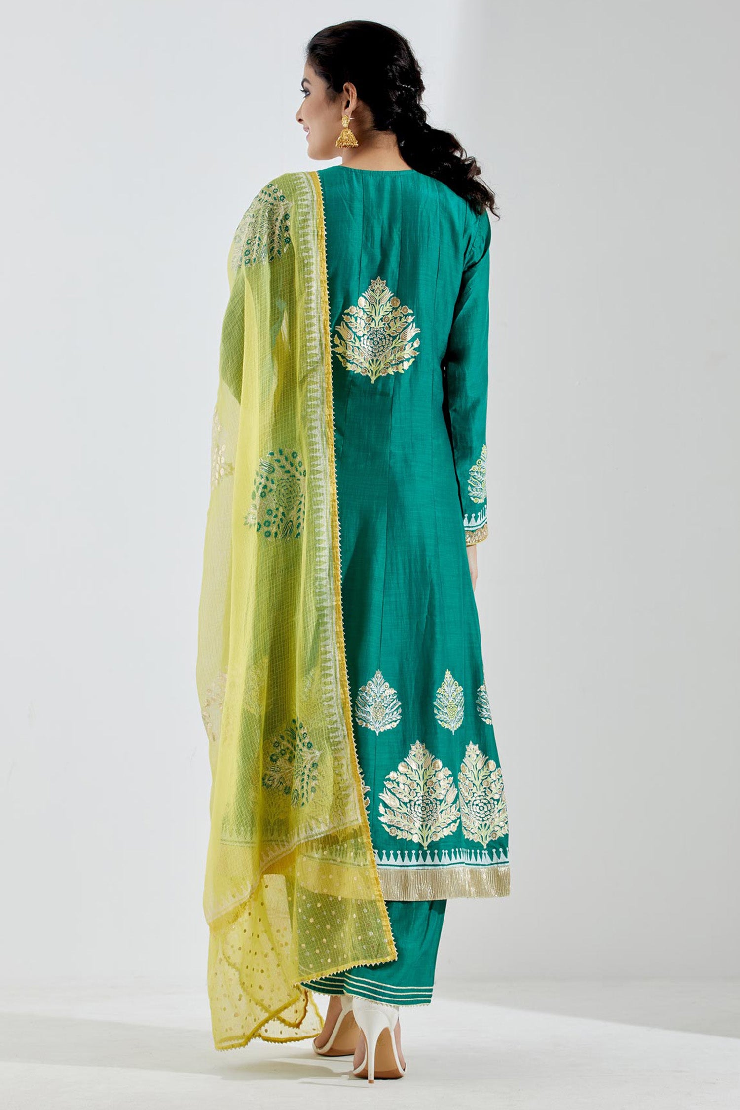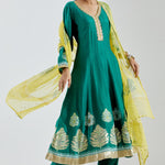 The Dark Green cotton silk anarkali set with subtle golden floral patterns along with the gota patti work with contrasting Yellow dupatta with lace and subtle golden printed design for an charismatic and stand out look.