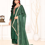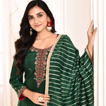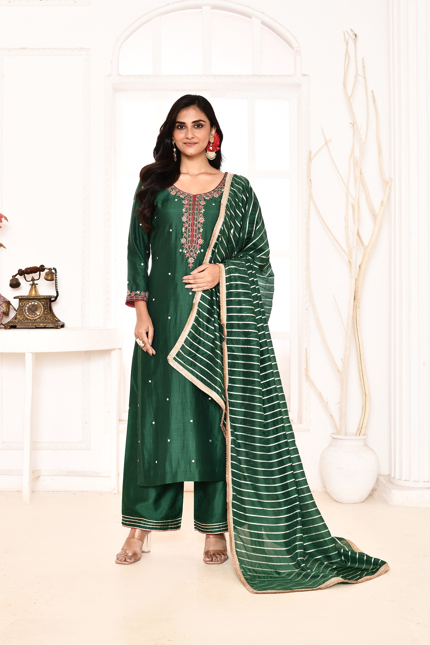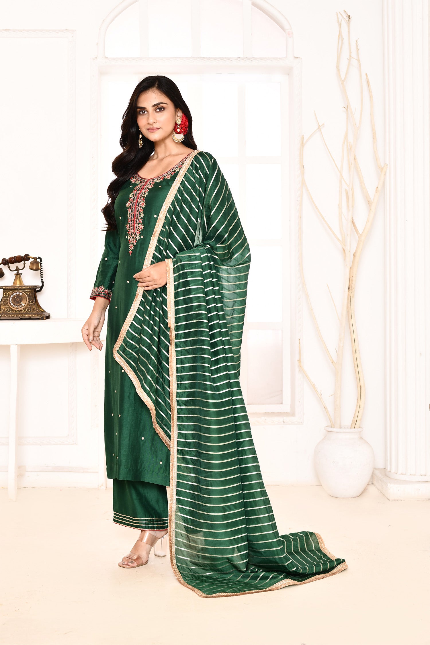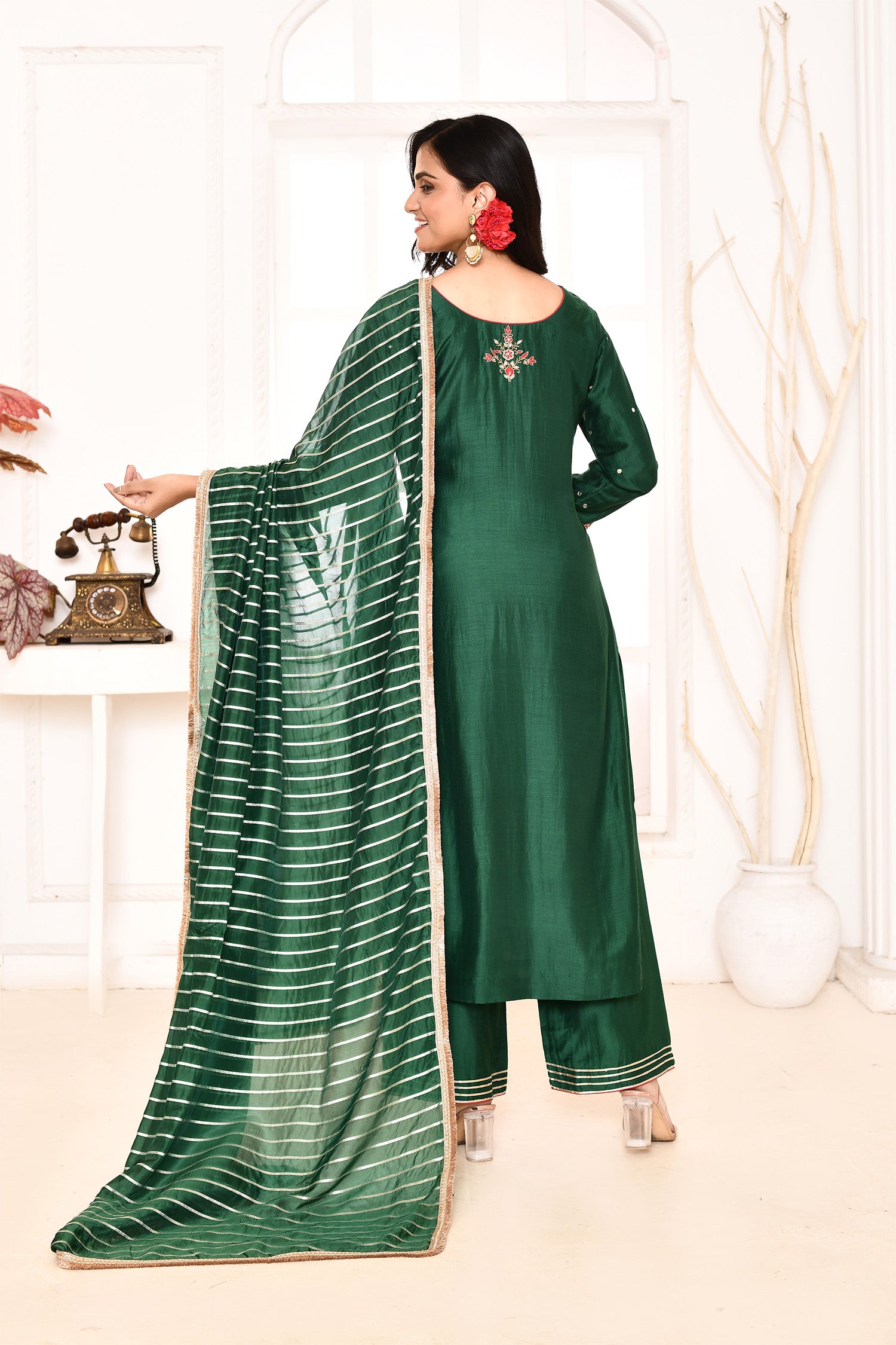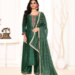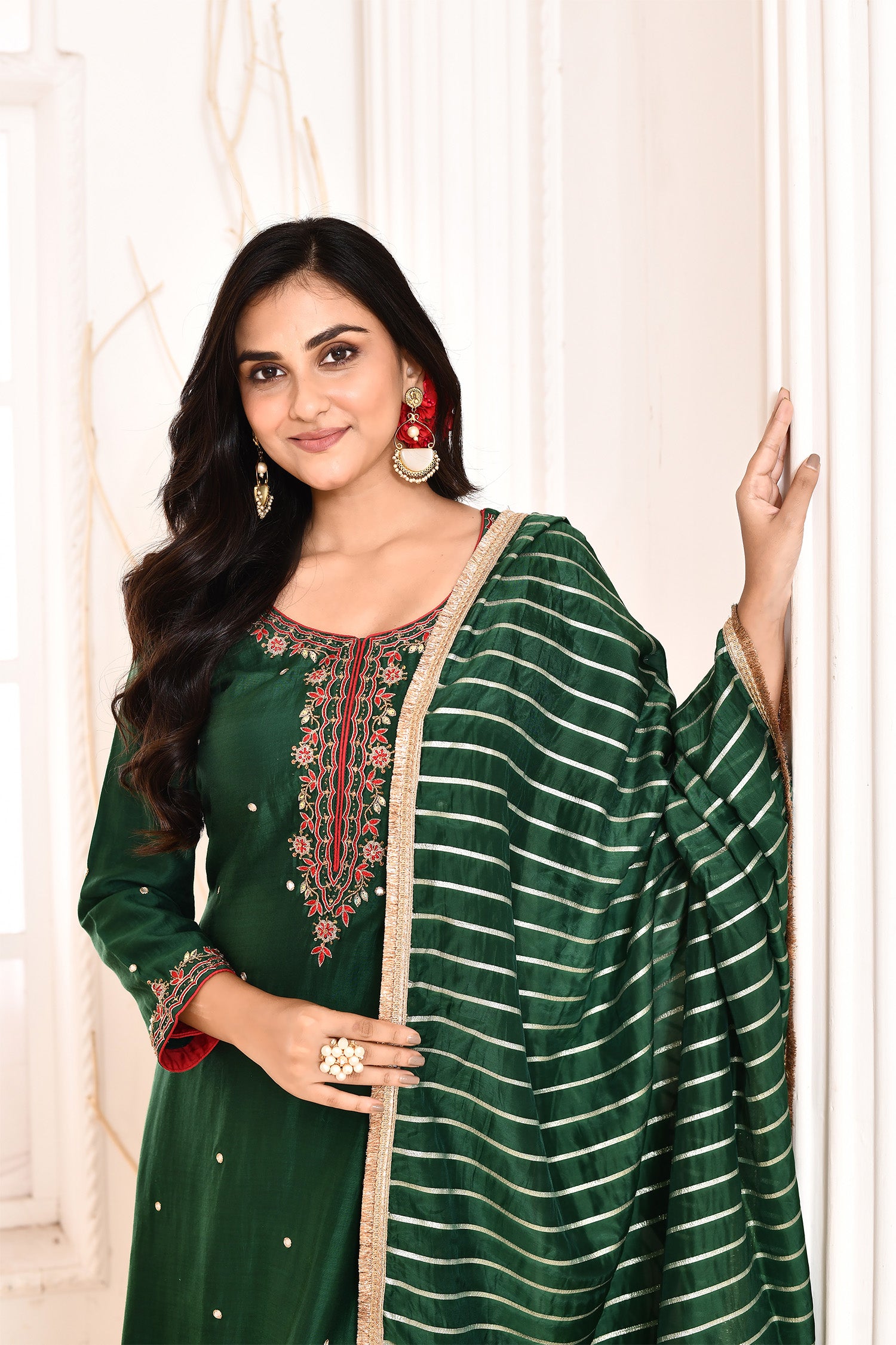 Dark Green Embroidered Straight Kurta And Palazzo With Dark Green Scalping Dupatta