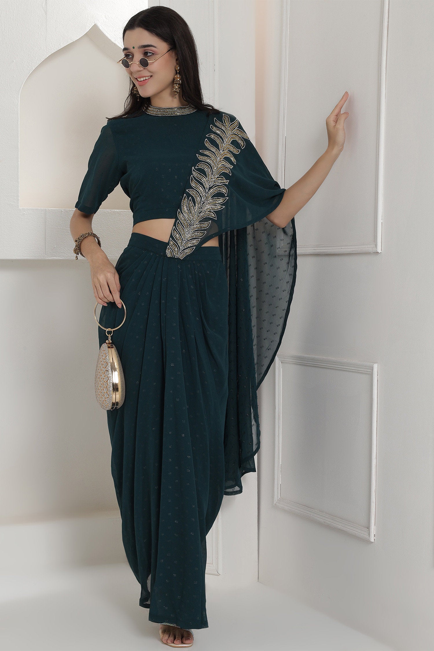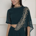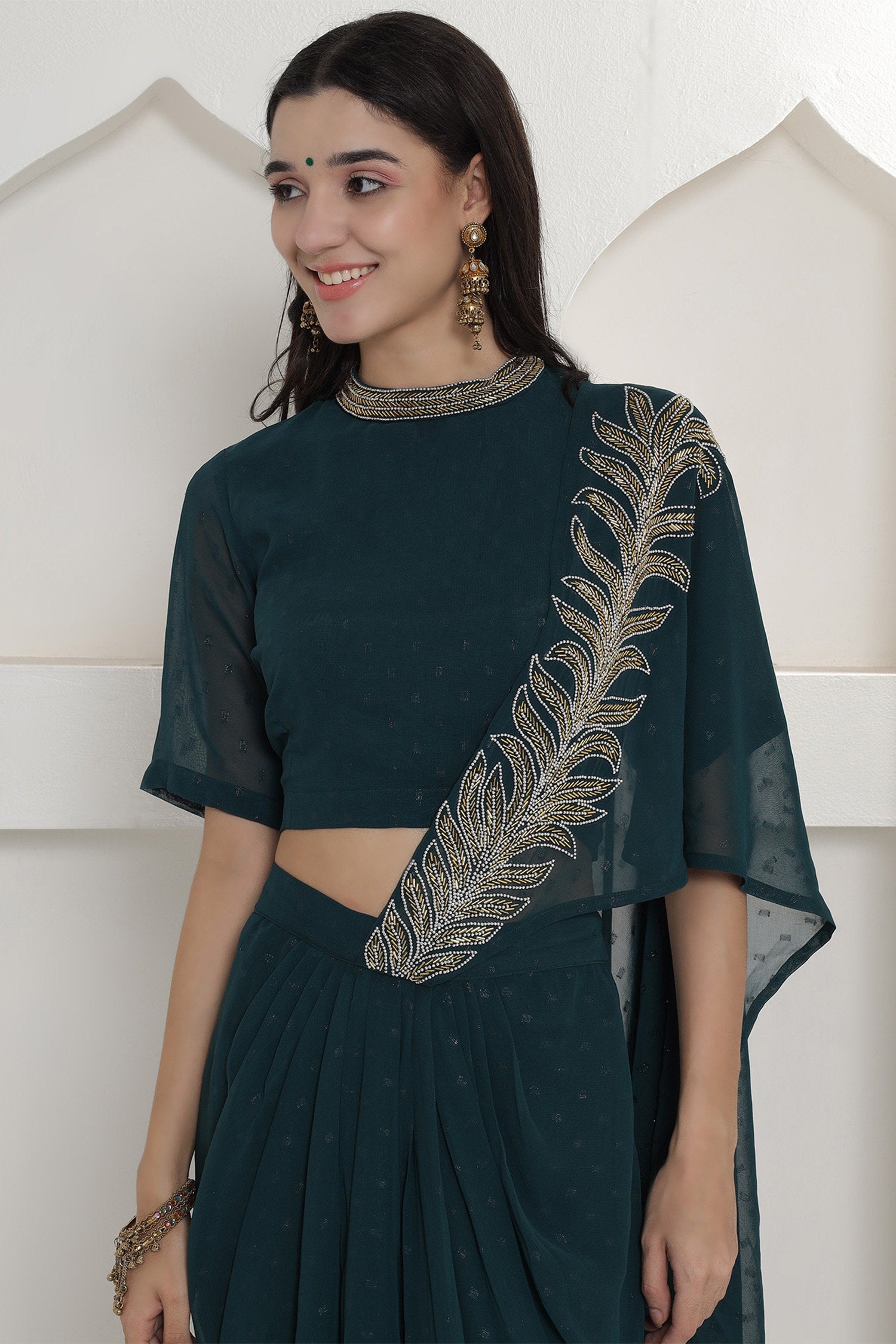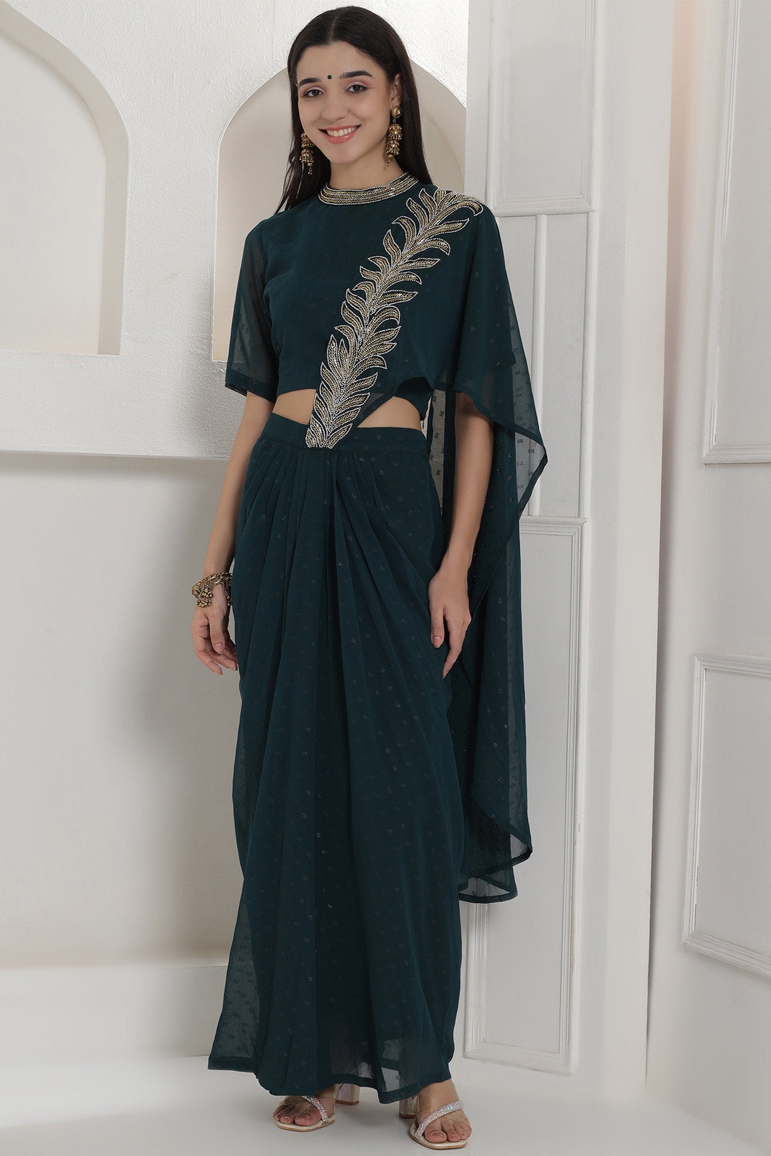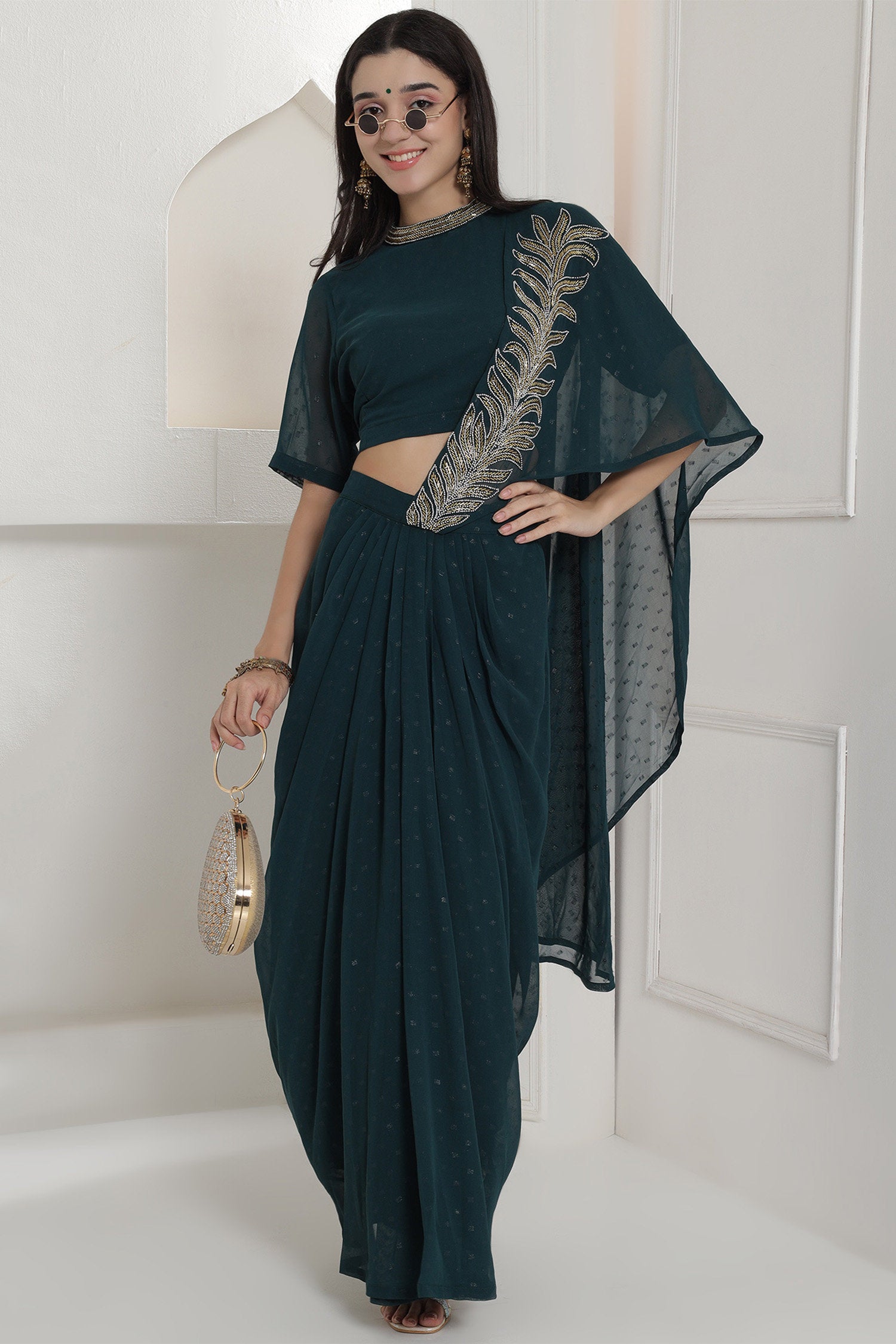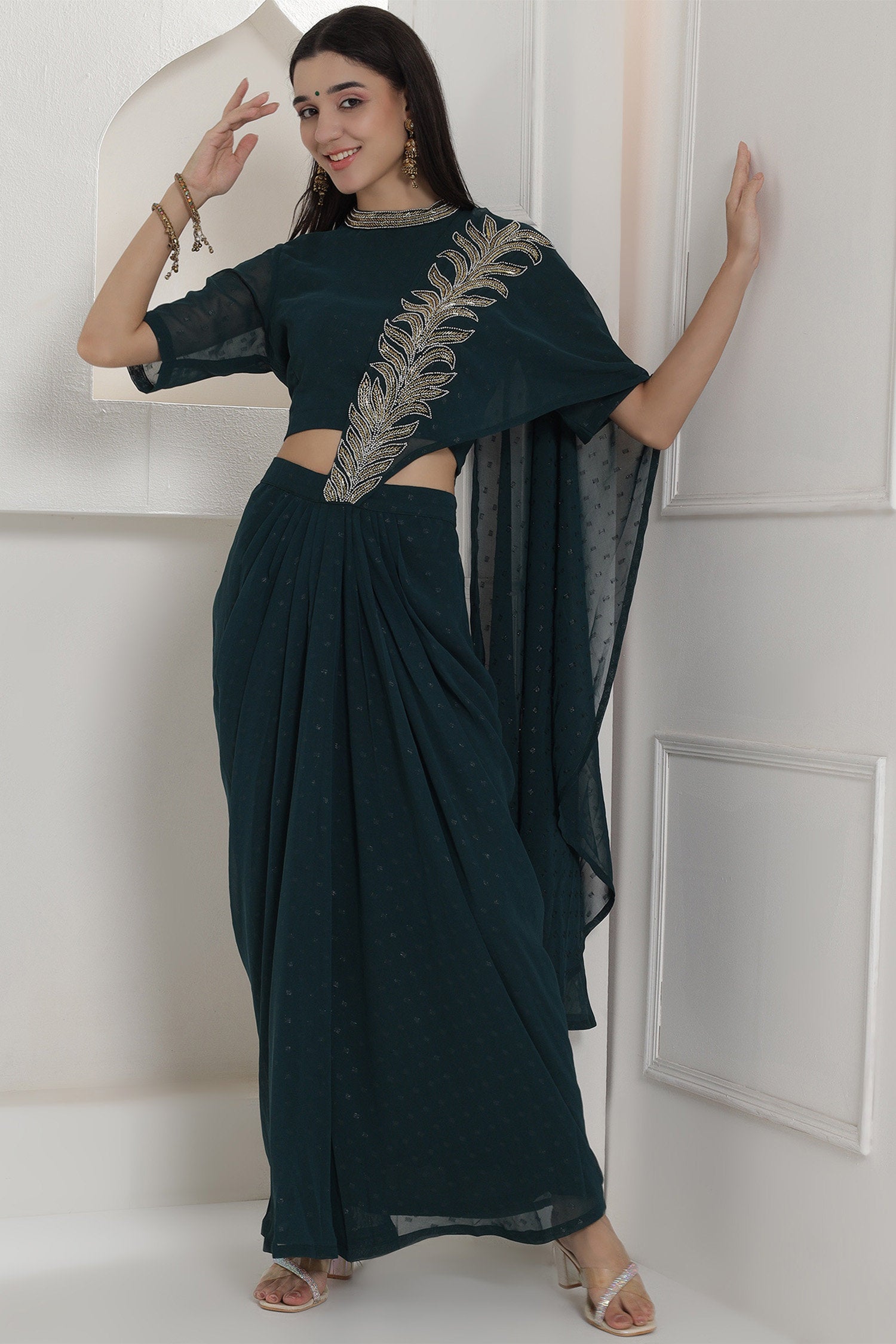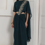 This green georgette cape inner and dhoti set is beautifully adorned with the hand embellishment .Top has turtleneck and paired with the dhoti as a bottom which makes it perfect for special events and for holidays.