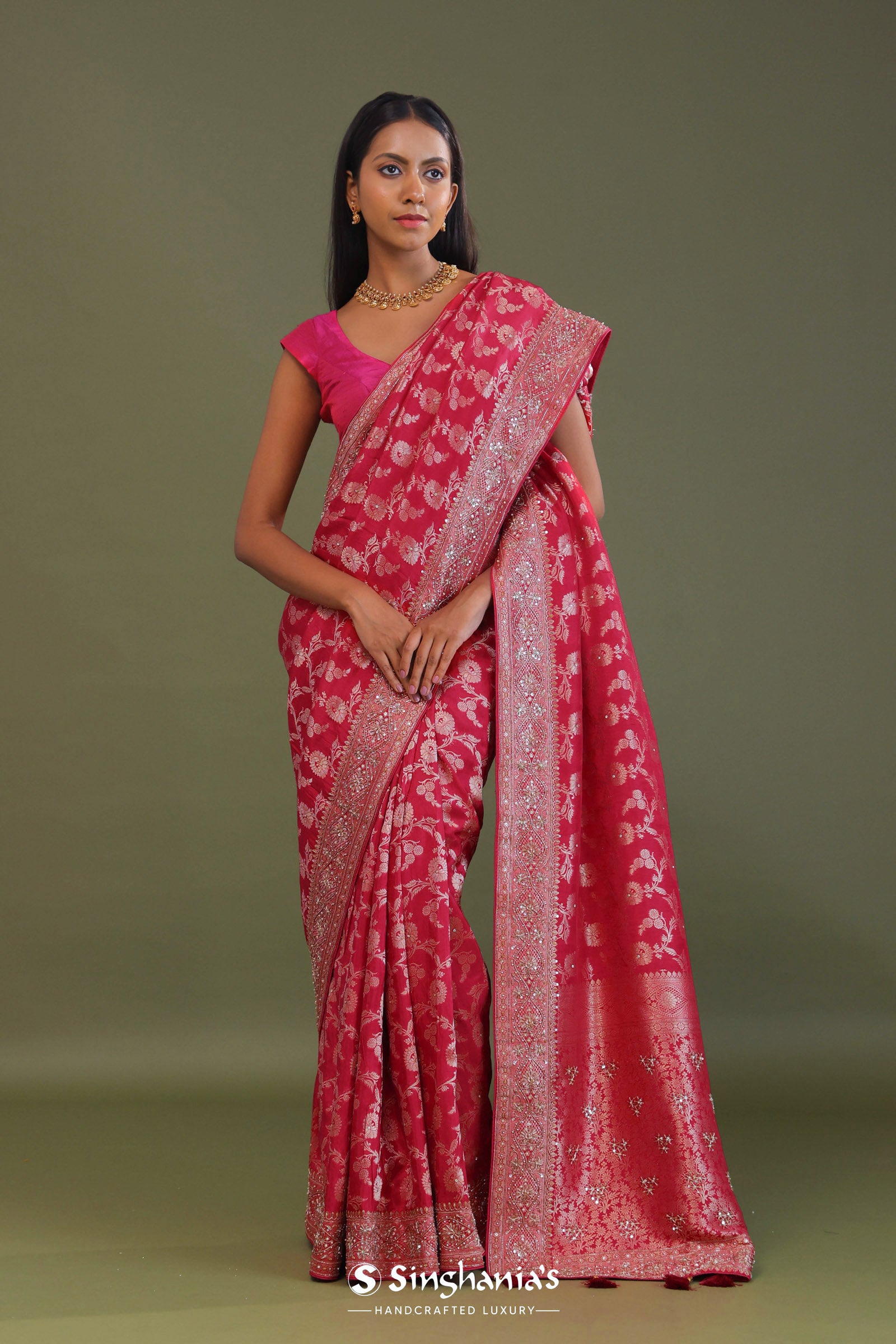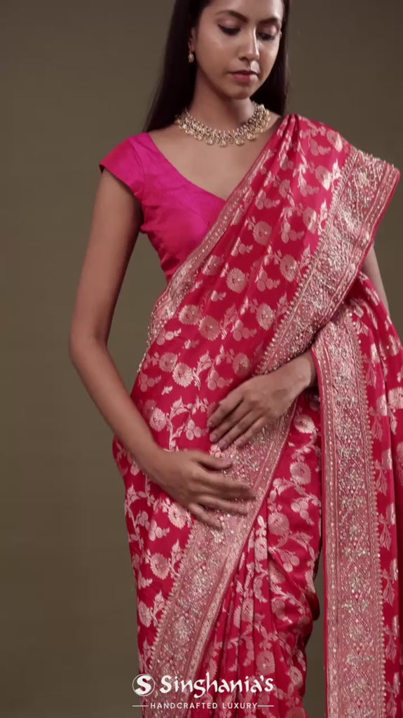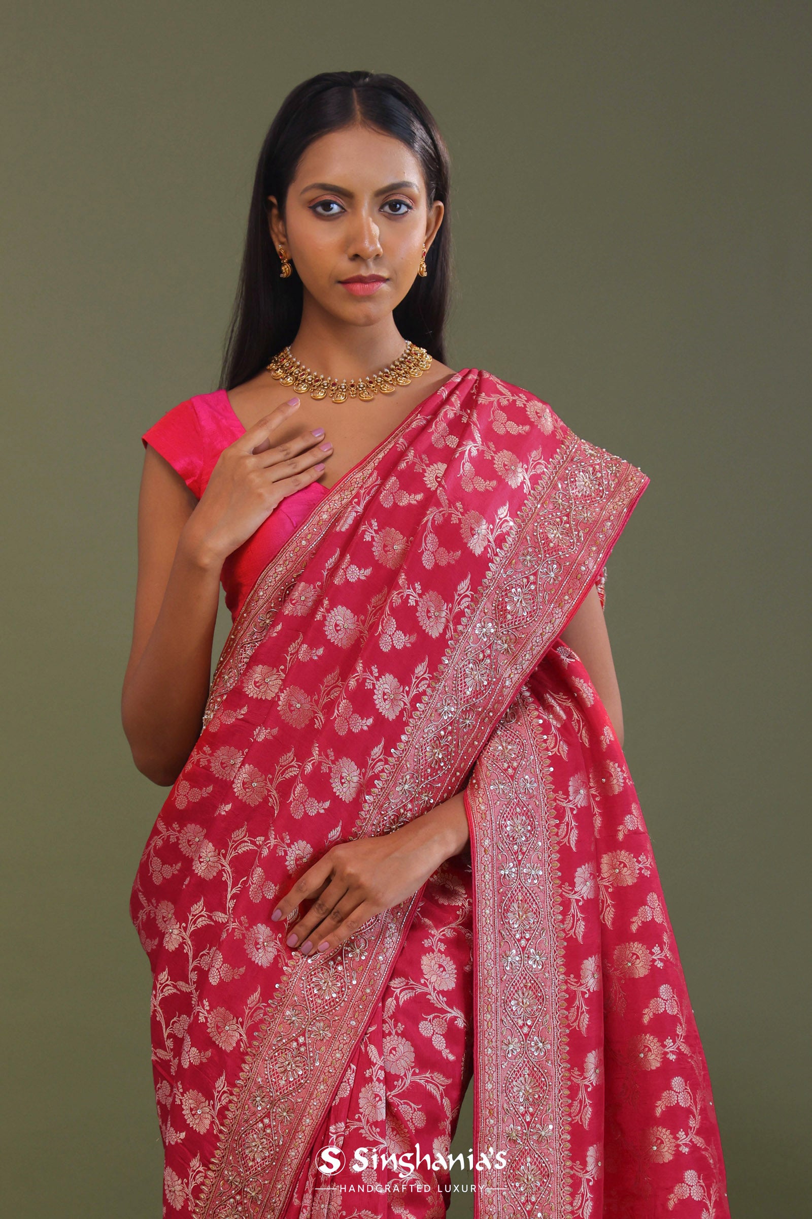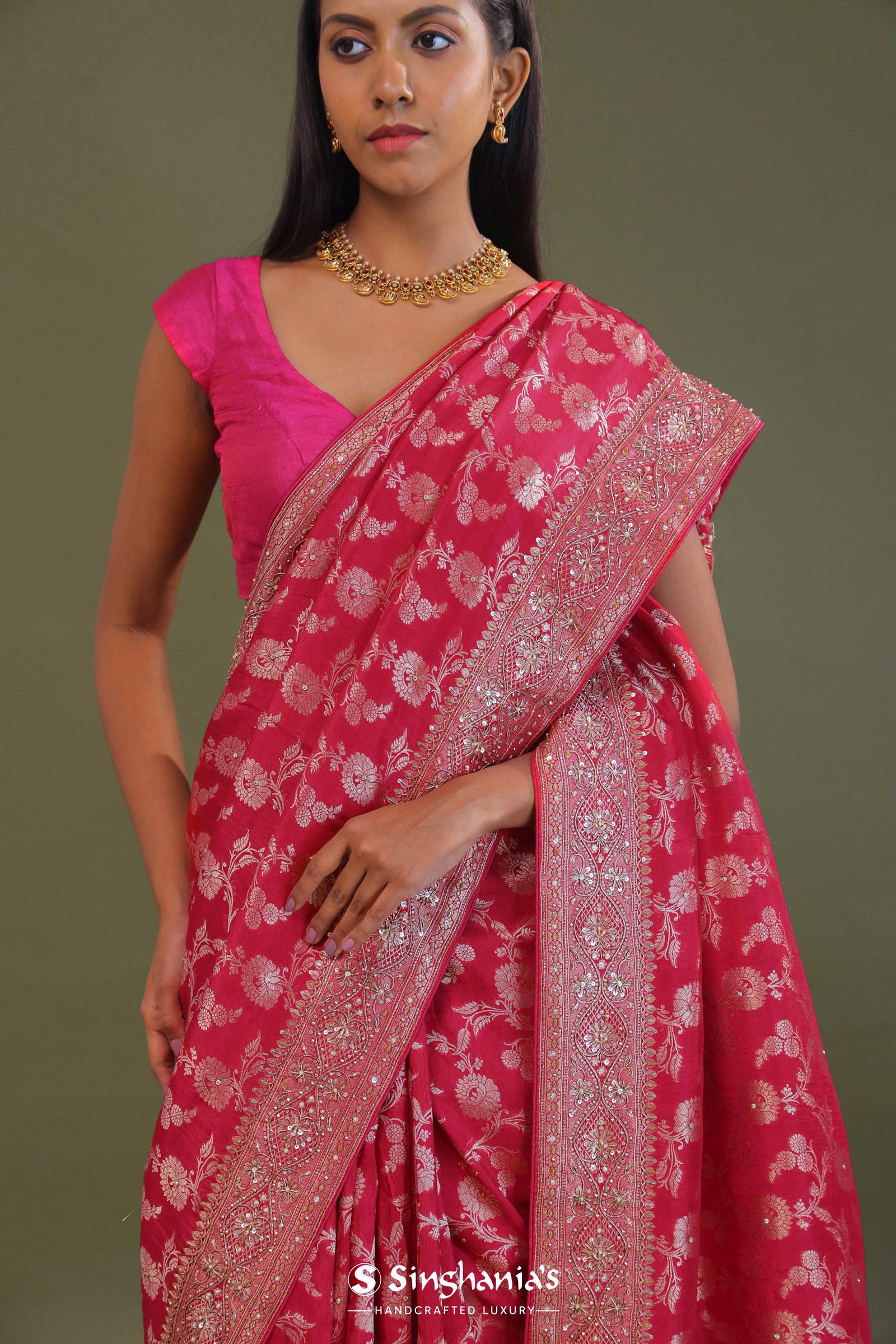 Dark Hot Pink Banarasi Embroidery Saree With Gold Zari Border