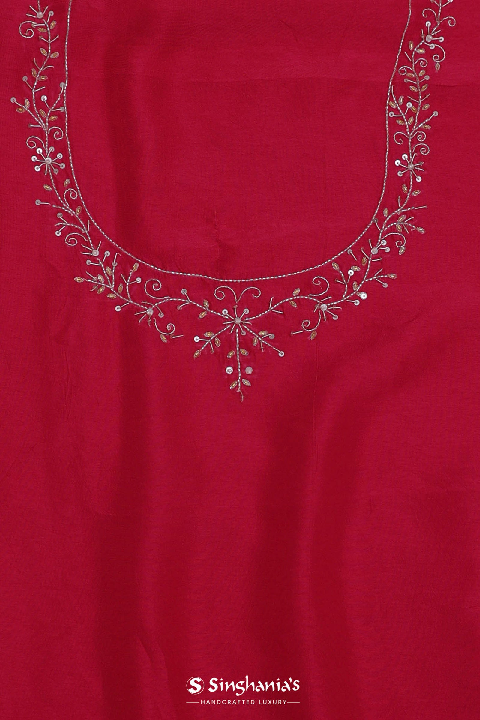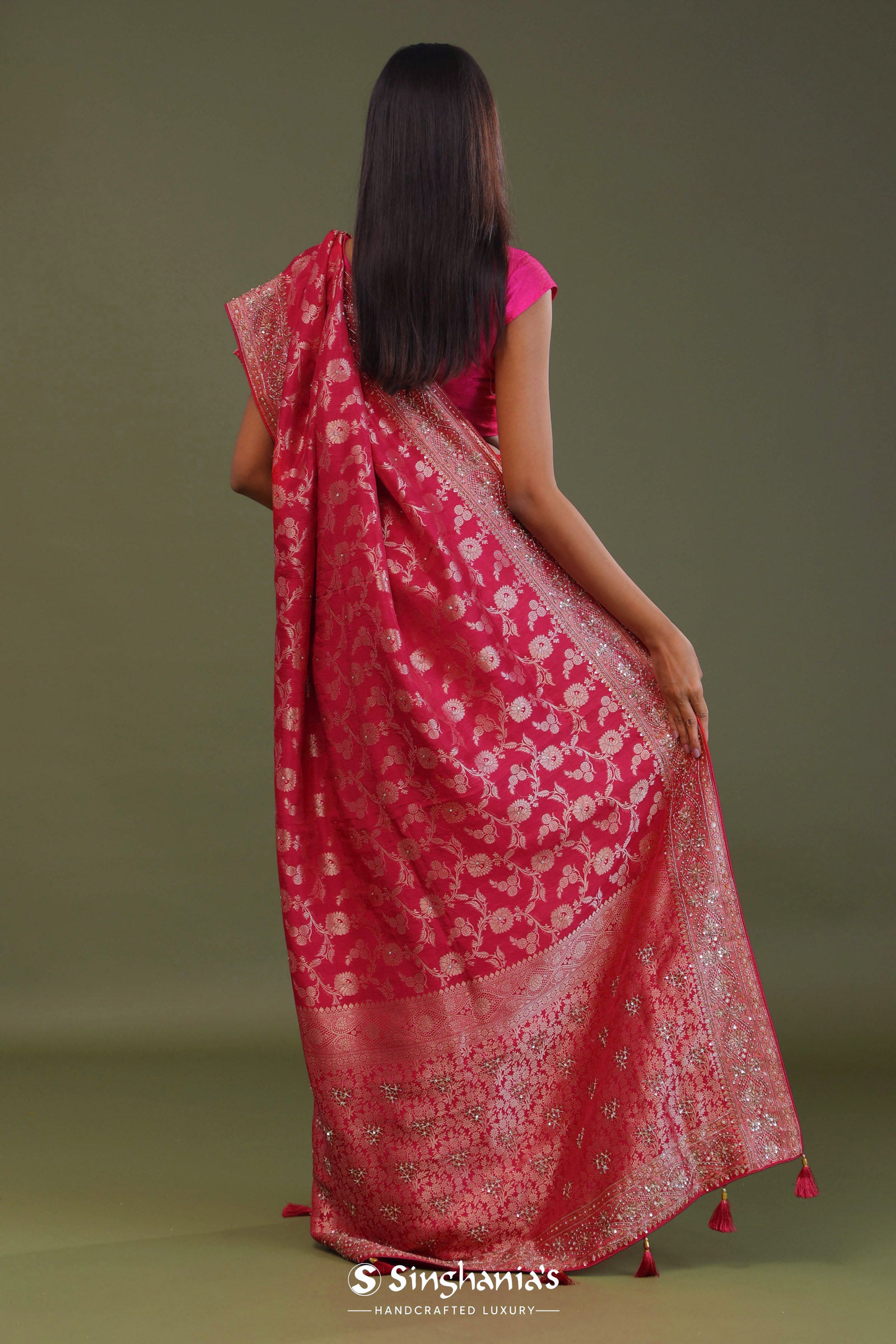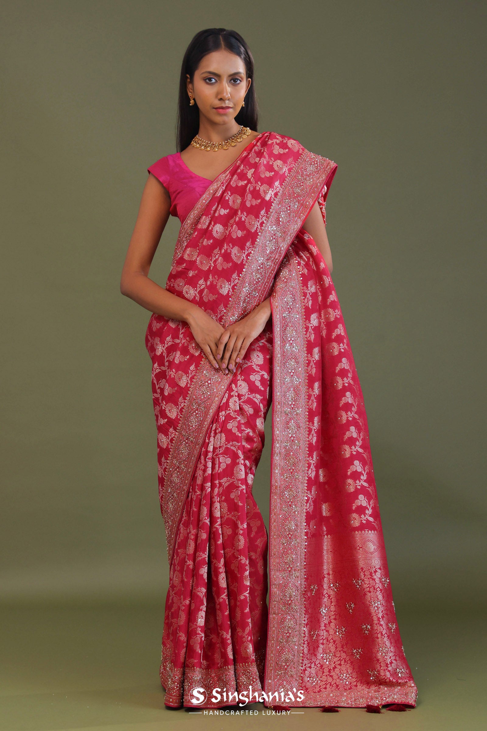 Dark Hot Pink Banarasi Embroidery Saree With Gold Zari Border