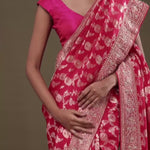 A striking fusion of elegance and tradition, this dark hot pink banarasi saree has elaborate gold zari embroidery all over the body. A regal touch is added by the beautiful gold zari border, which goes well with the striking pink color.
