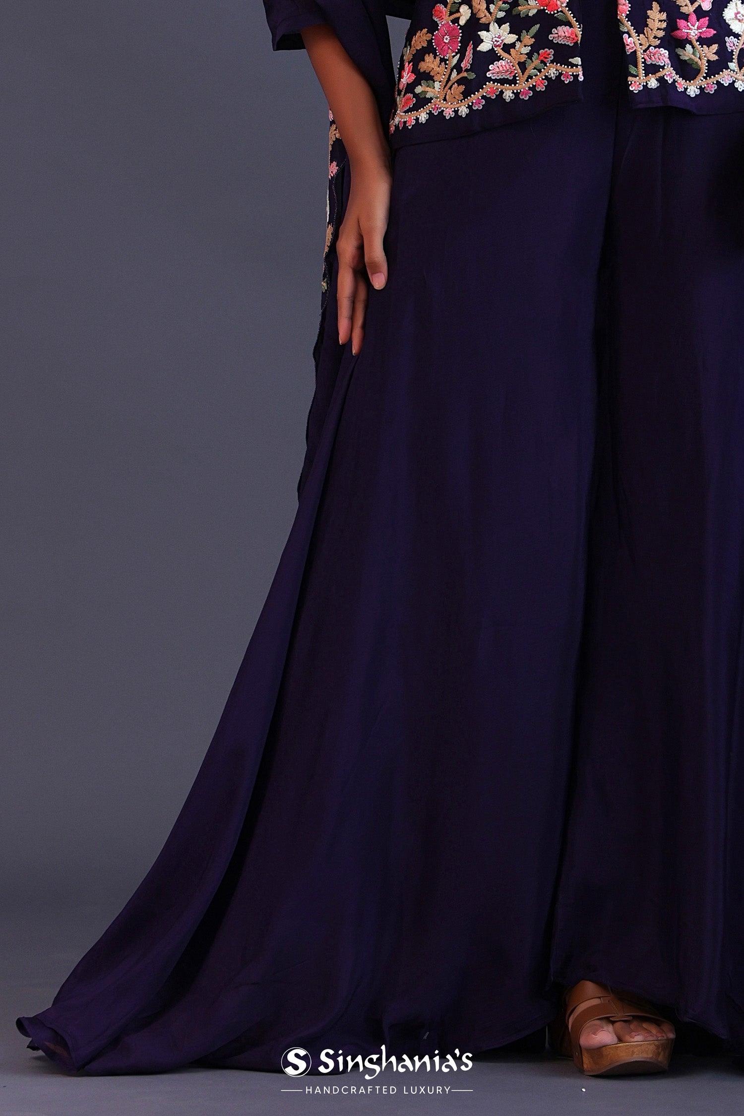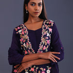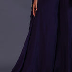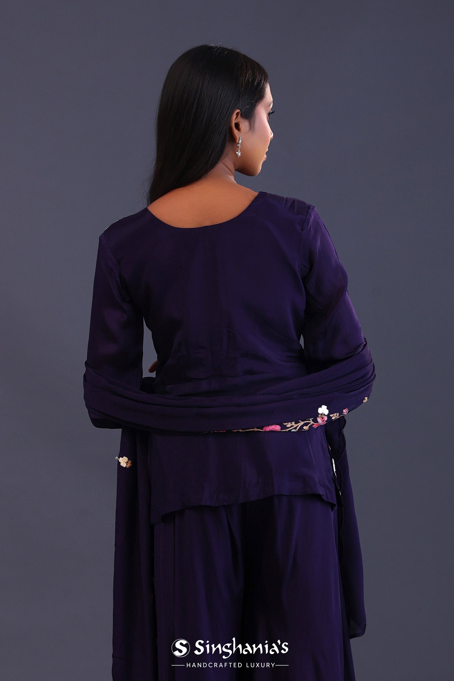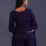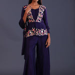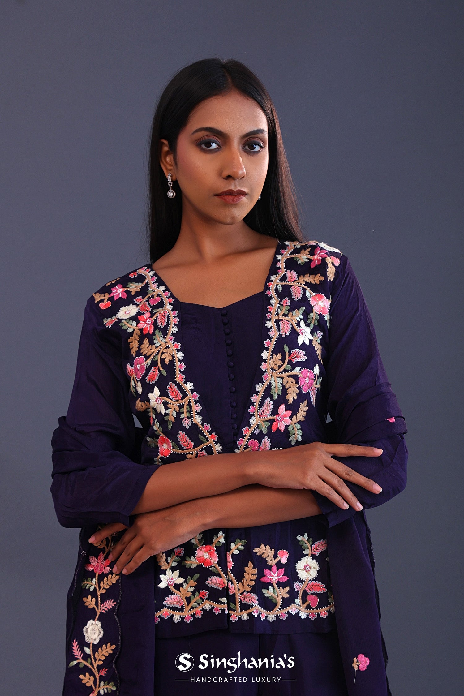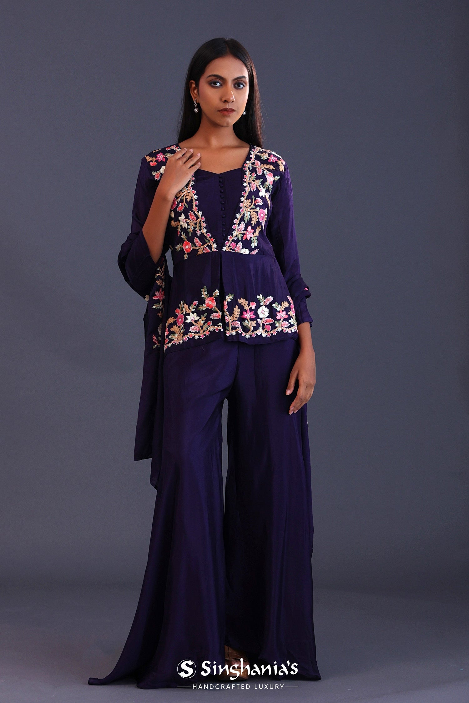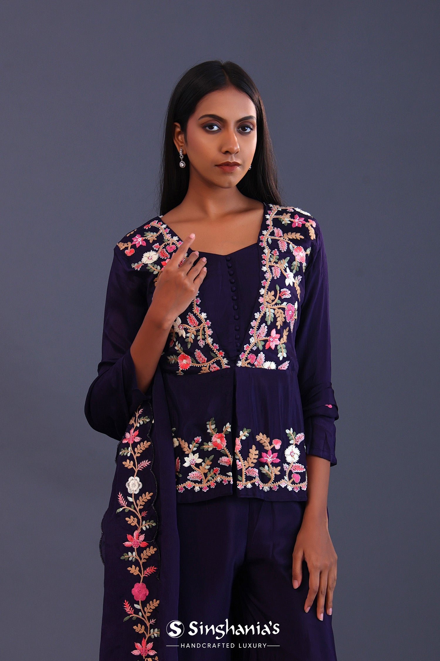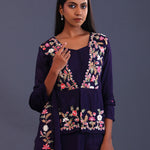 The dark indigo georgette indo western peplum set with thread work and matching dupatta for a stylish and comfortable fit with cracious look.
