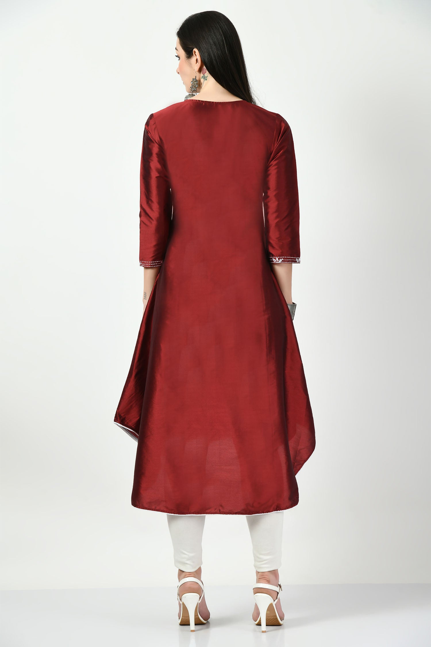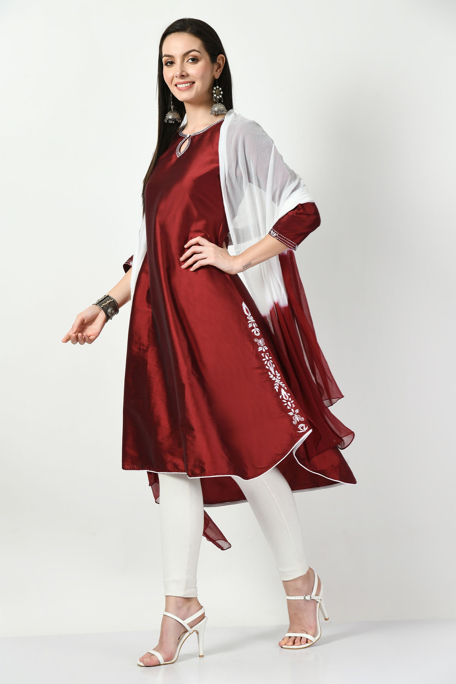 The dark maroon solid kurti with subtle embroidery along with pant and dupatta for a neat and elegant look that combines trendy comfort with tradition in a classy appearance.