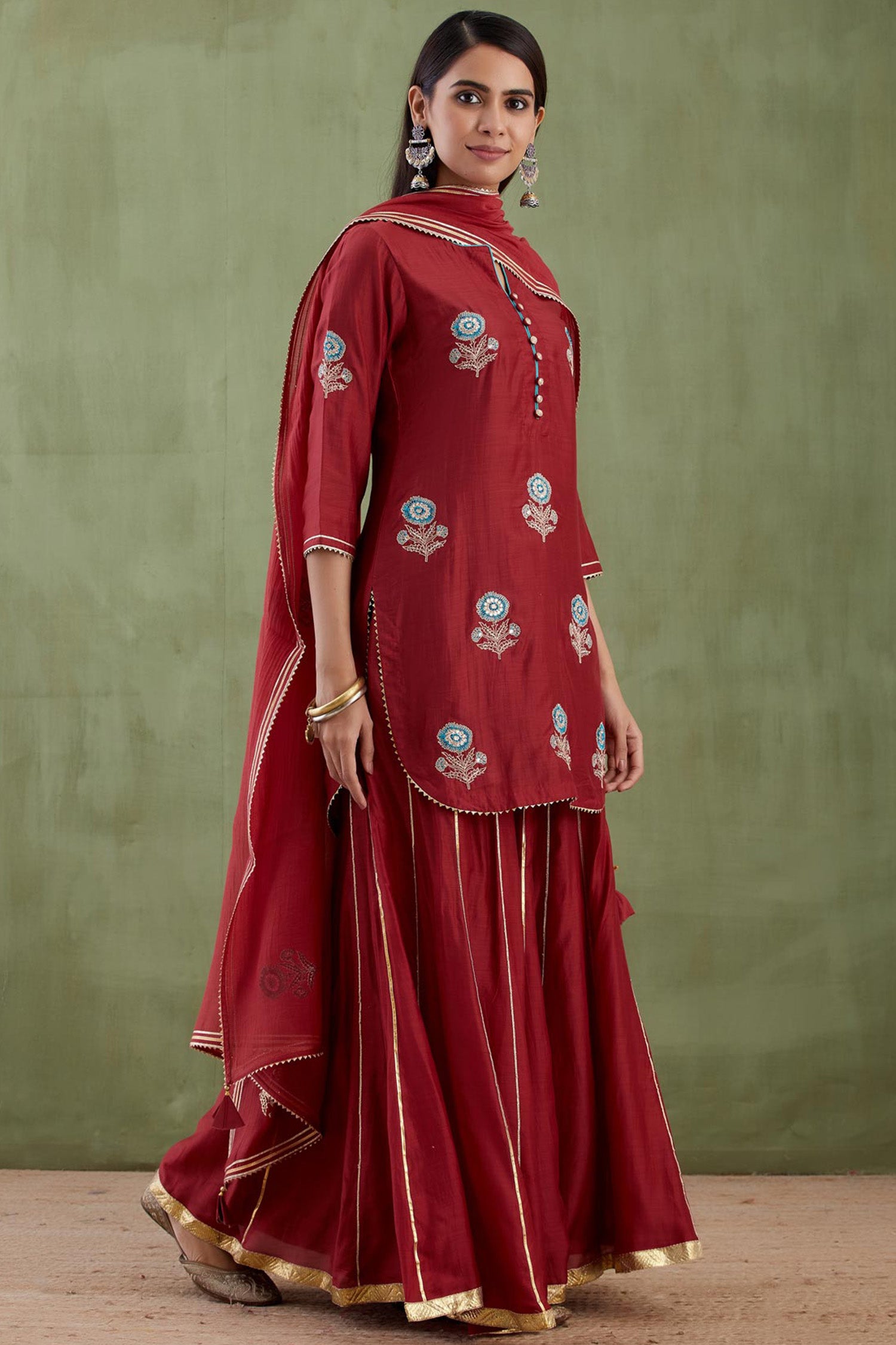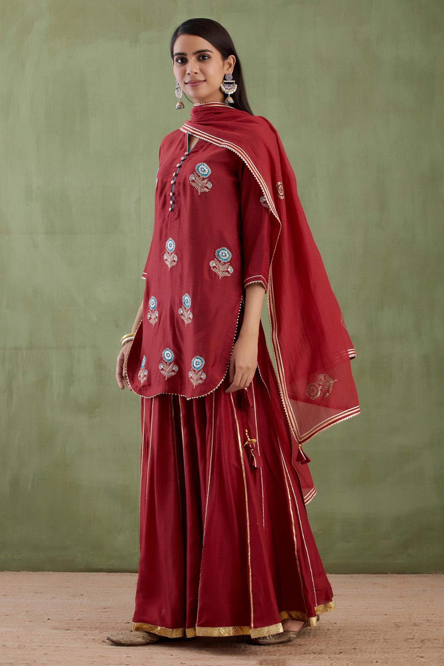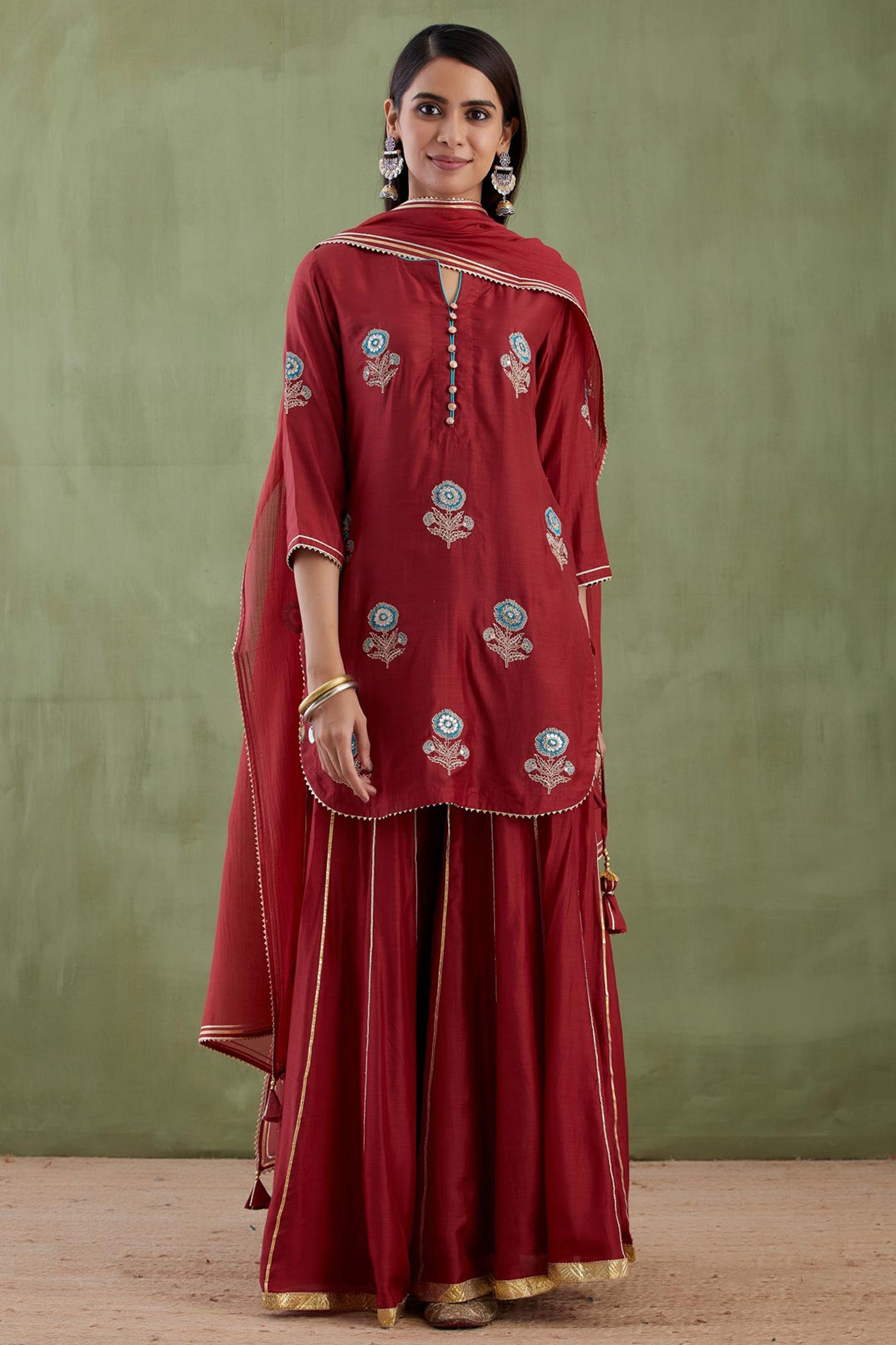 The elegant dark maroon cotton silk kurta sharara set featuring delicate foil print floral embroidery with the short kurta with matching pants and dupatta gives a luxurious and timeless look.