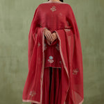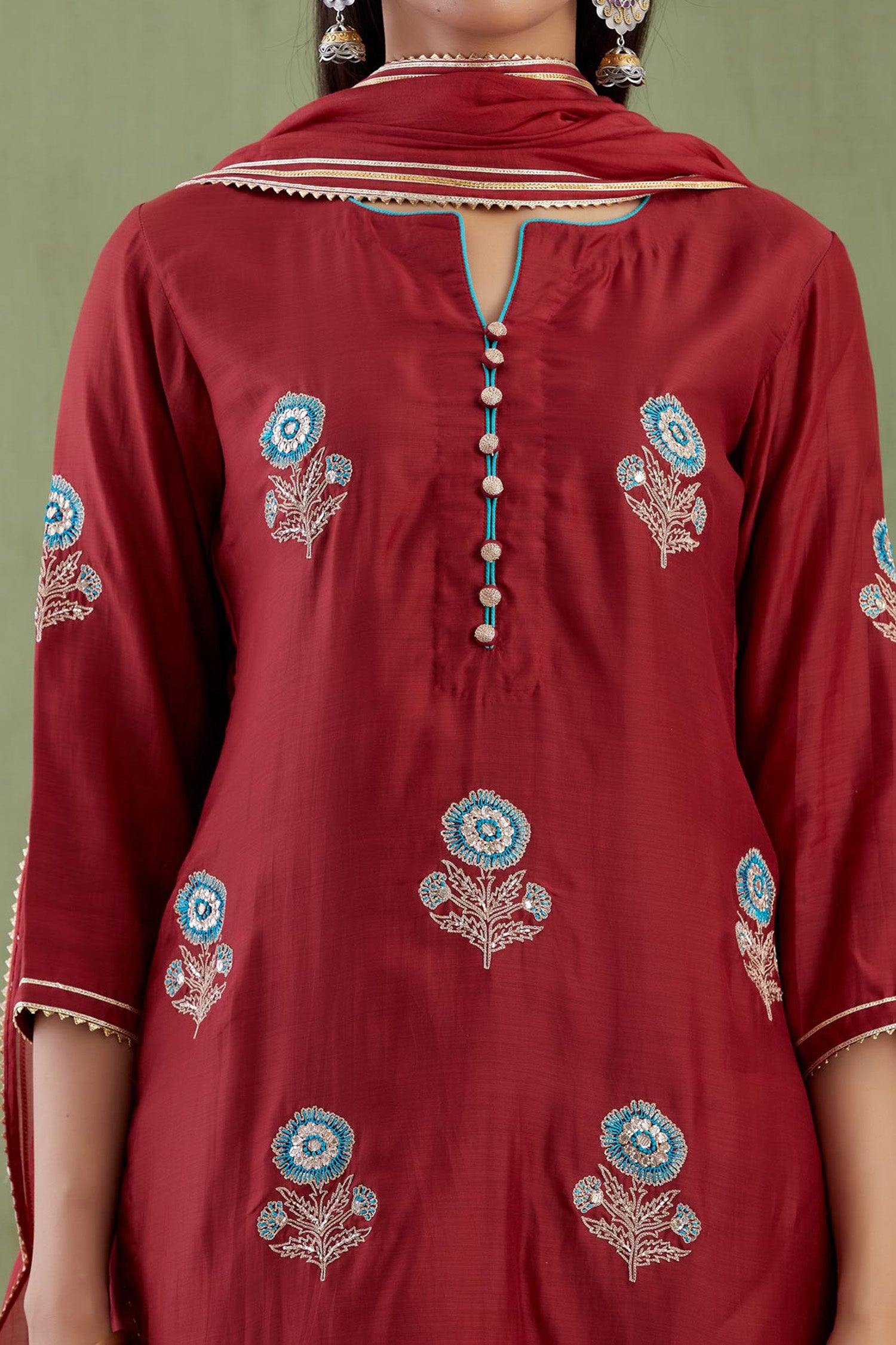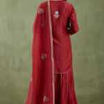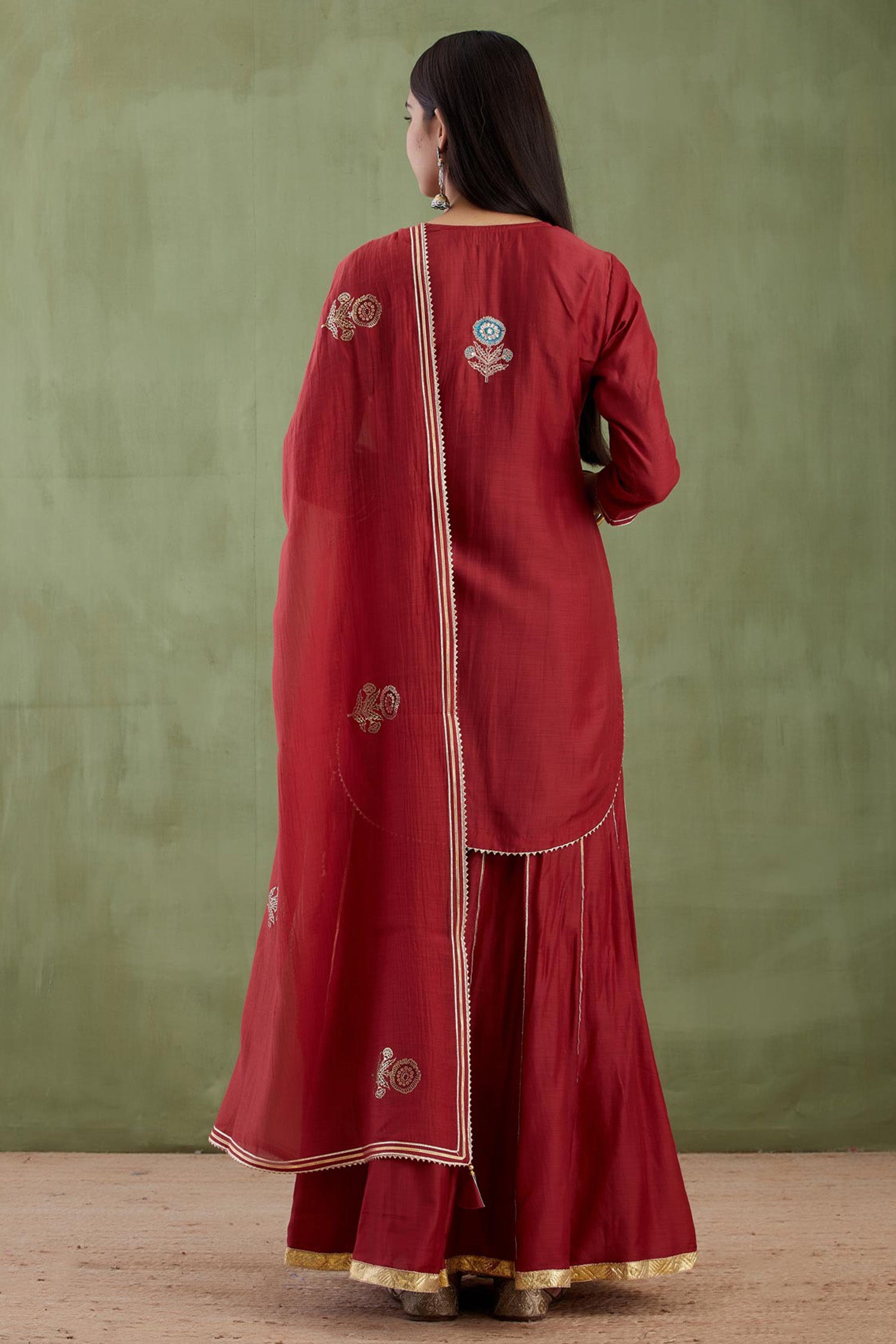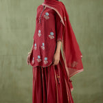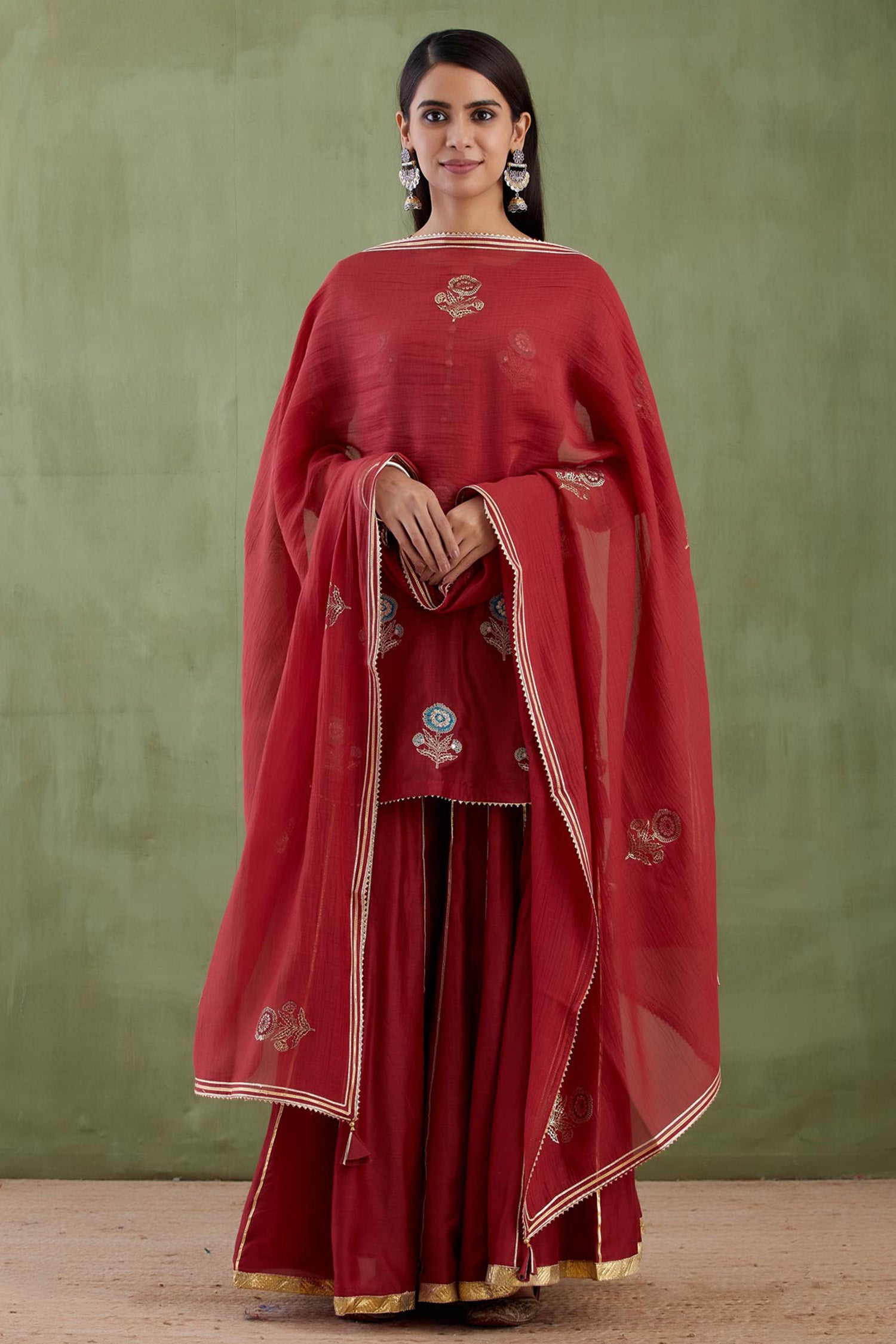 The elegant dark maroon cotton silk kurta sharara set featuring delicate foil print floral embroidery with the short kurta with matching pants and dupatta gives a luxurious and timeless look.