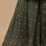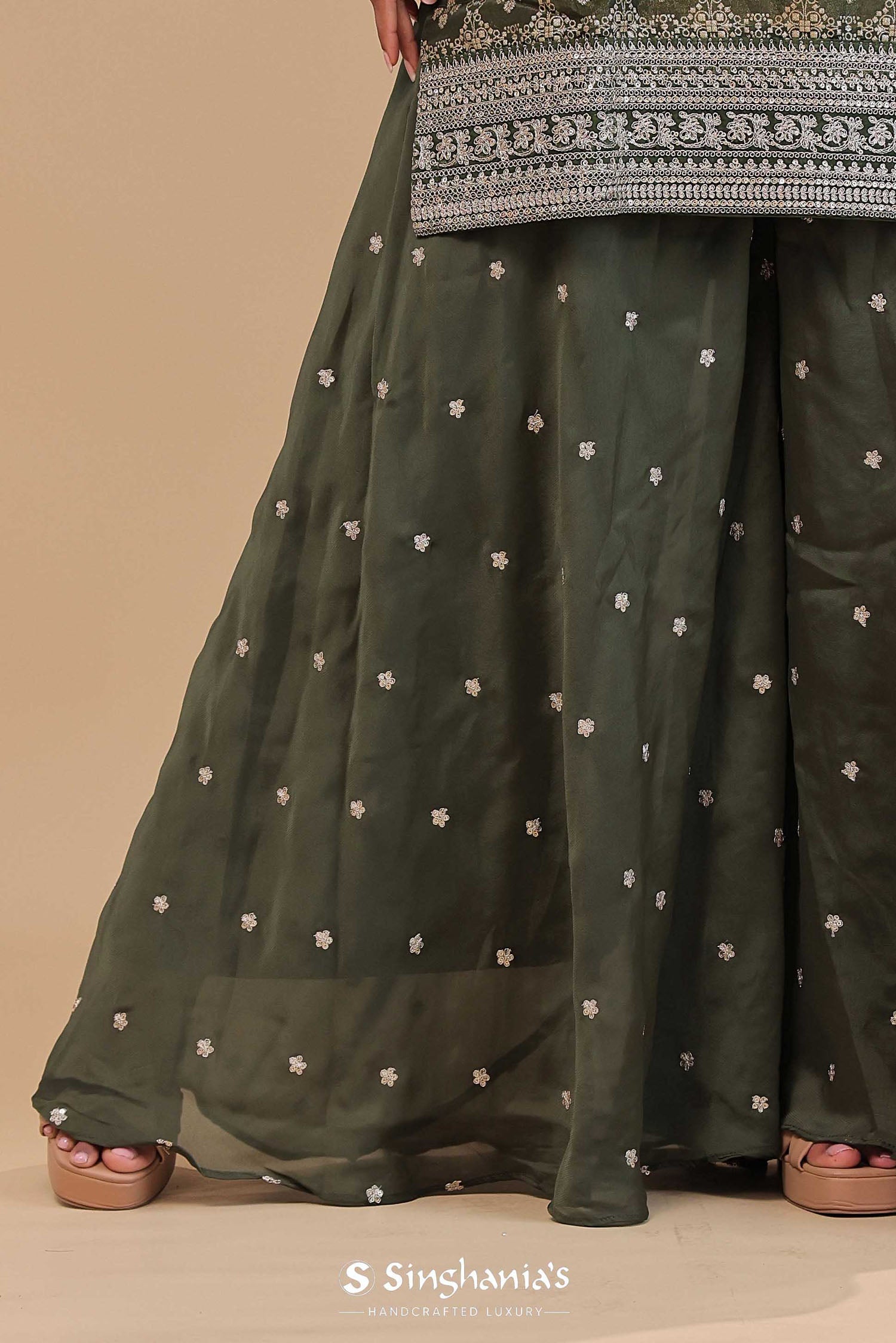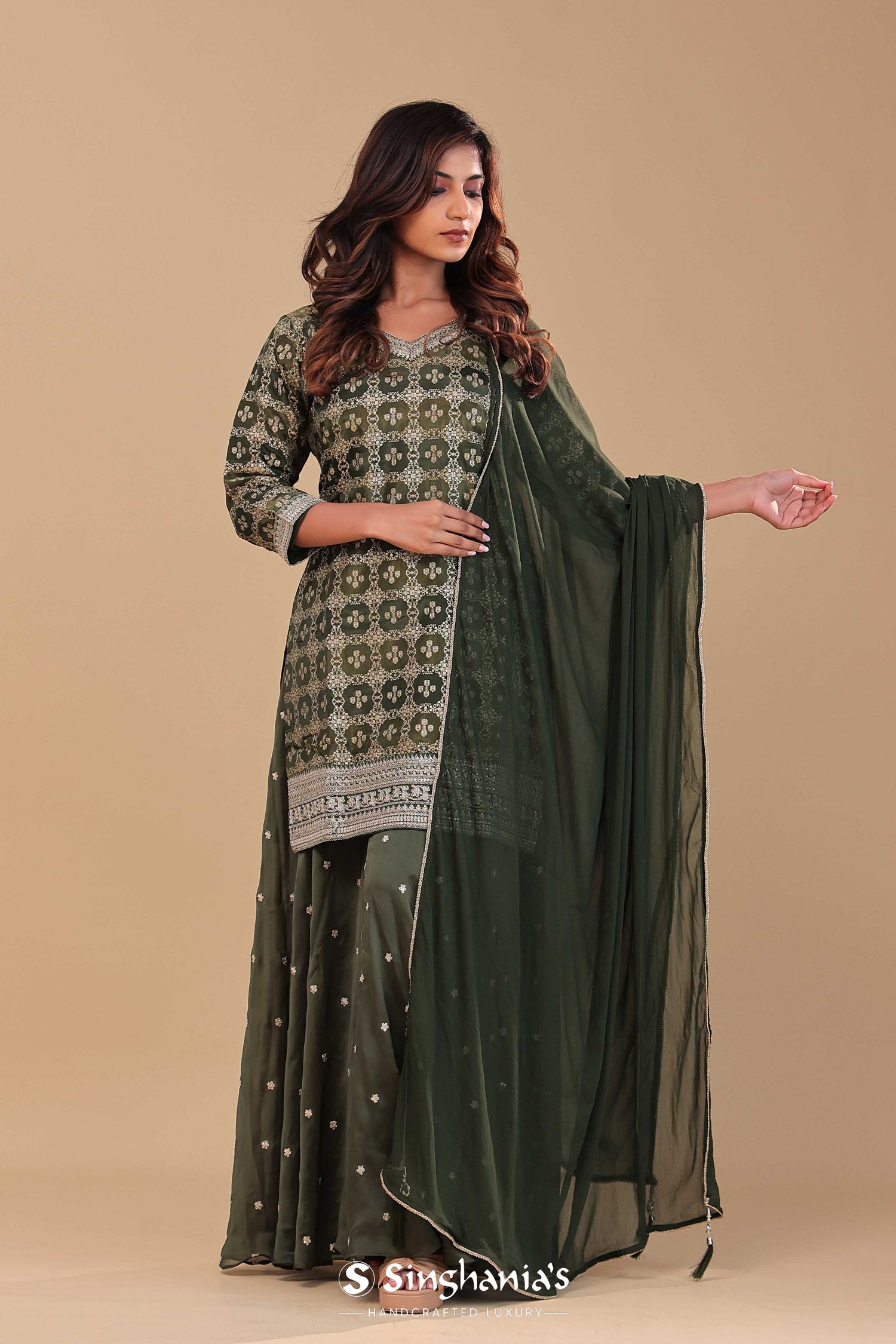 Dark mahendi kurta set features top banarasi kurta with self border along with georgette plain dupatta.The georgette palazzo pants with butti's formed by embroidery making it look perfect for any traditional occasions