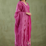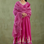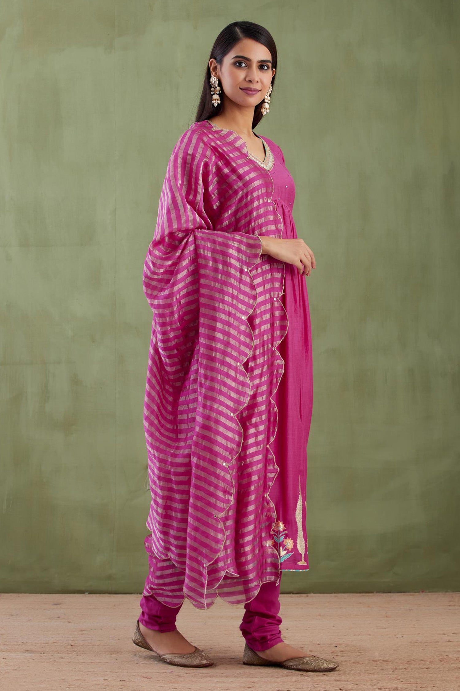 The dark pink cotton silk foil printed anarkali suit set with matching pant and striped dupatta for the on to go stylish and comfortable look with classy and elegant appearance.