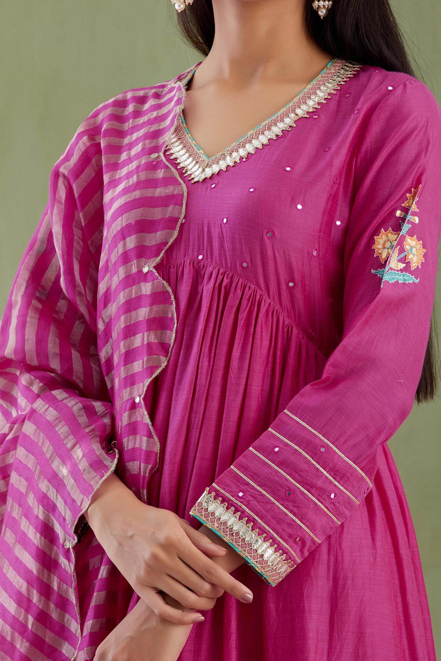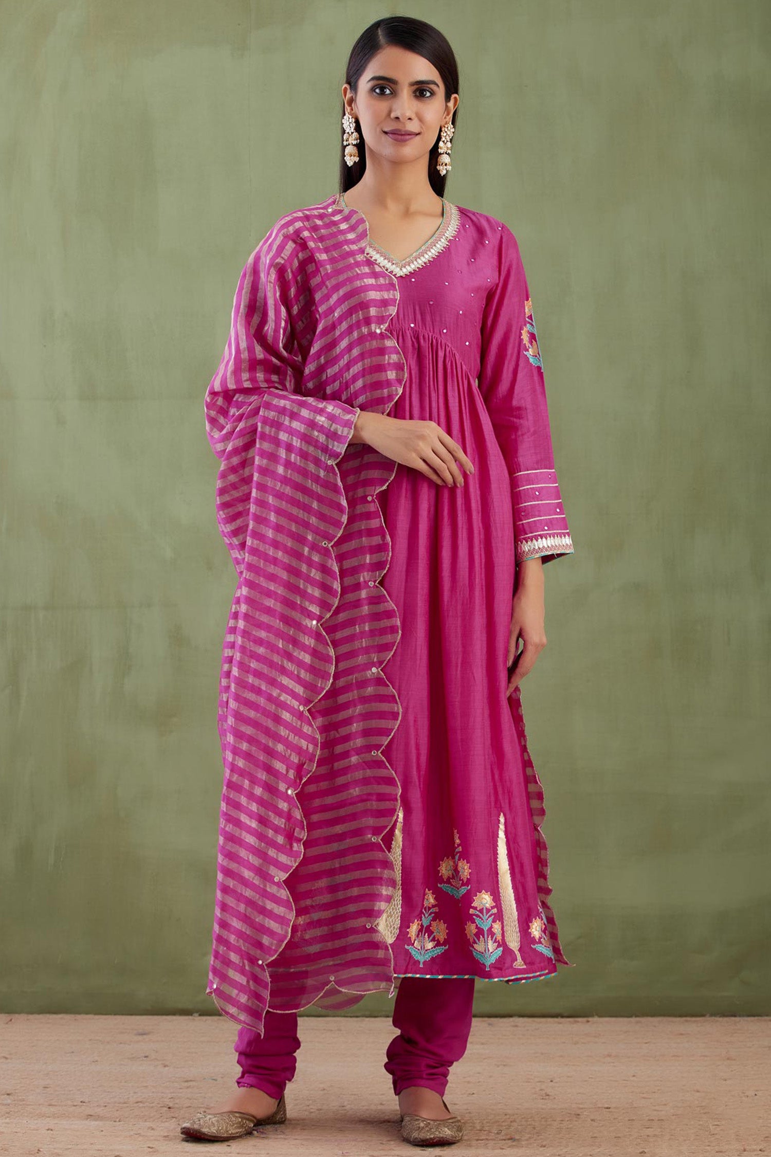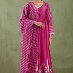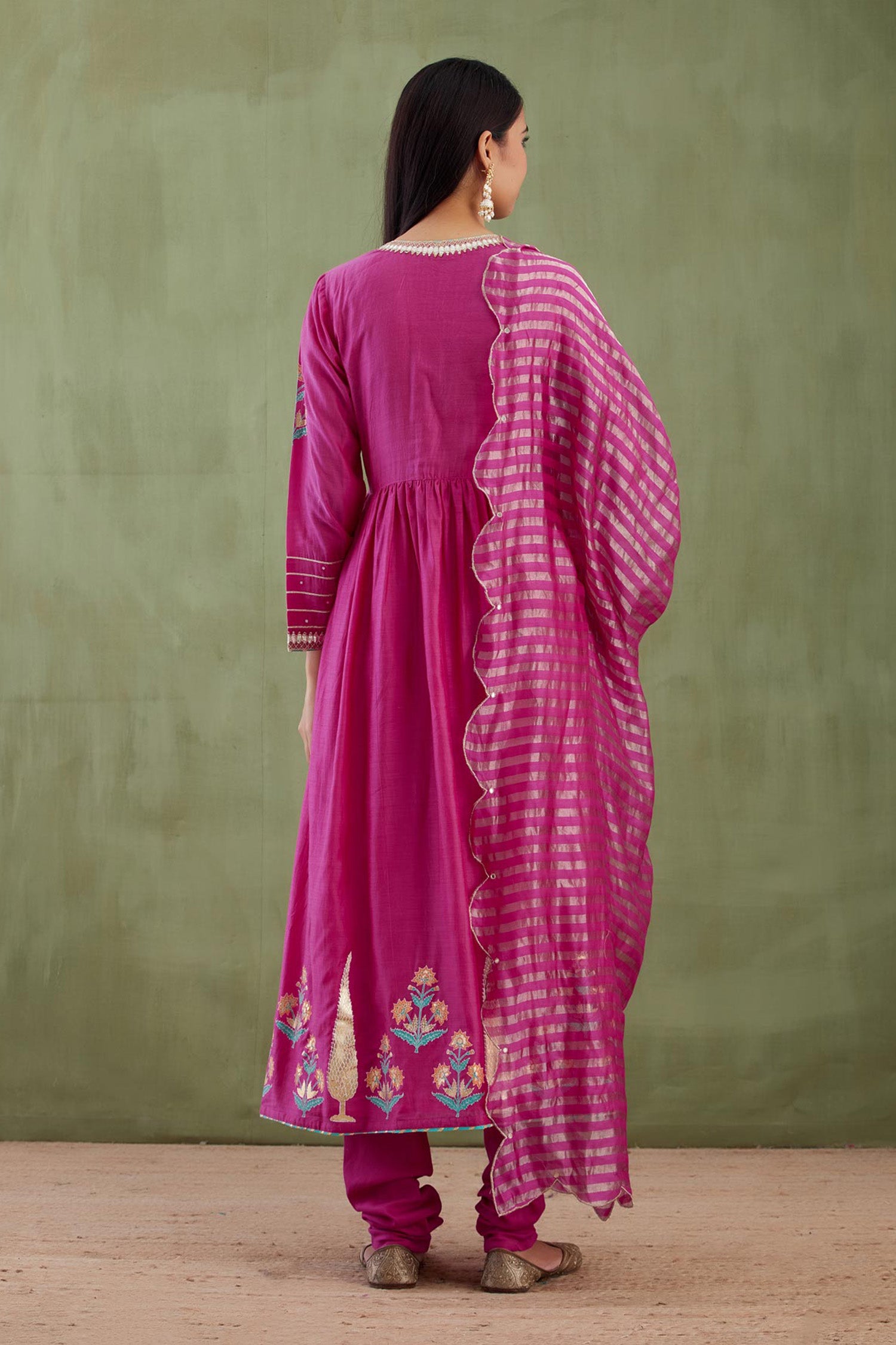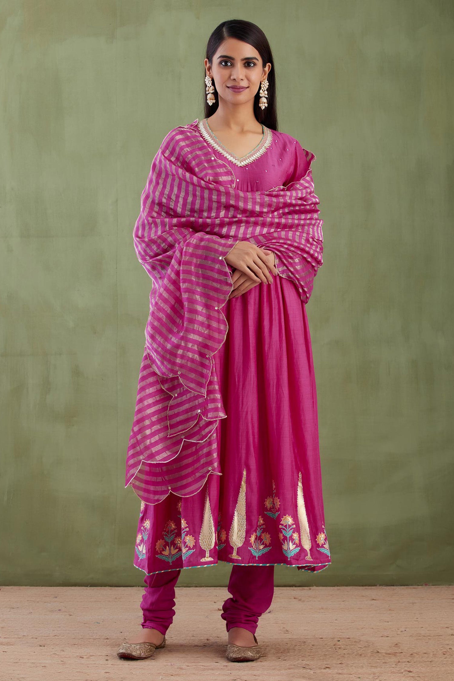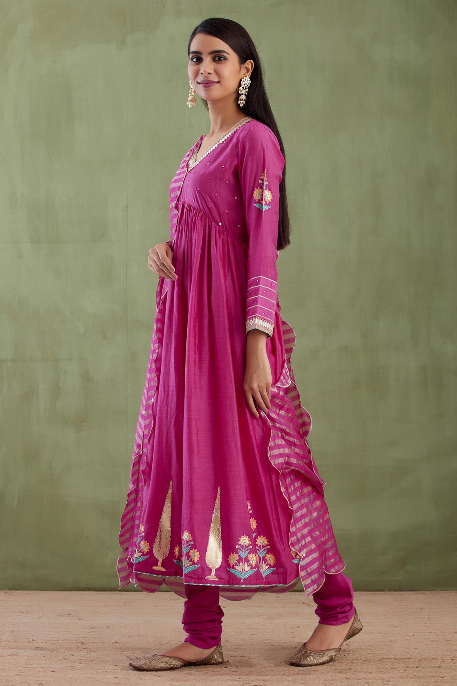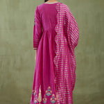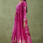 Dark Pink Cotton Silk Anarkali Suit Set With Floral Design