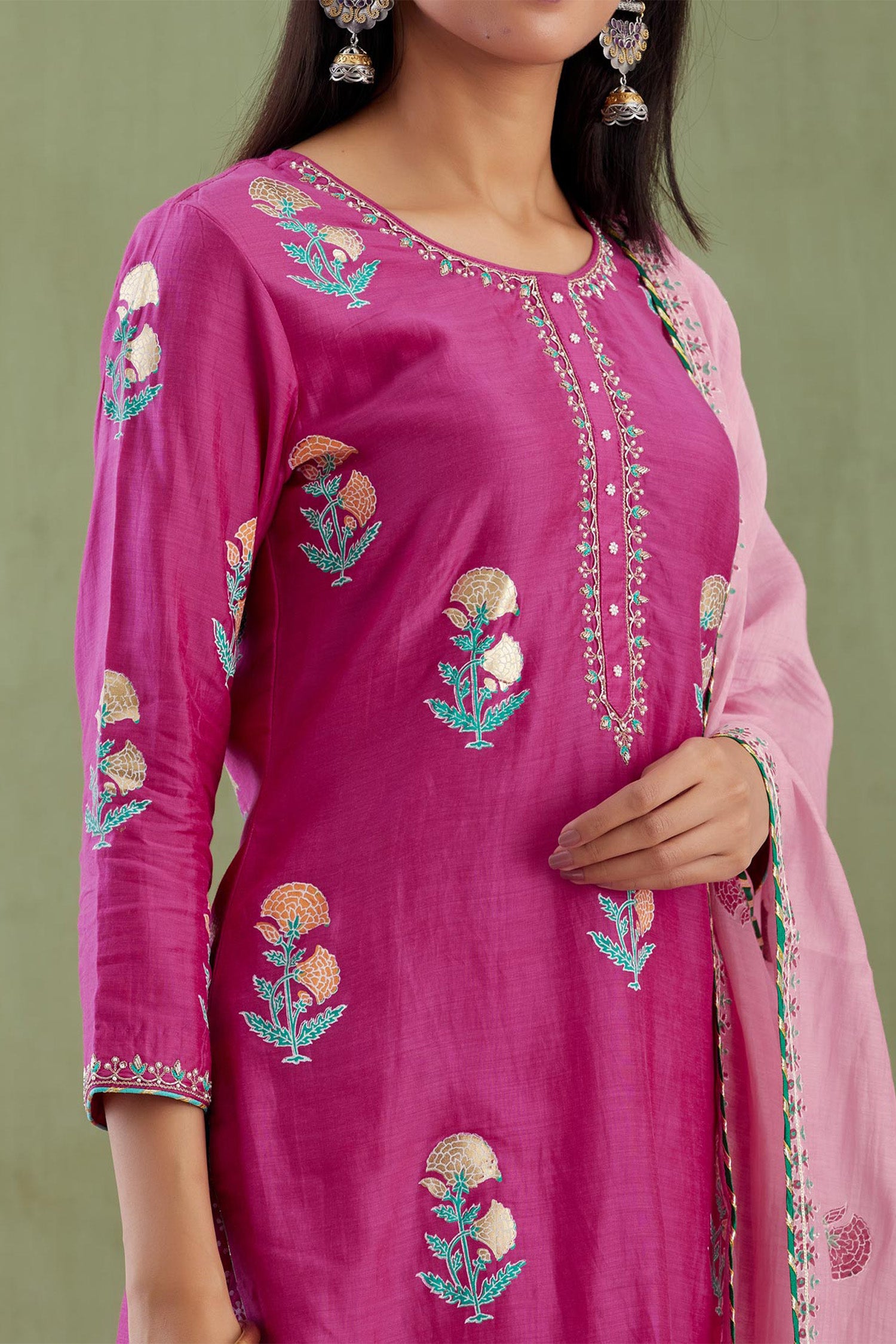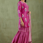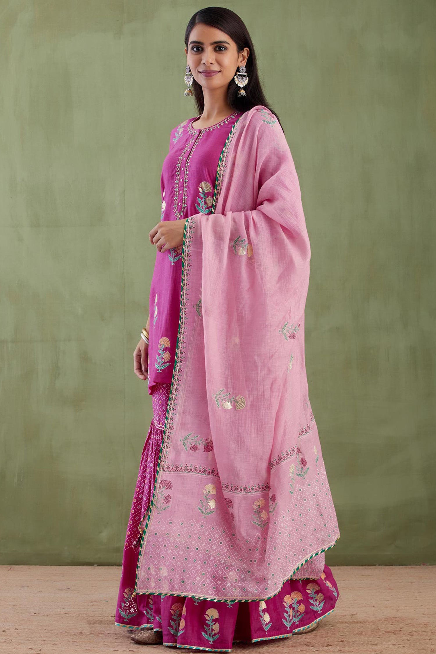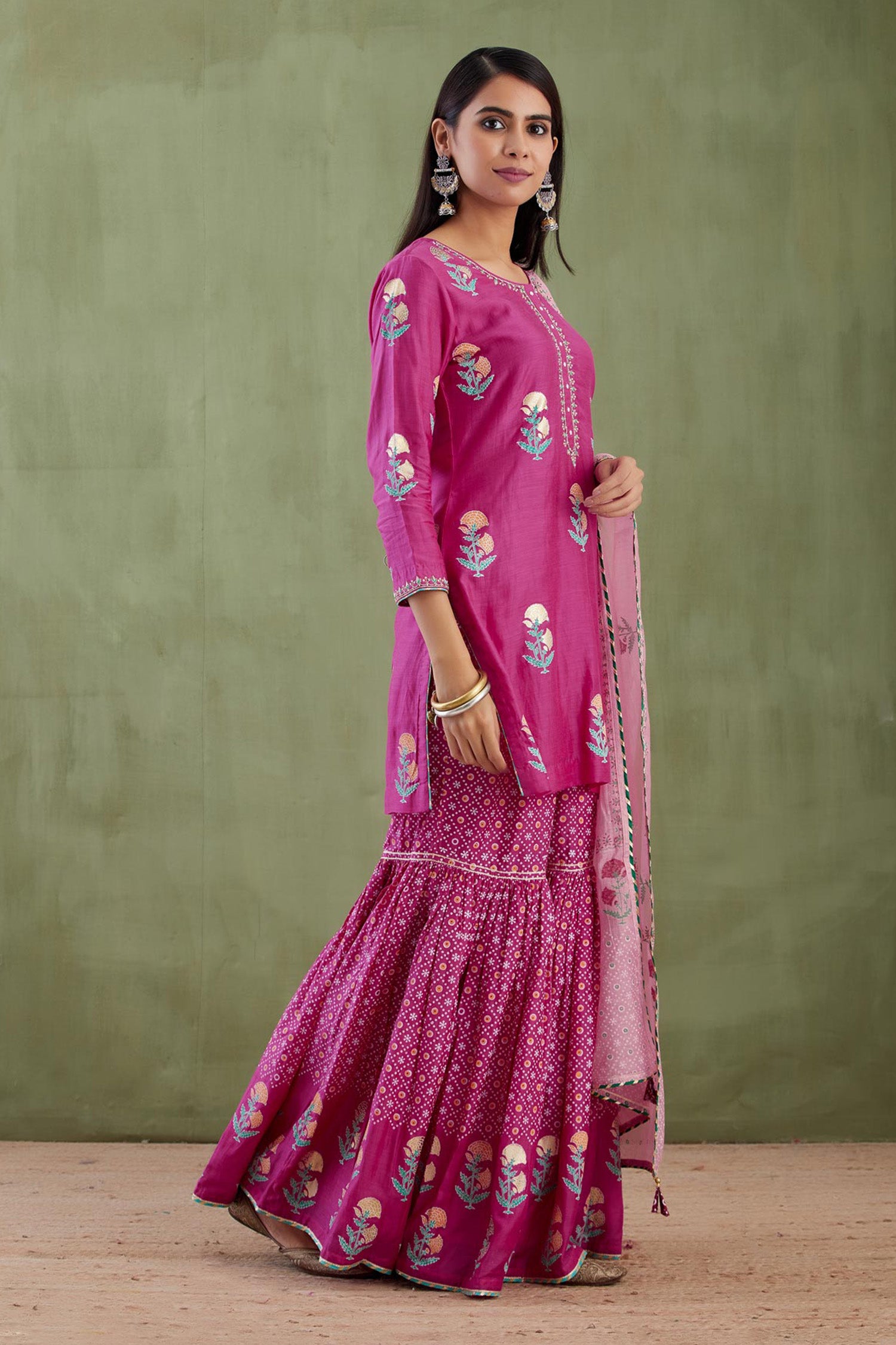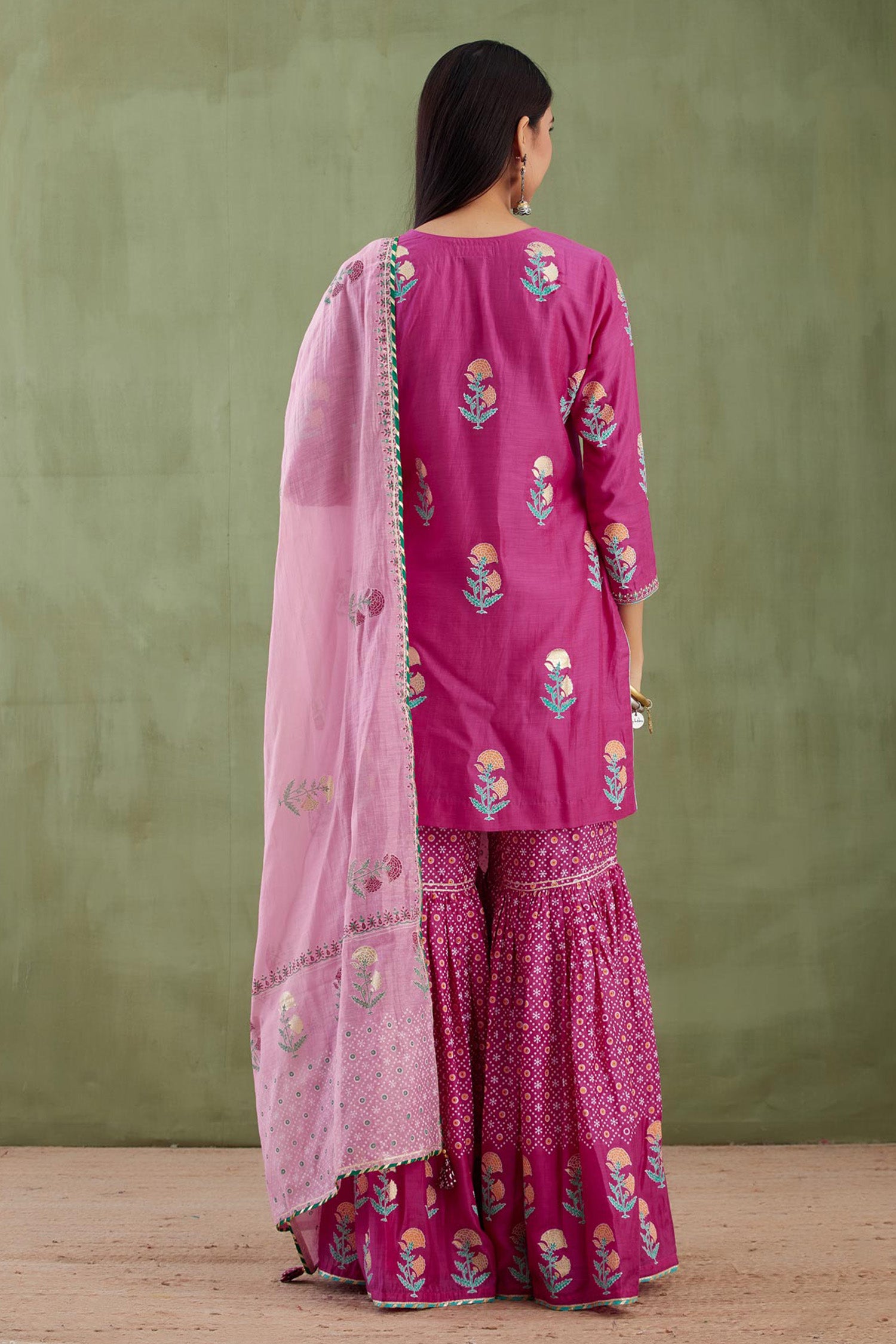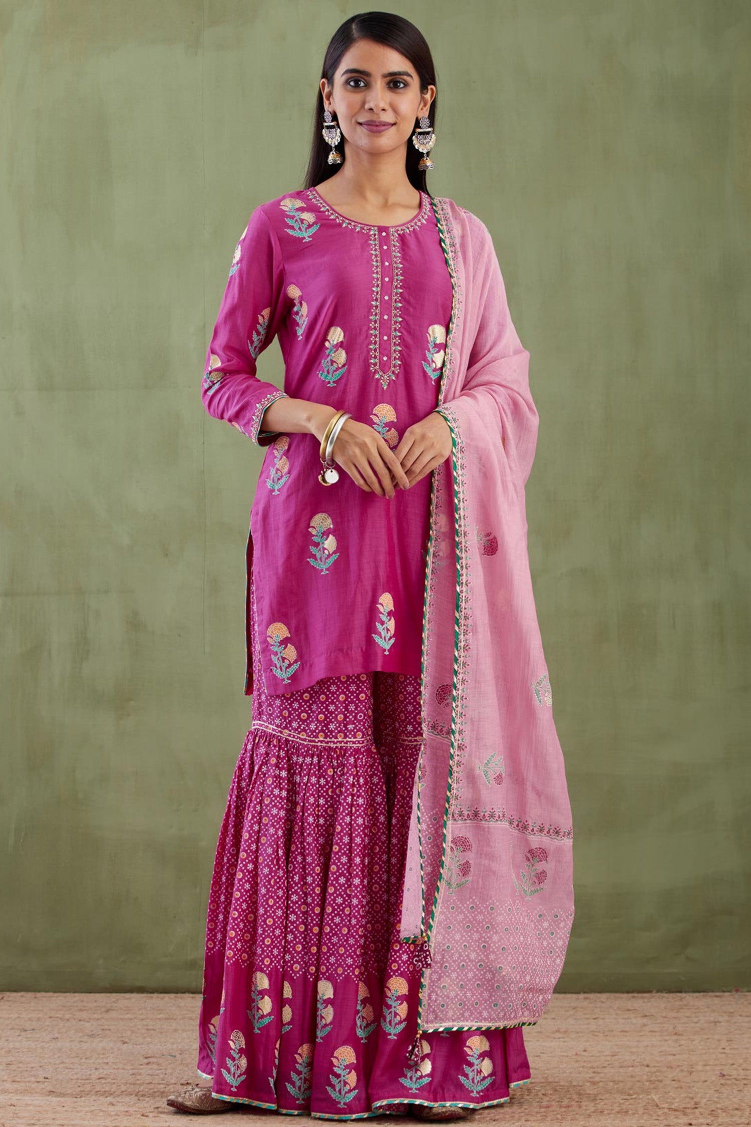 The ethnic floral foil printed beautiful dark pink cotton silk kurti set paired with matching gharara pants and a dupatta for casual to festive wear with an elegance.