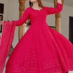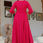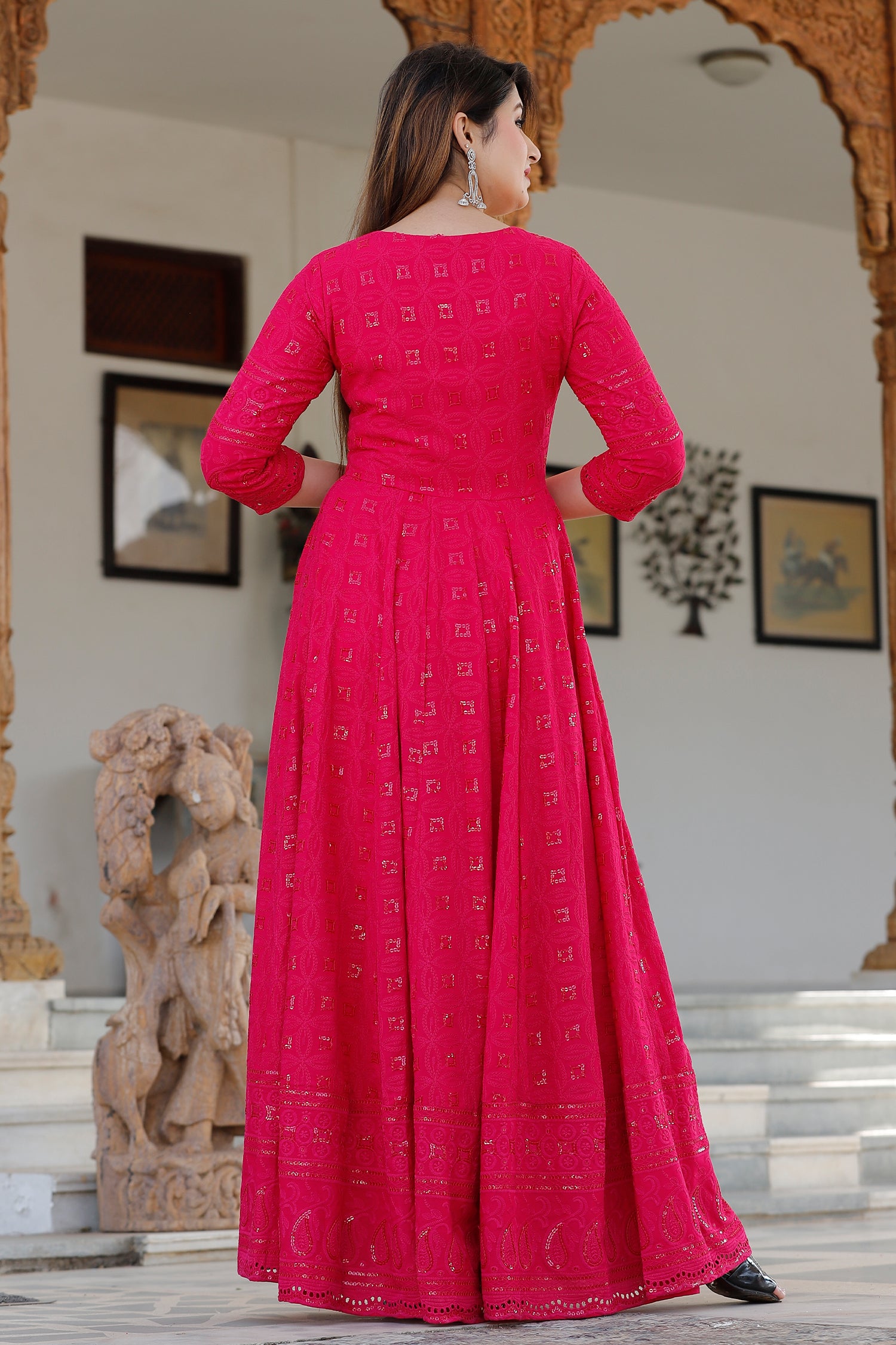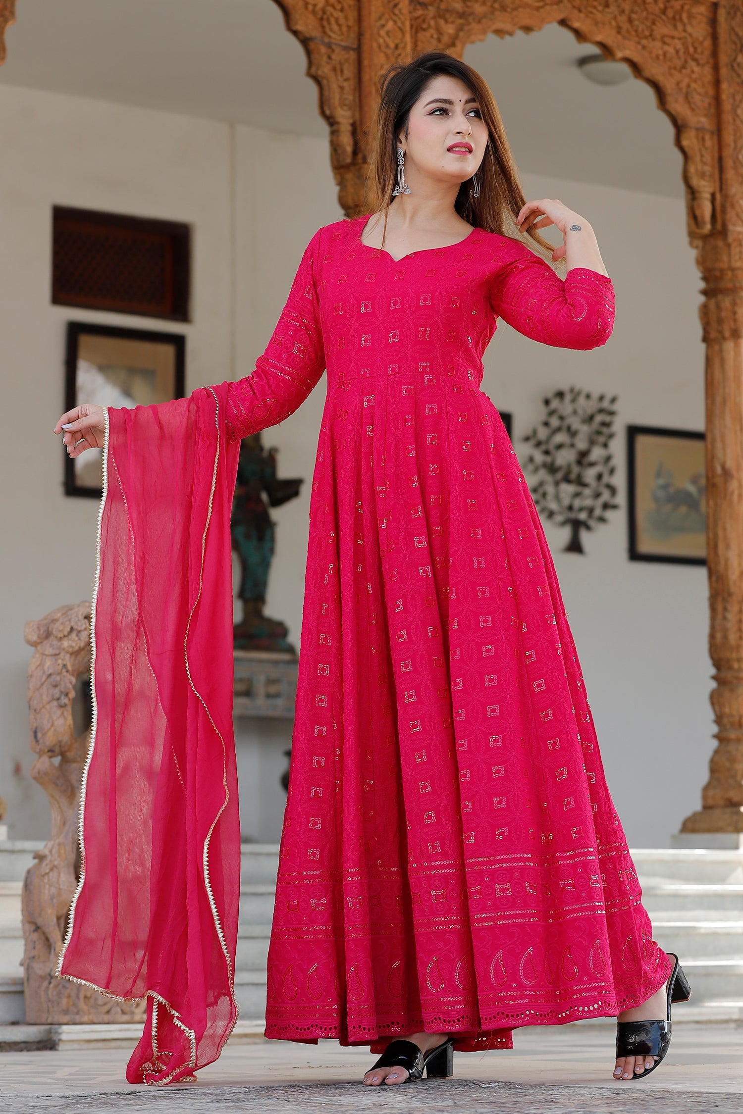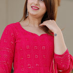 The dark pink rayon long traditional kurti with chikankari work for a subtle charm and neat finish which combines tradition and comfort.