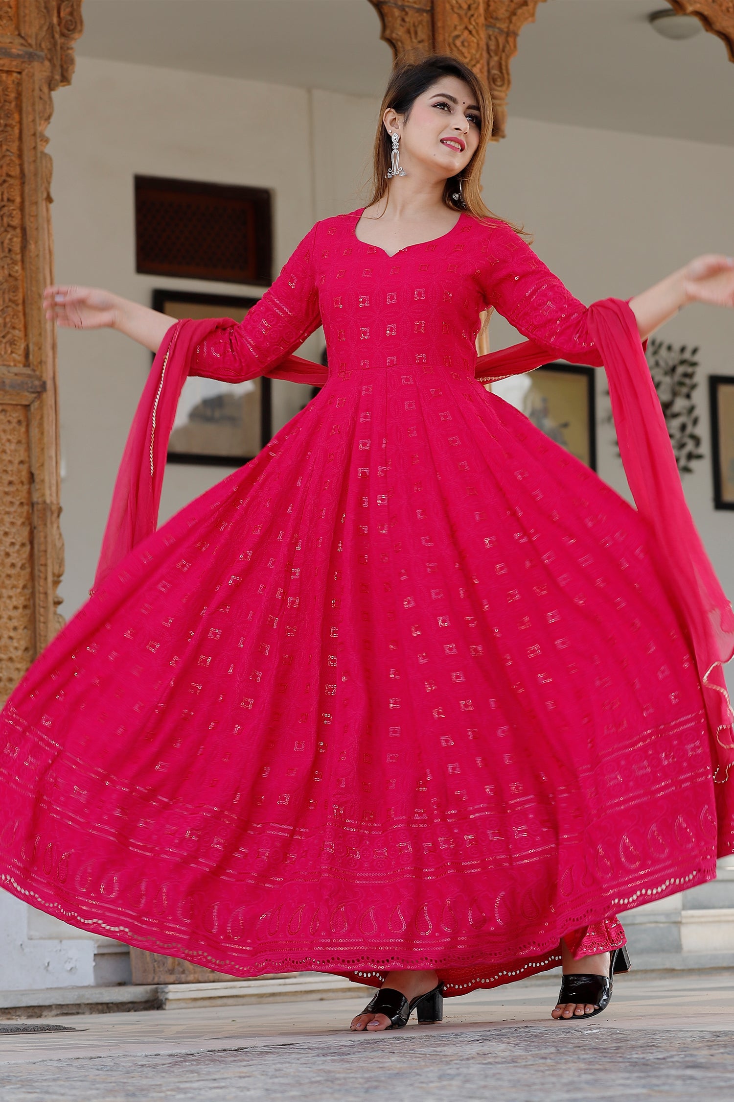Dark Pink Rayon Long Traditional Kurti With Dupatta