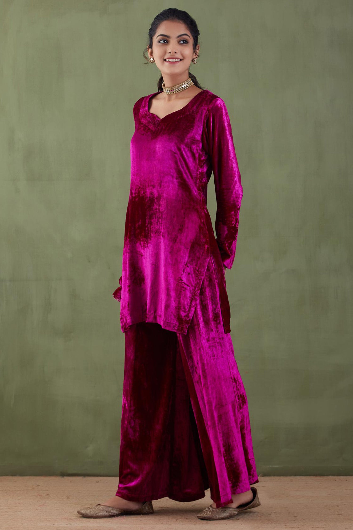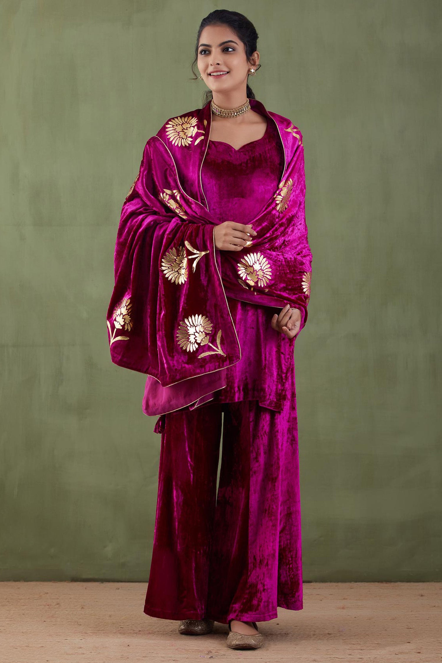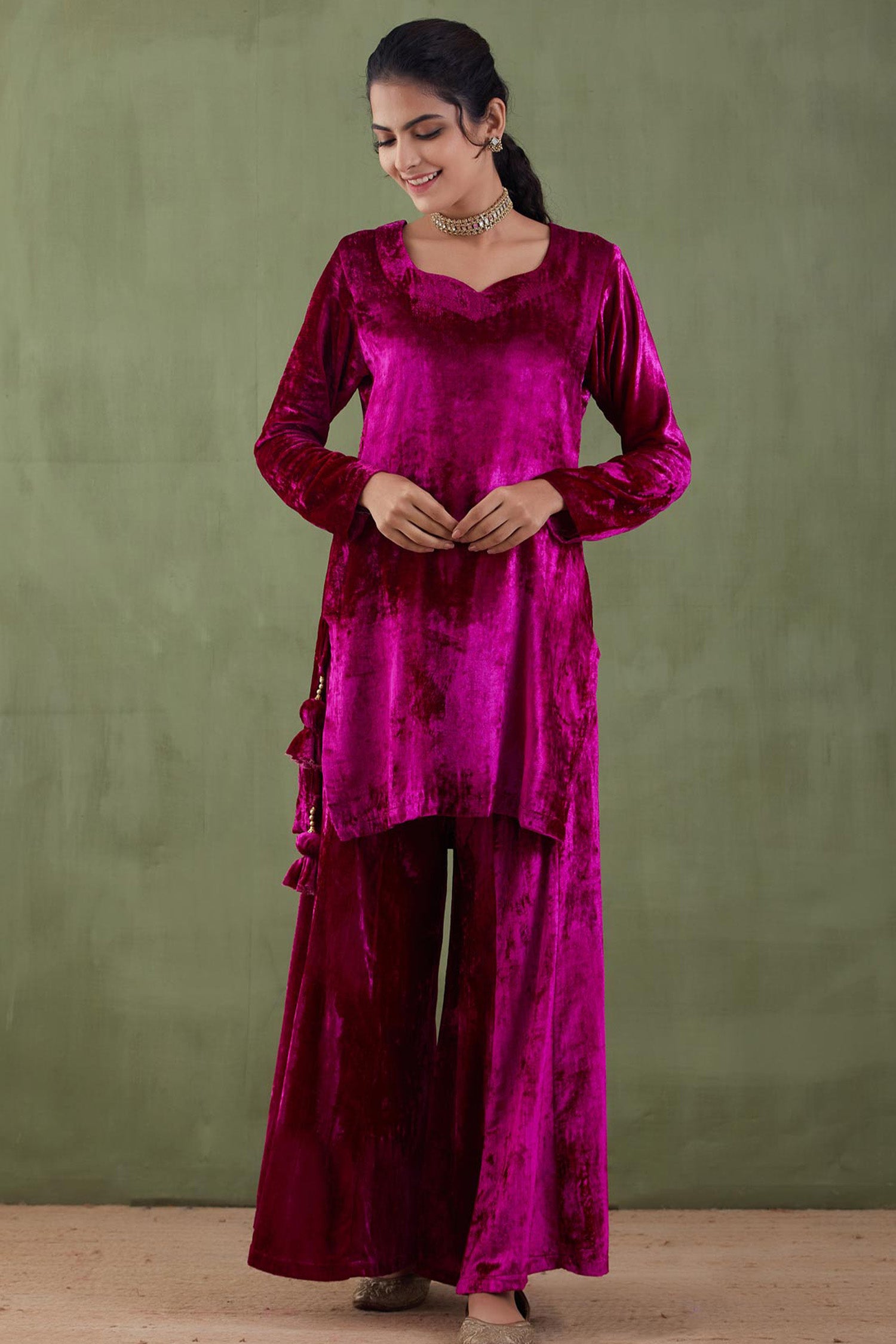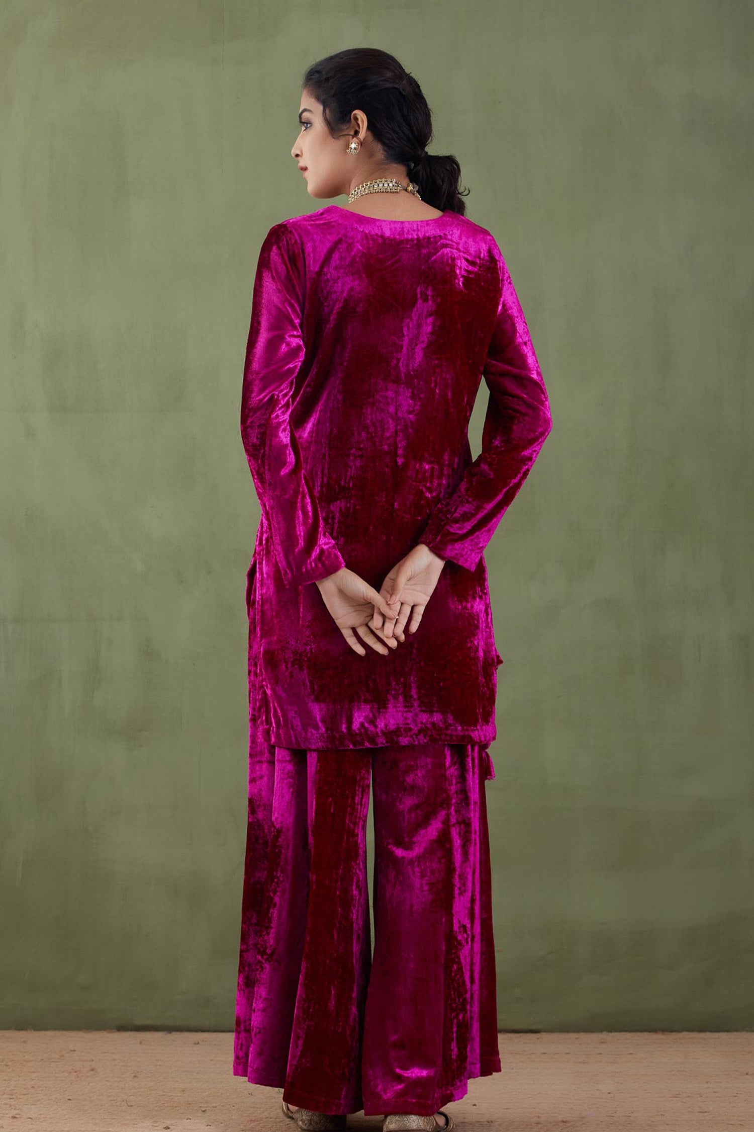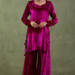 Dark Pink Velvet Short Kurta And Sharara With Shawl Set