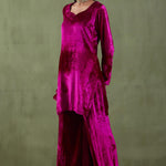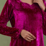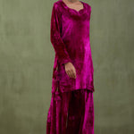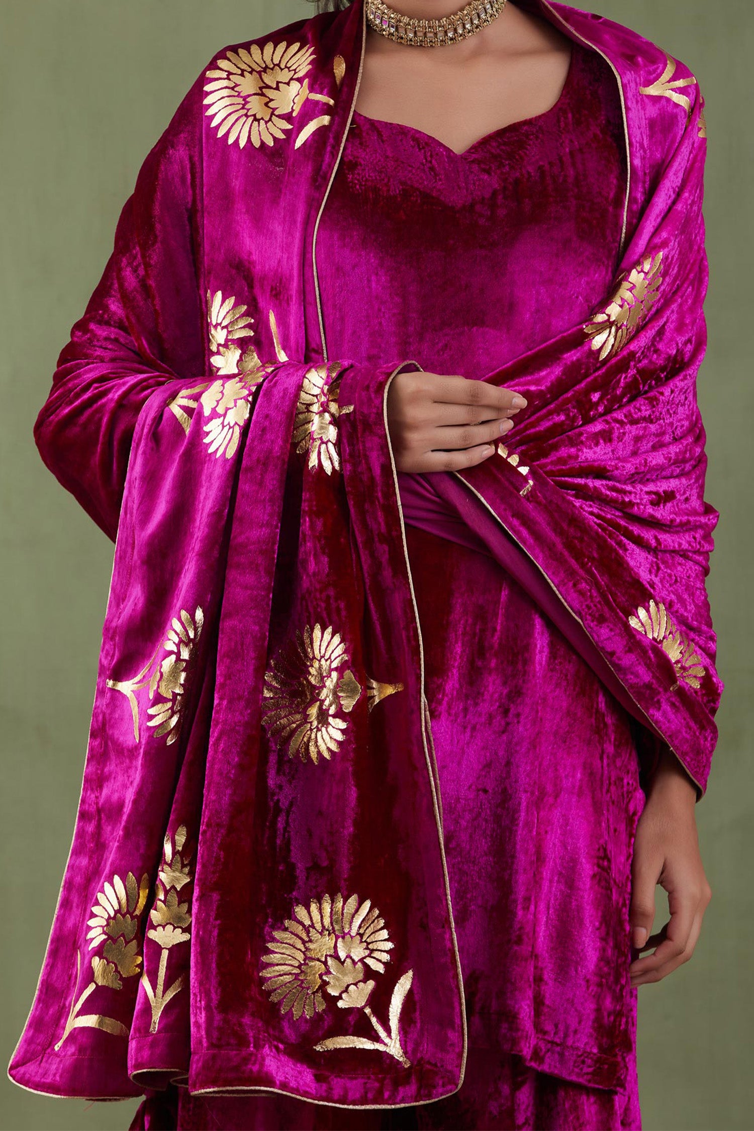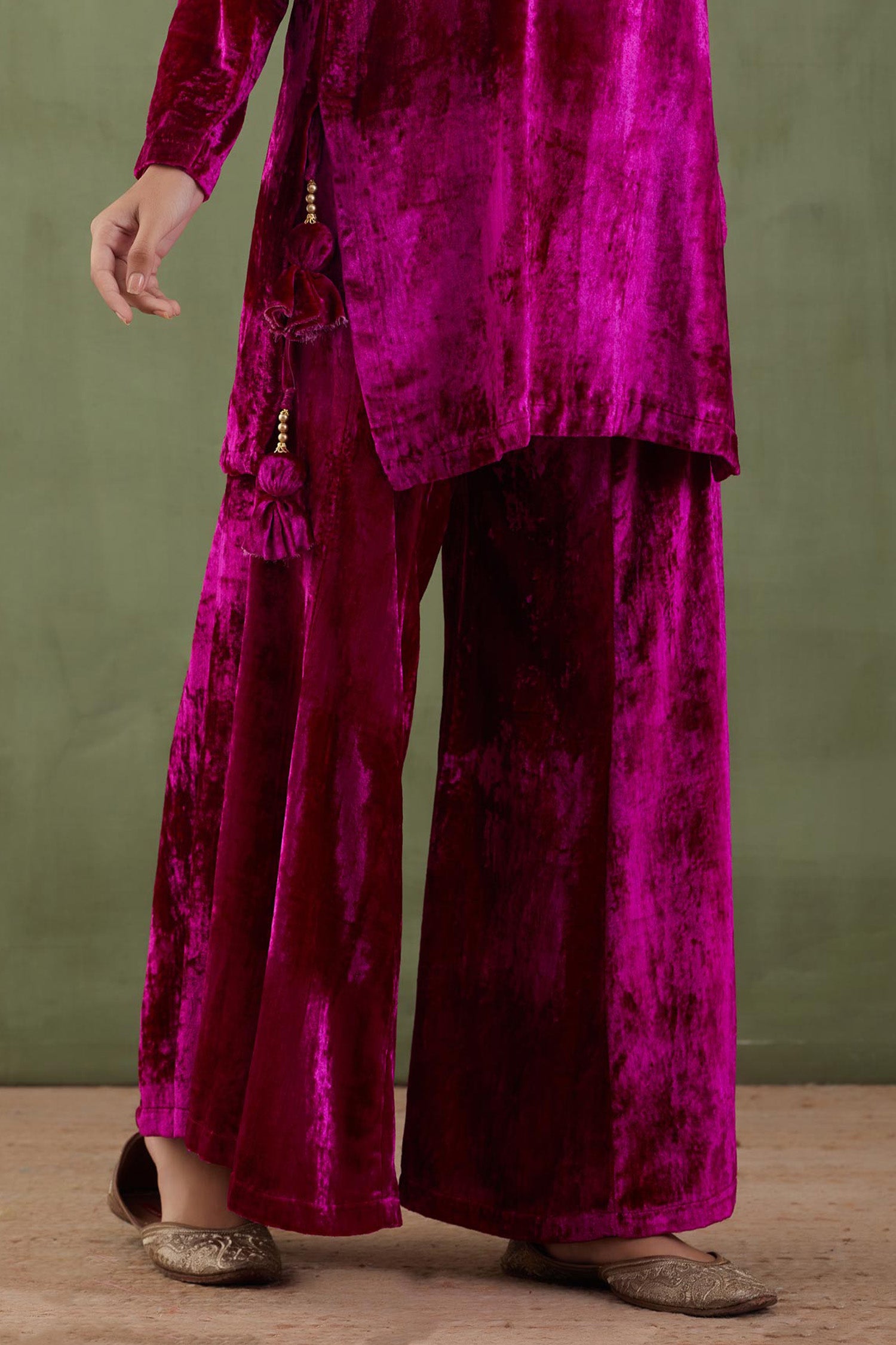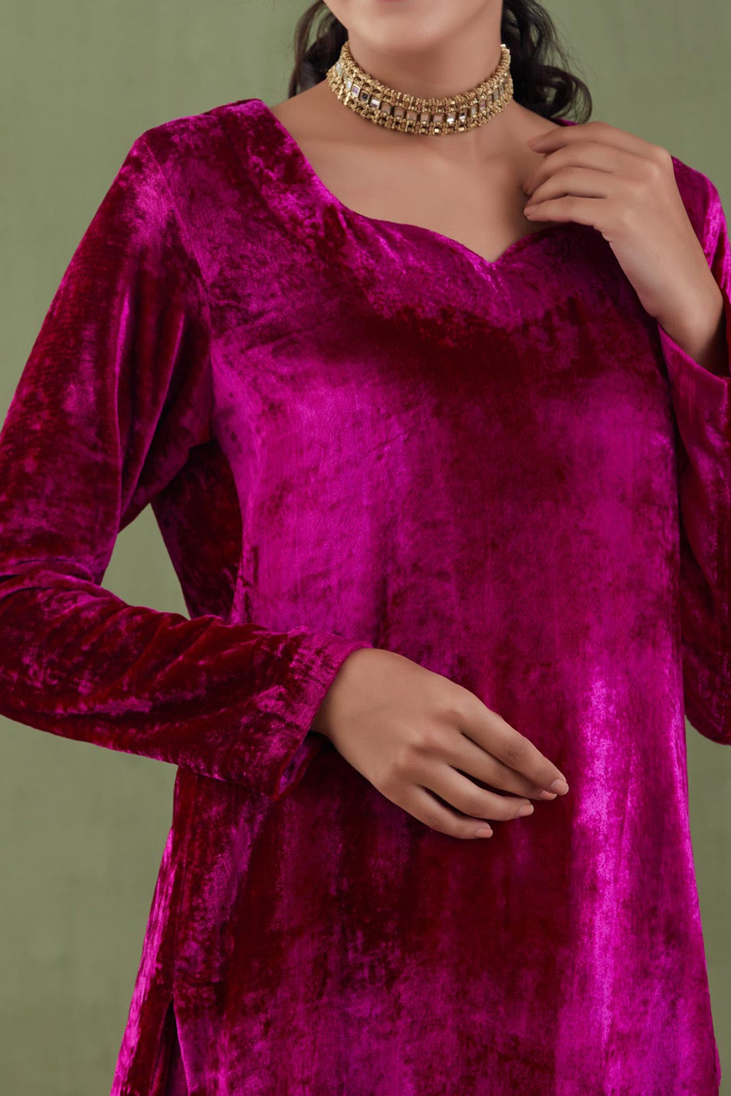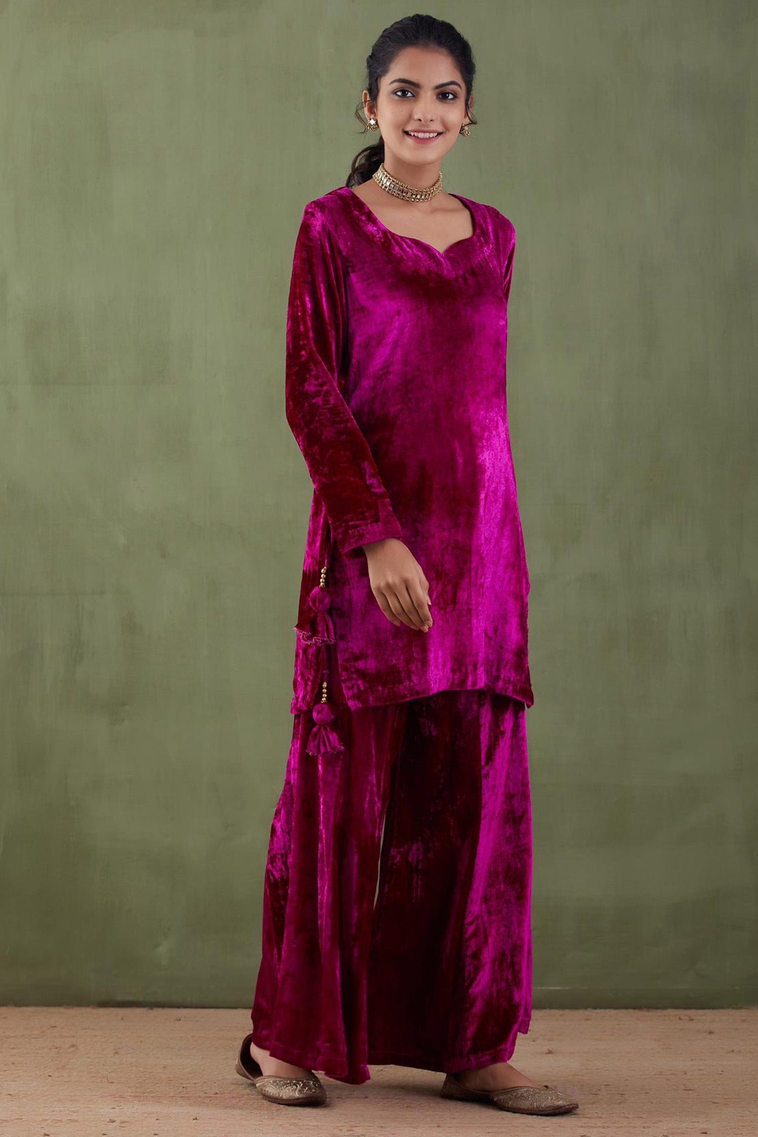 Dark Pink Velvet Short Kurta And Sharara With Shawl Set