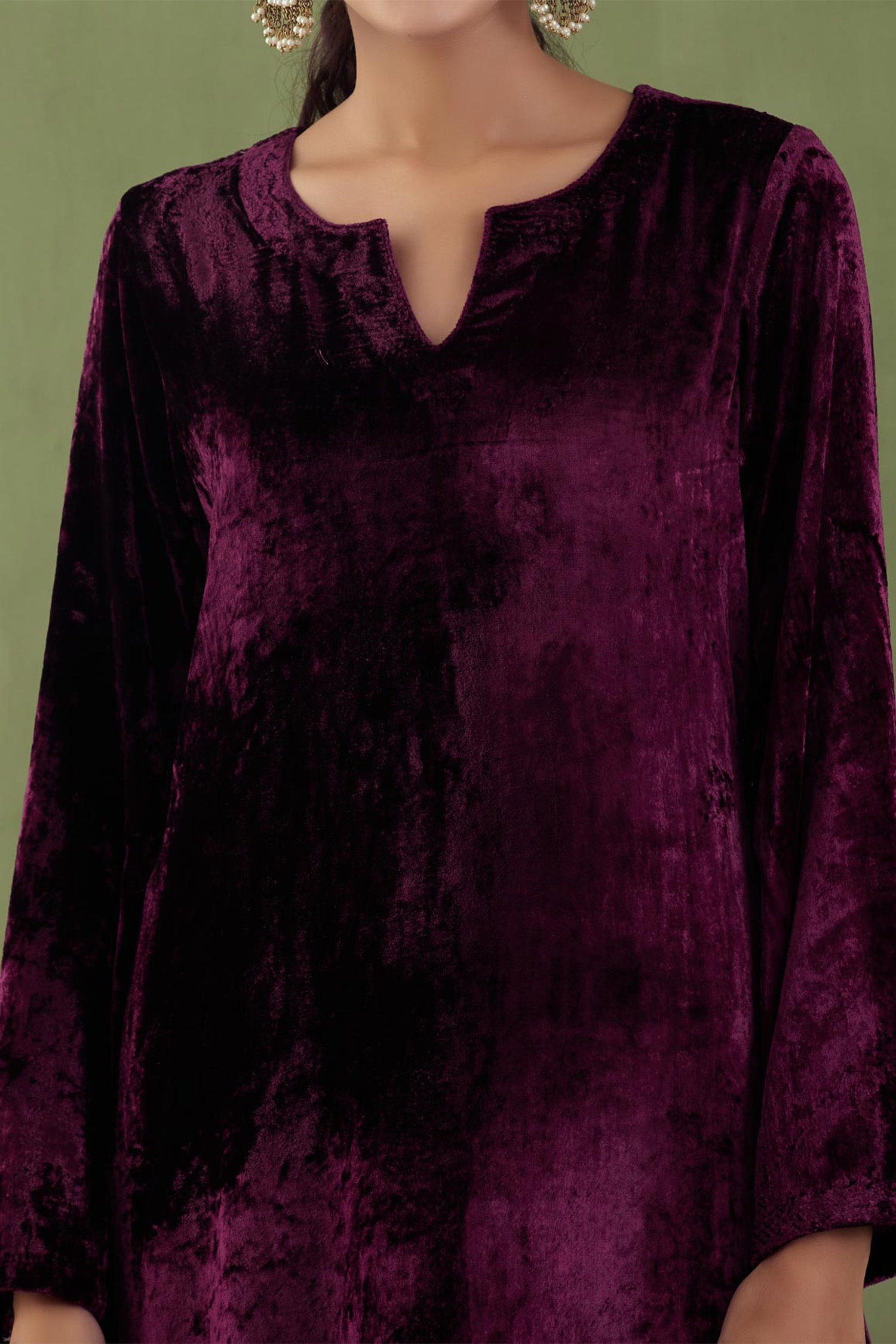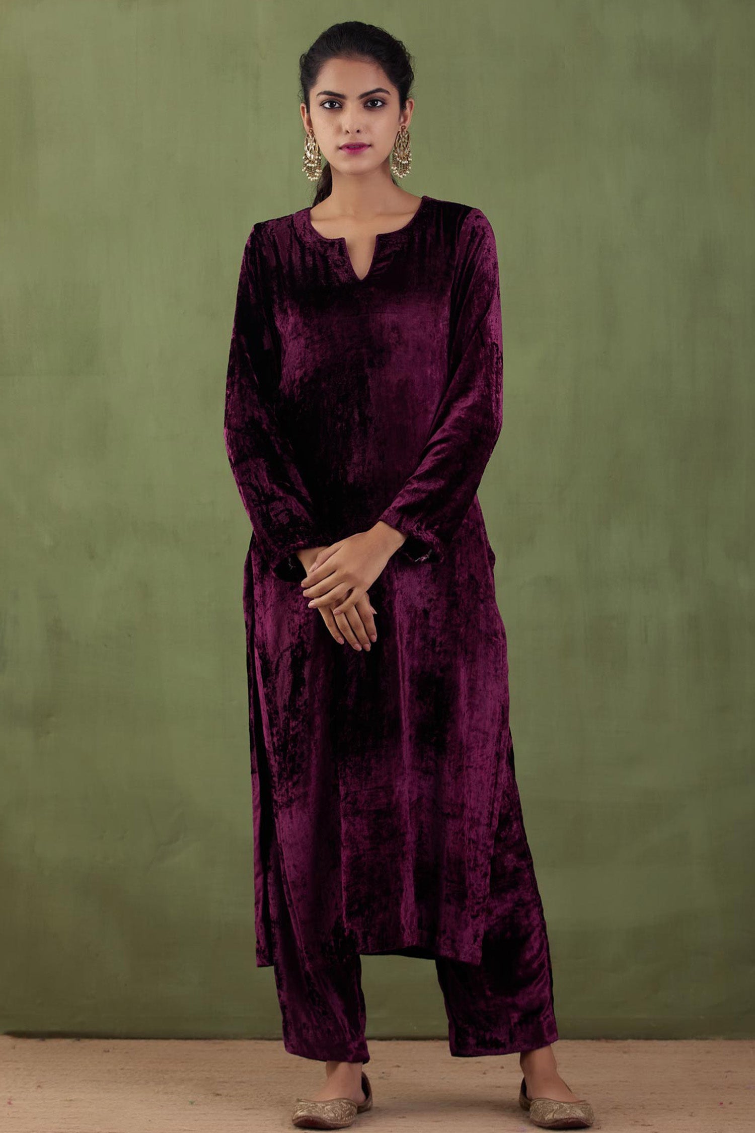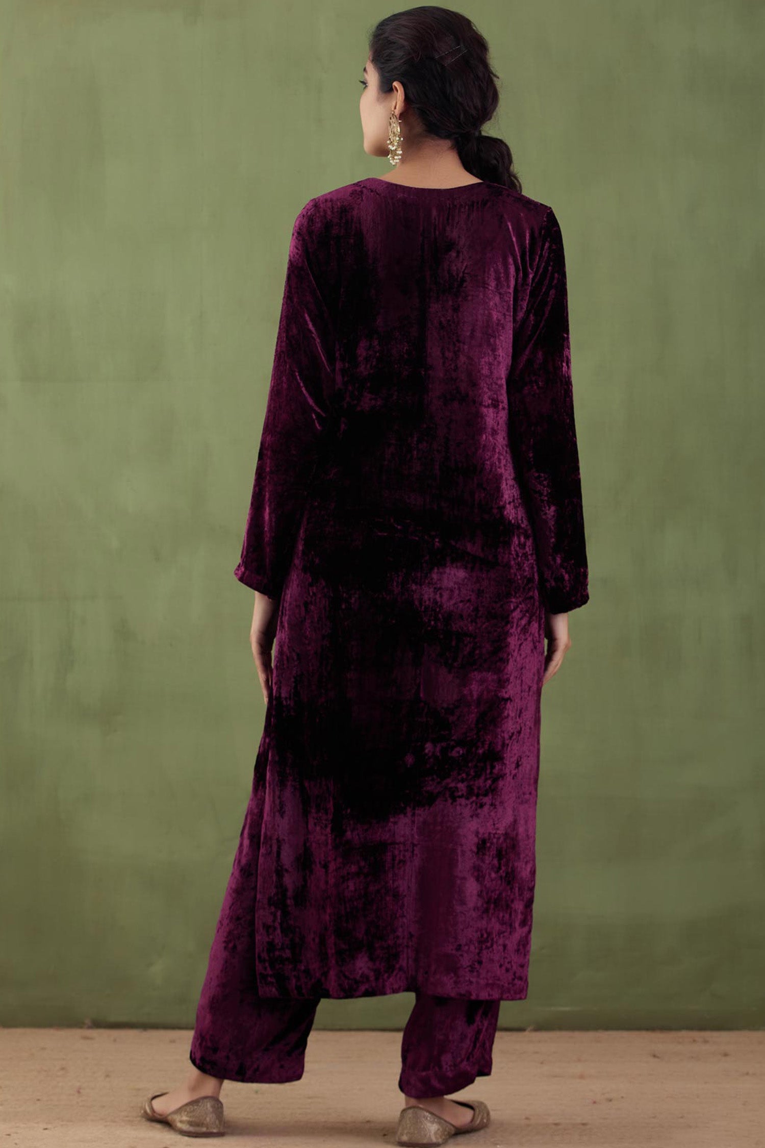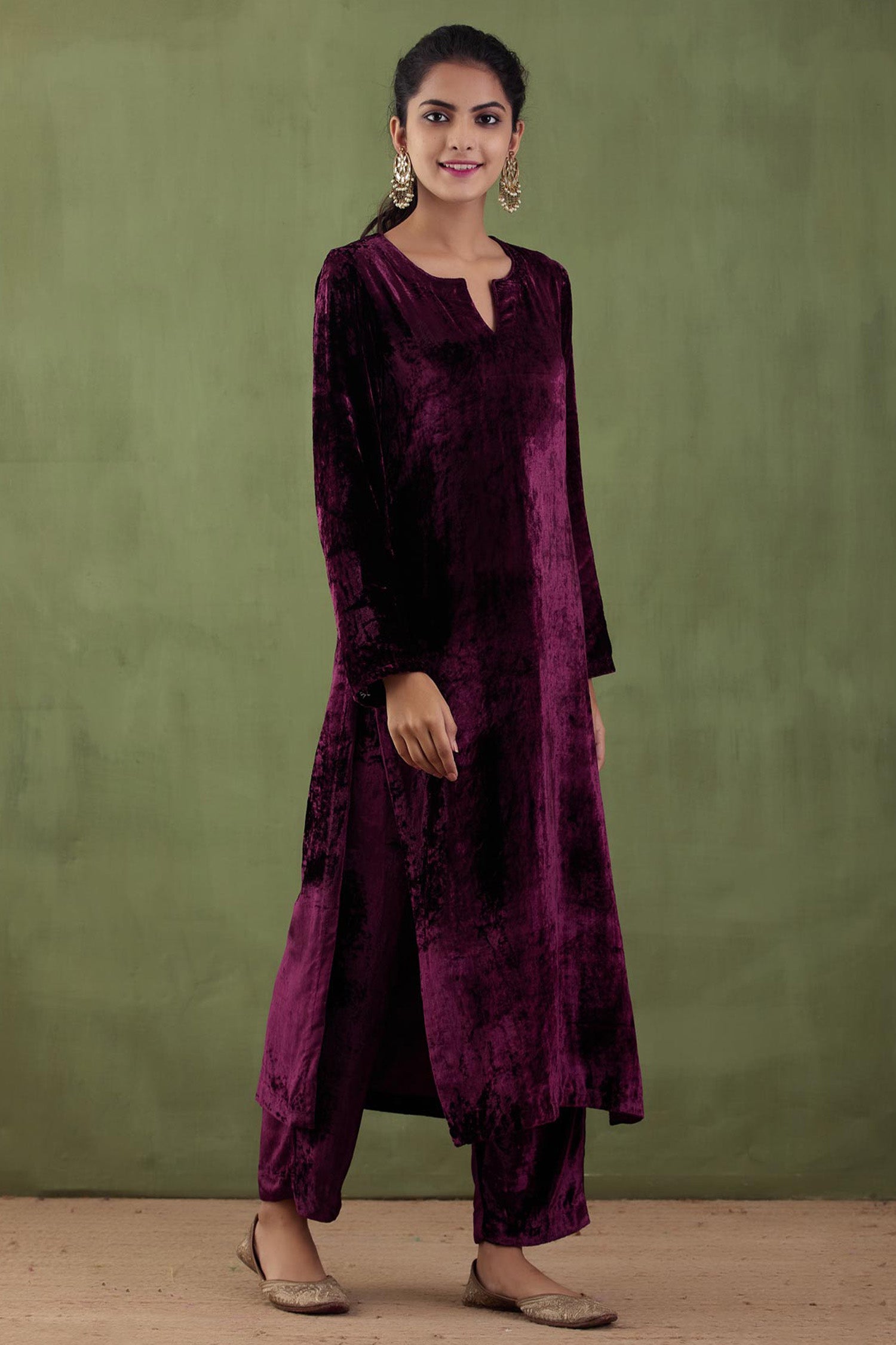 The dark purple velvet straight zardosi work kurta and plain pant with gotta work for a rich and elegant look.