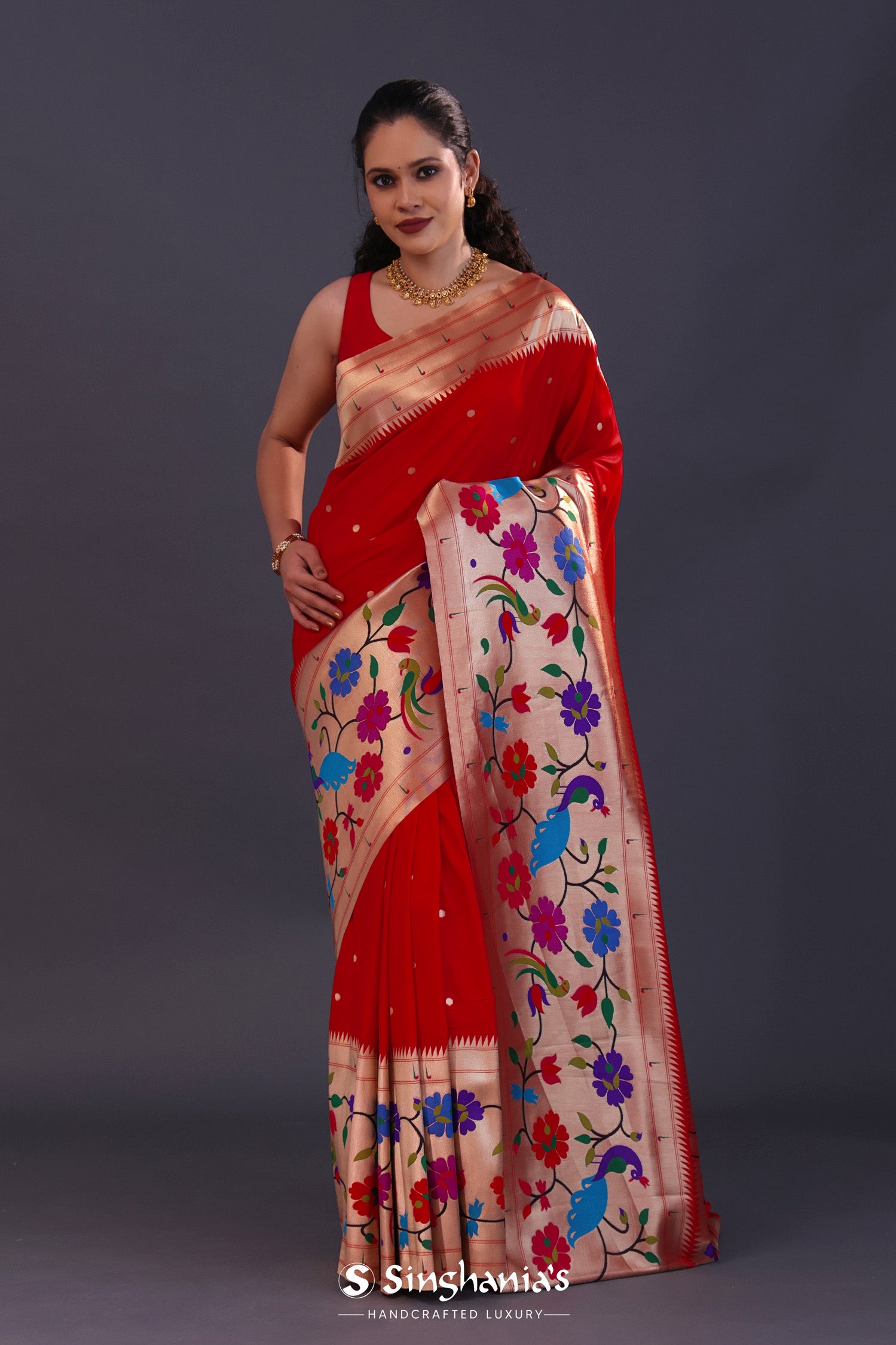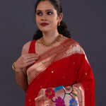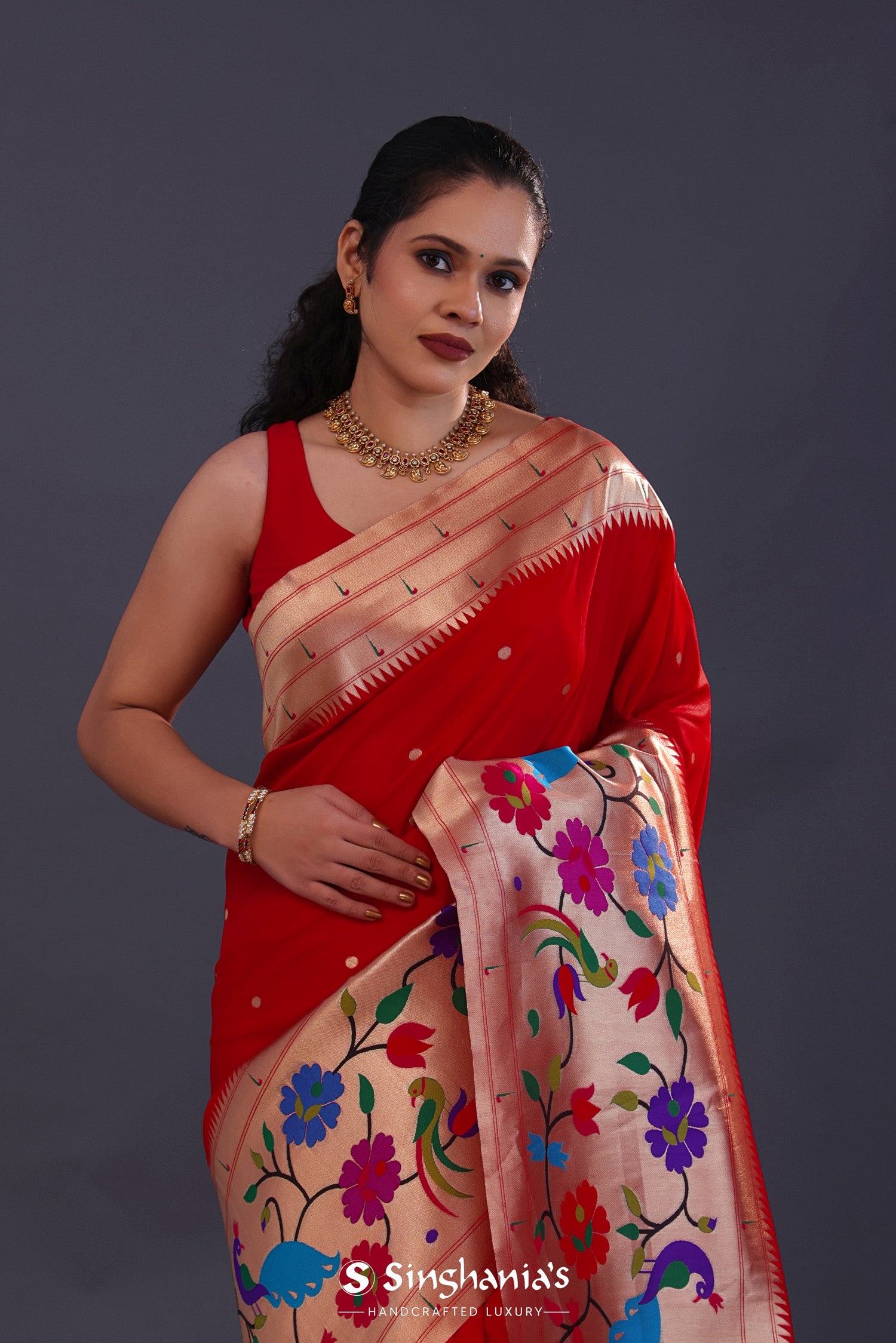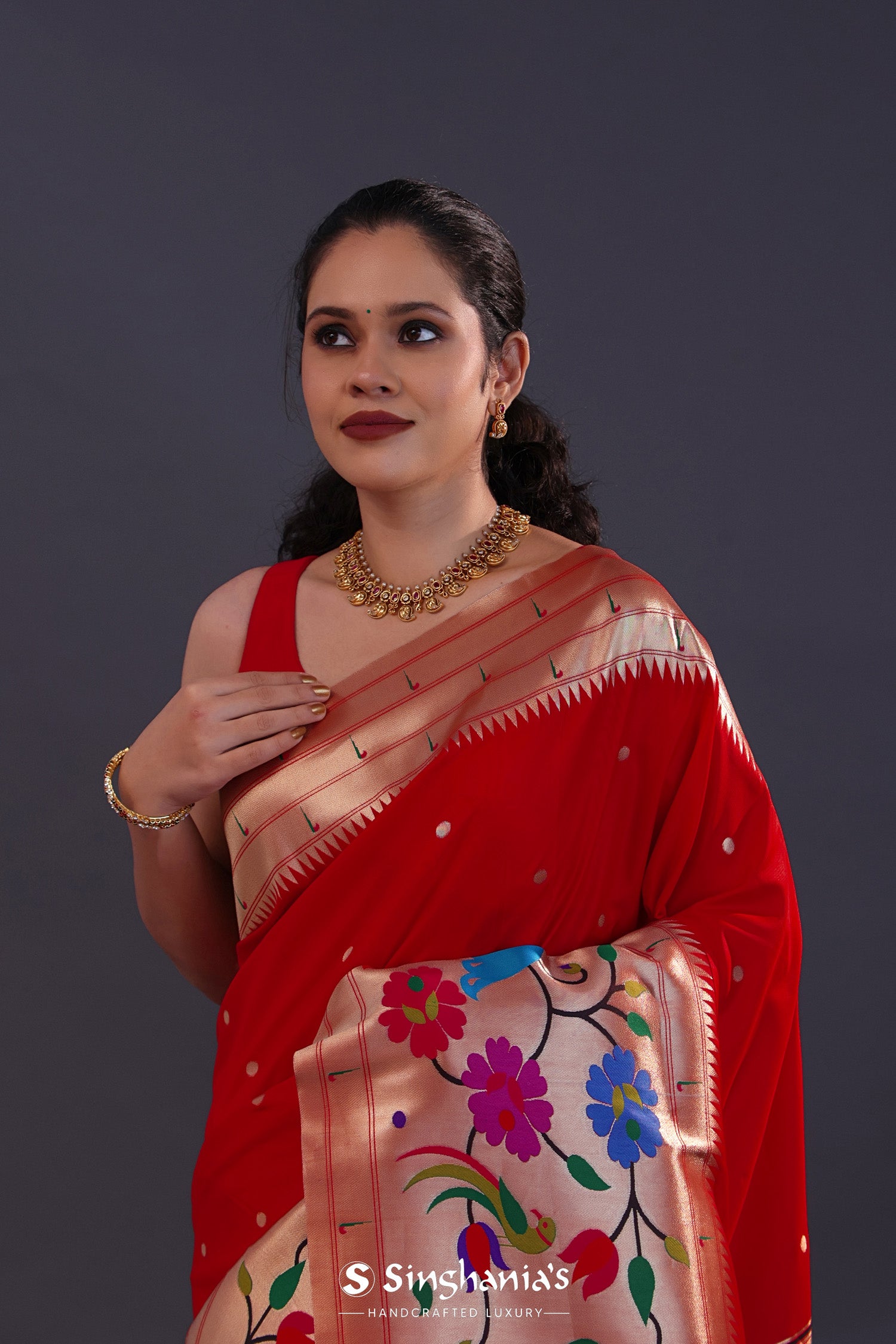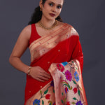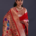 The Dark red paithani saree features butti's woven with gold zari complemented with paithani border and unstitched blouse