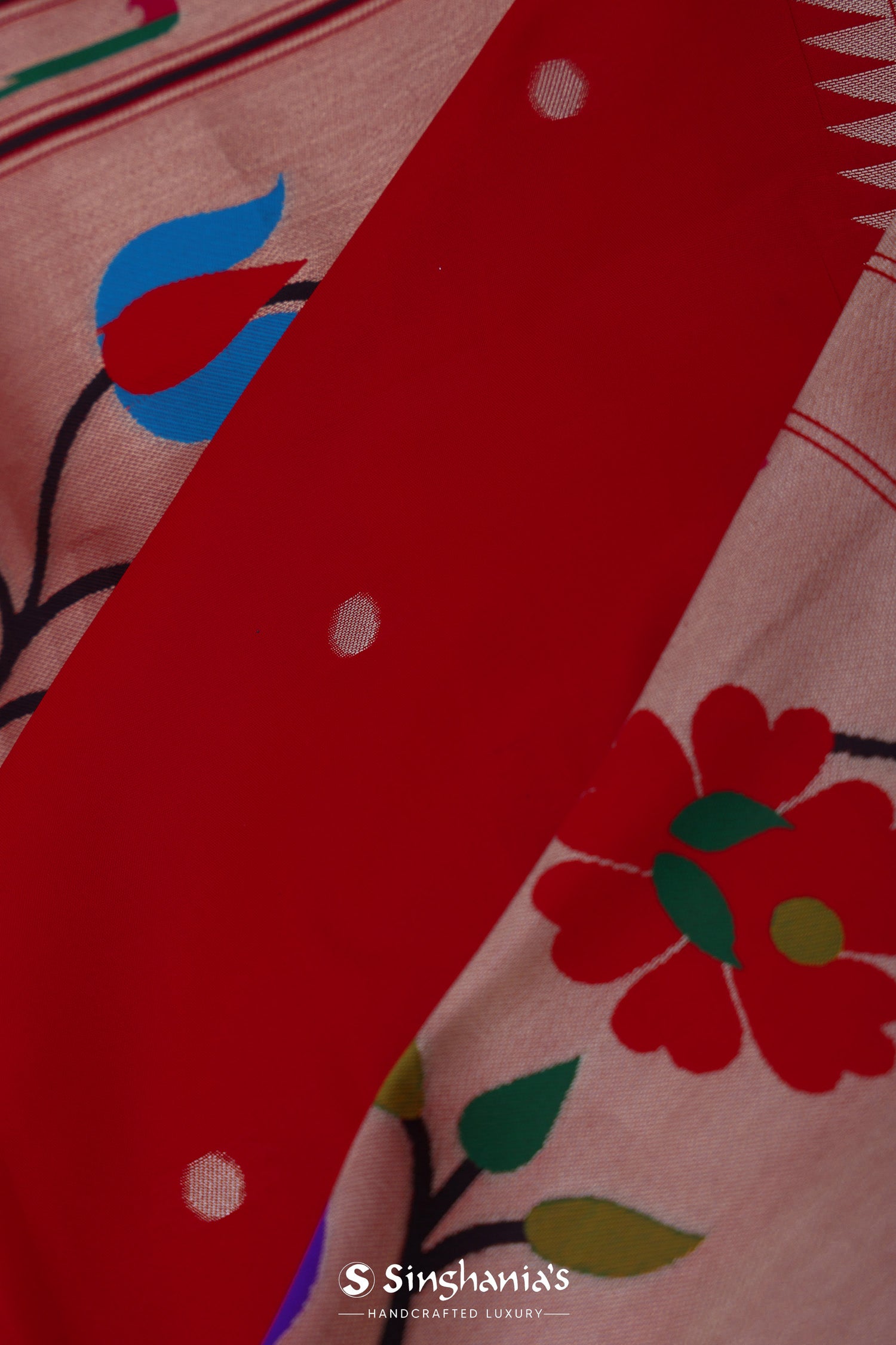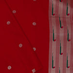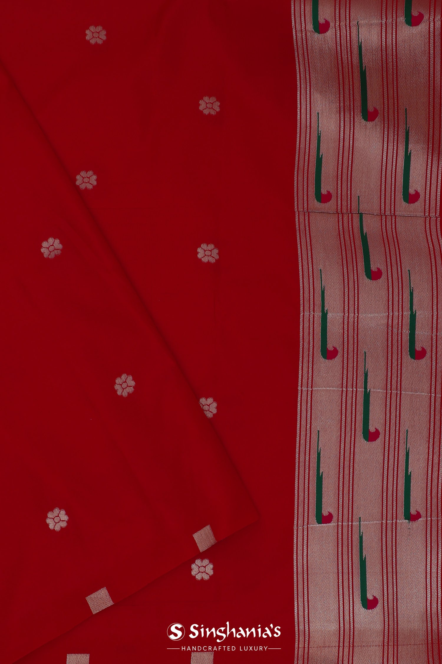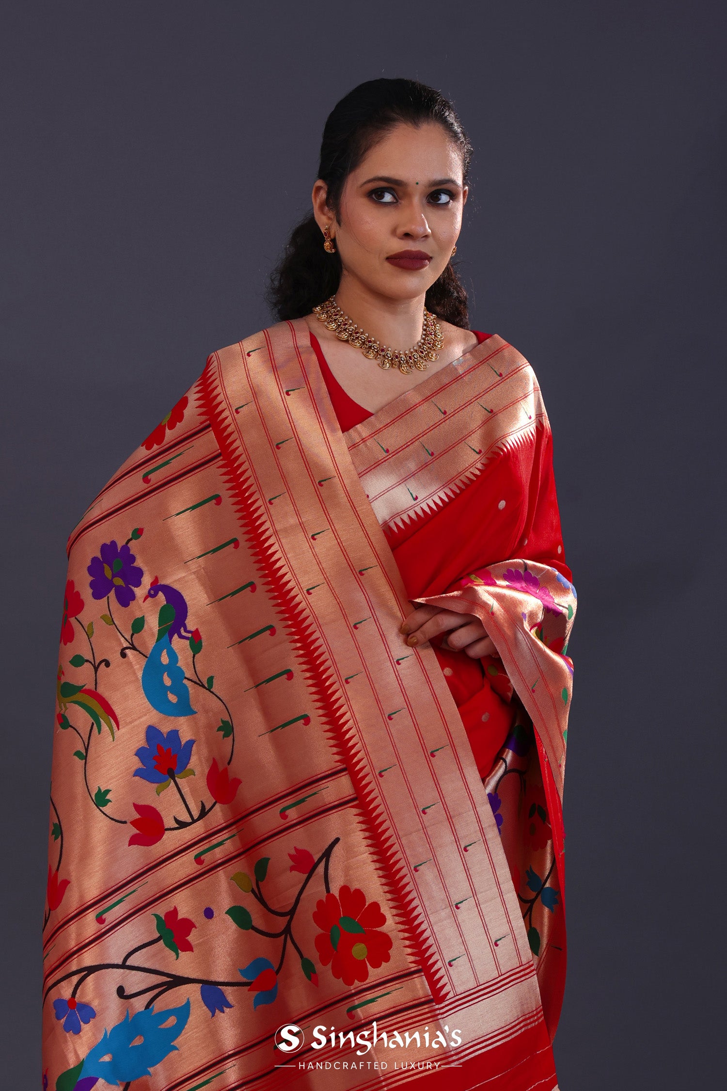The Dark red paithani saree features butti's woven with gold zari complemented with paithani border and unstitched blouse
