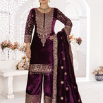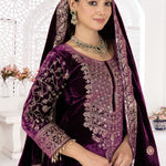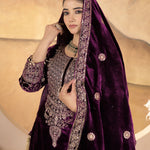 The dark wine velvet embroidered kurti set with matching velvet dupatta and pant for a rich and elegant look with gracious feel.