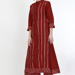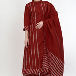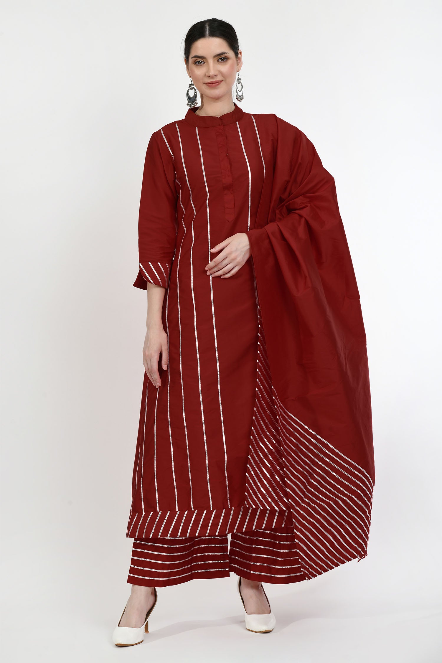 The deep maroon art silk gota work kurti set with matching palazzo and dupatta for an elegant look combined with style and tradition.