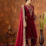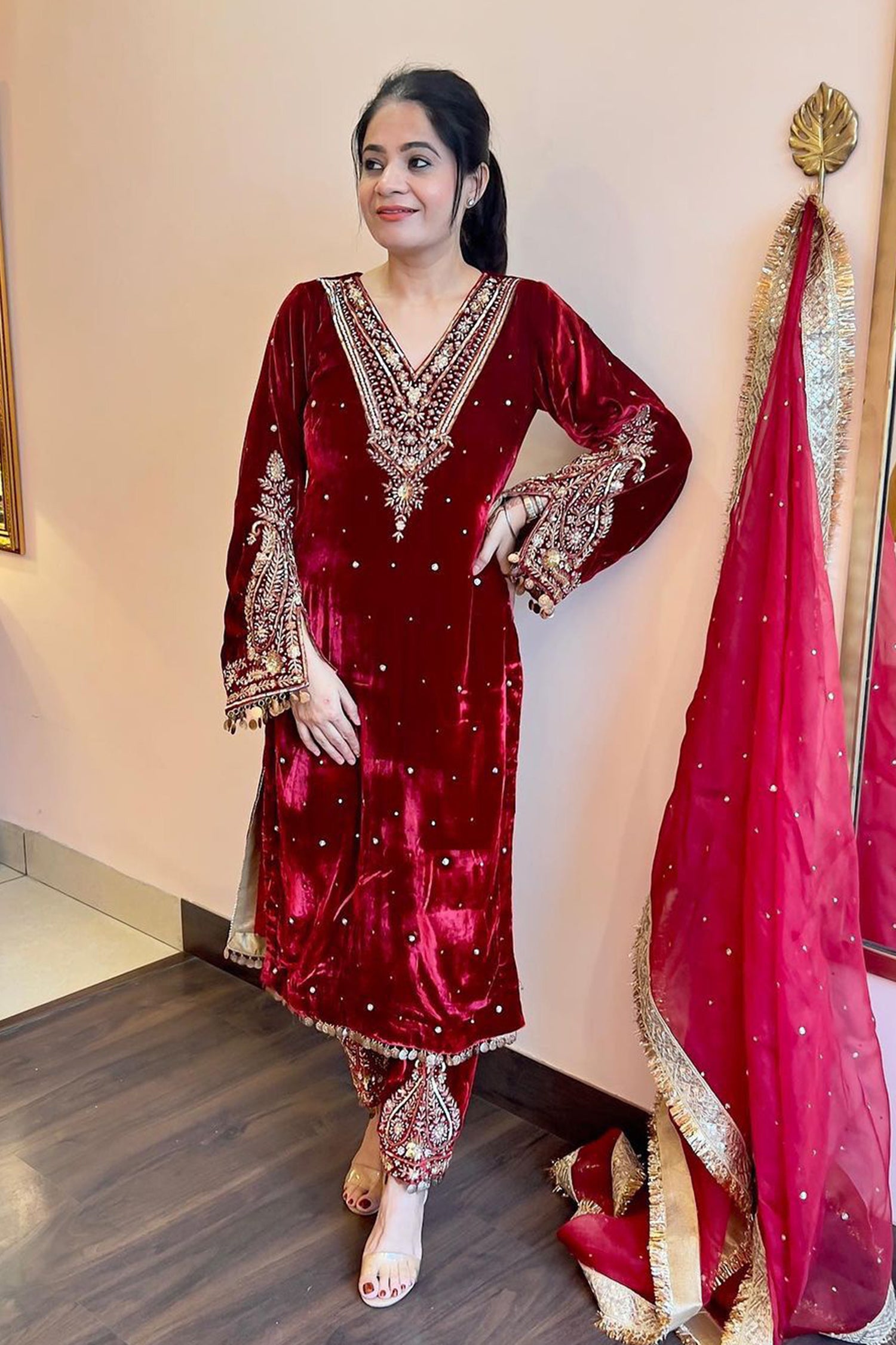 The deep maroon velvet embroidered kurti set with matching pant and a georgette dupatta for an elegant and rich look with trendy and neat finish.