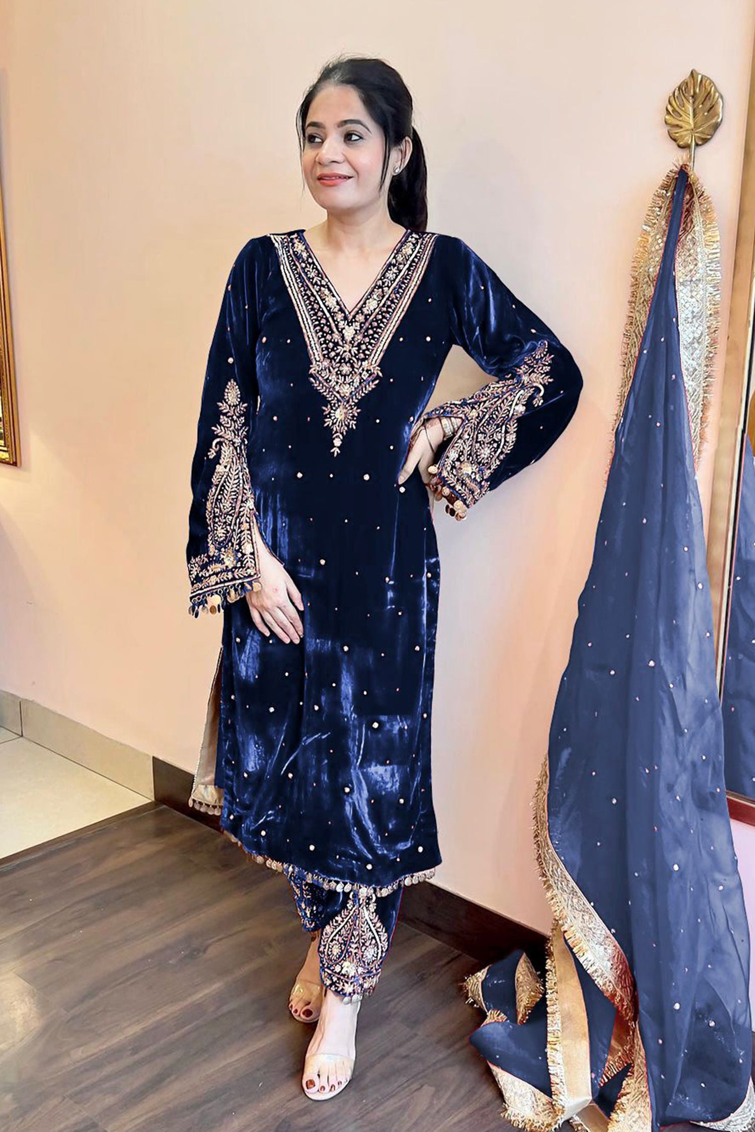 The deep navy blue velvet embroidered kurti set with matching pant and a georgette dupatta for an elegant and rich look with trendy and neat finish.
