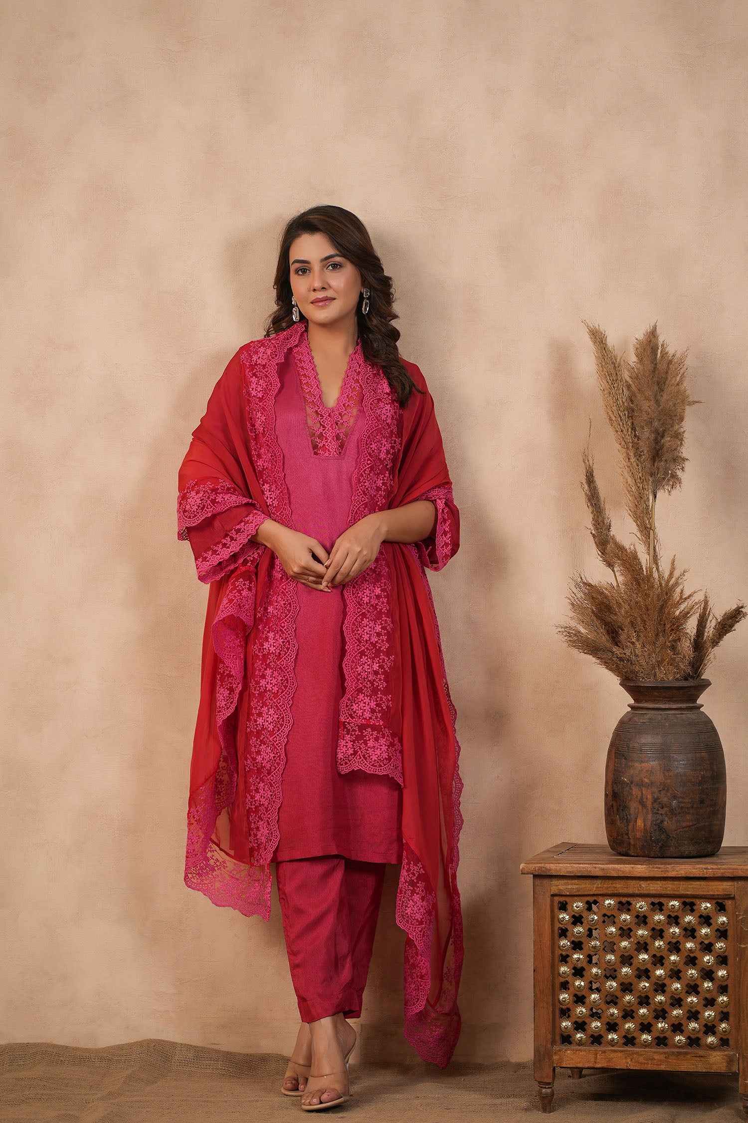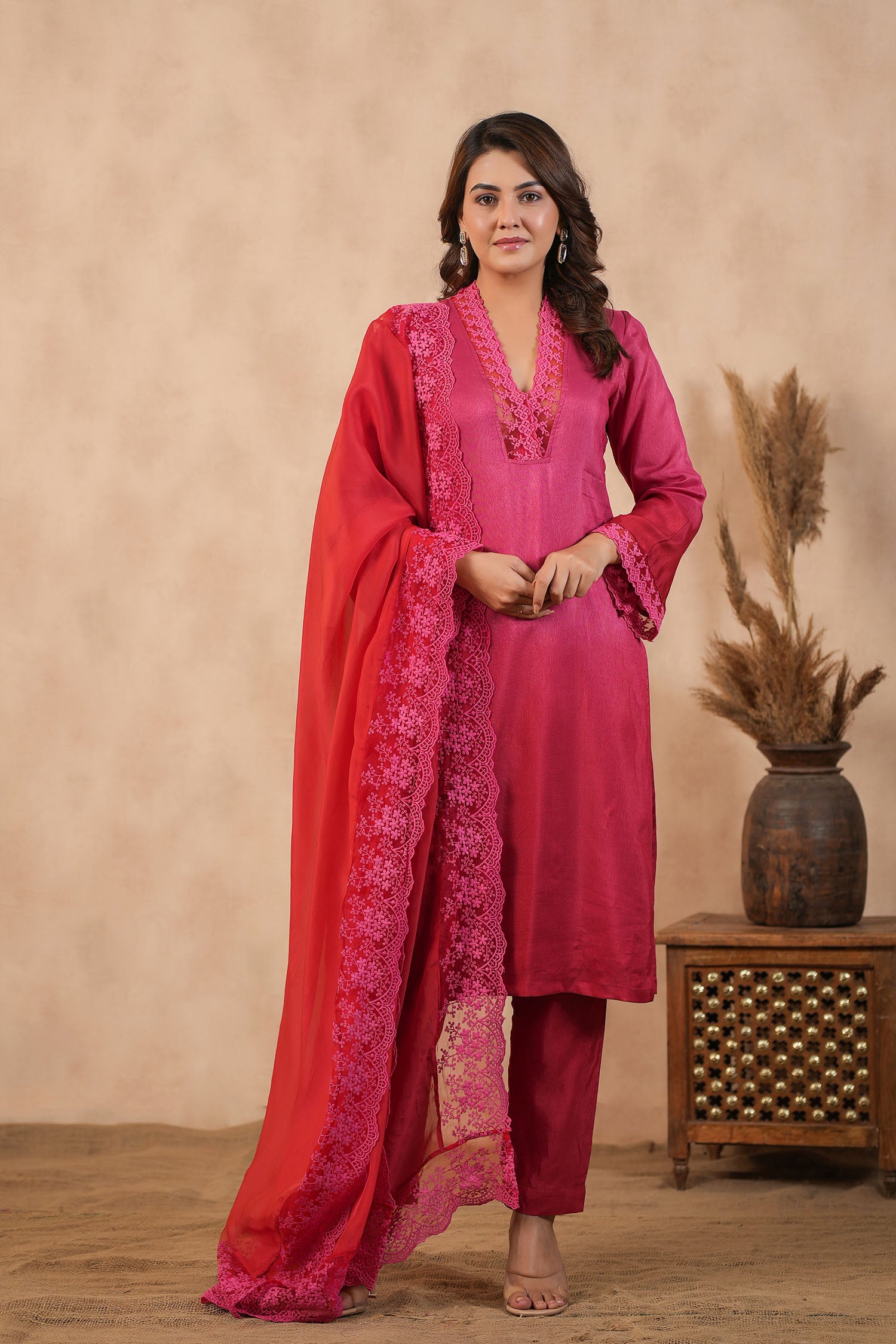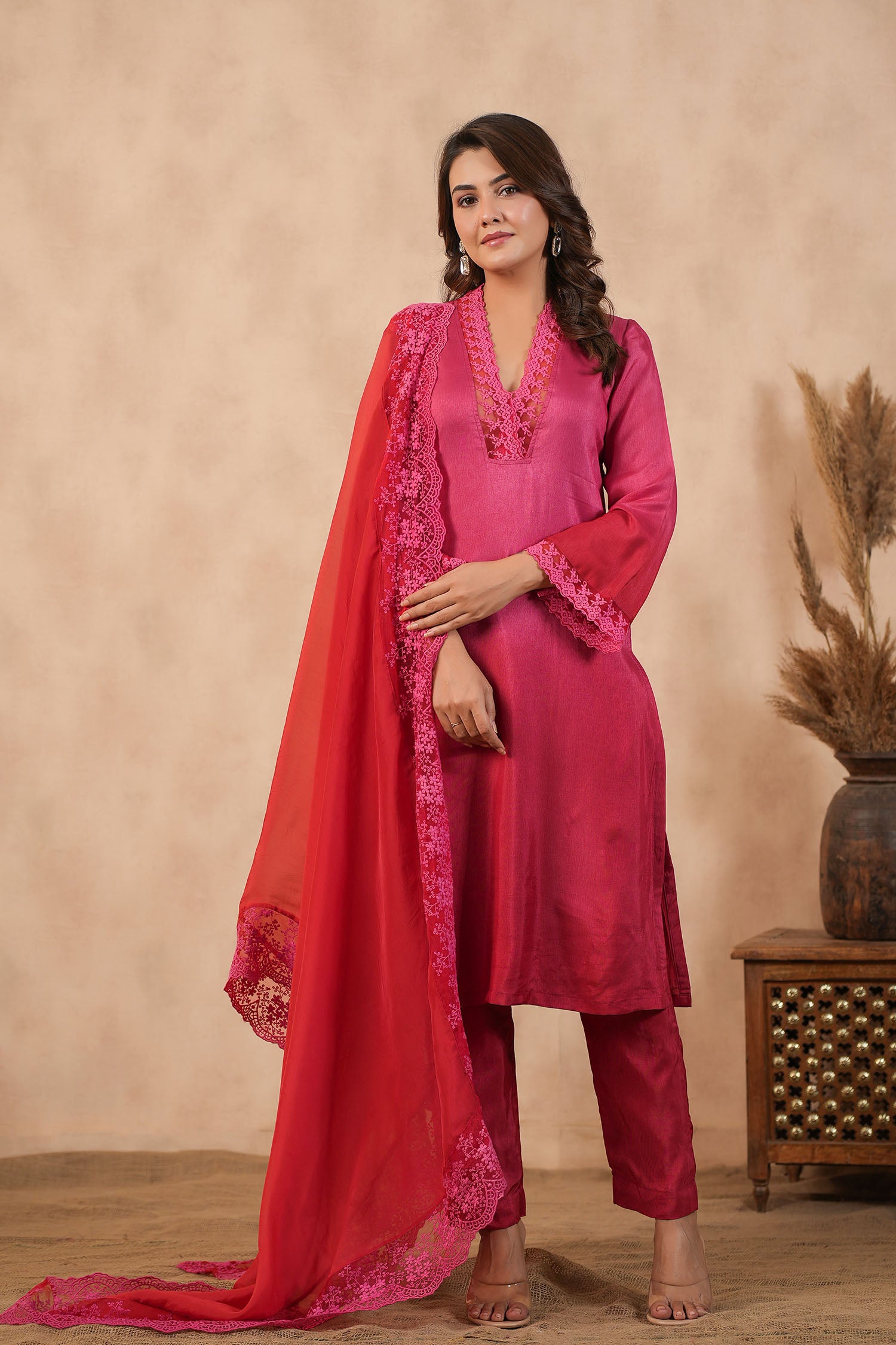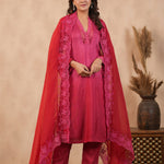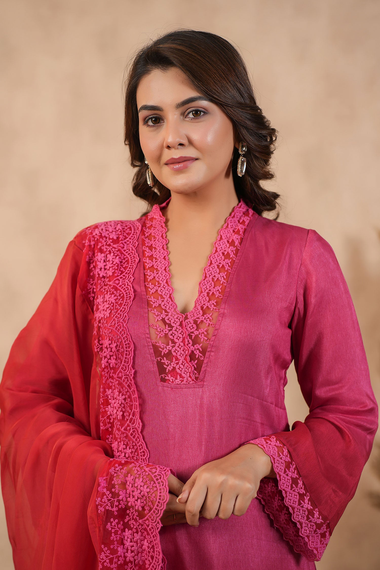 The deep pink russian silk solid kurti set with matching pant and an organza dupatta for an elegant look with subtle charm.