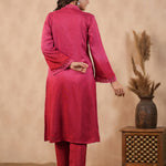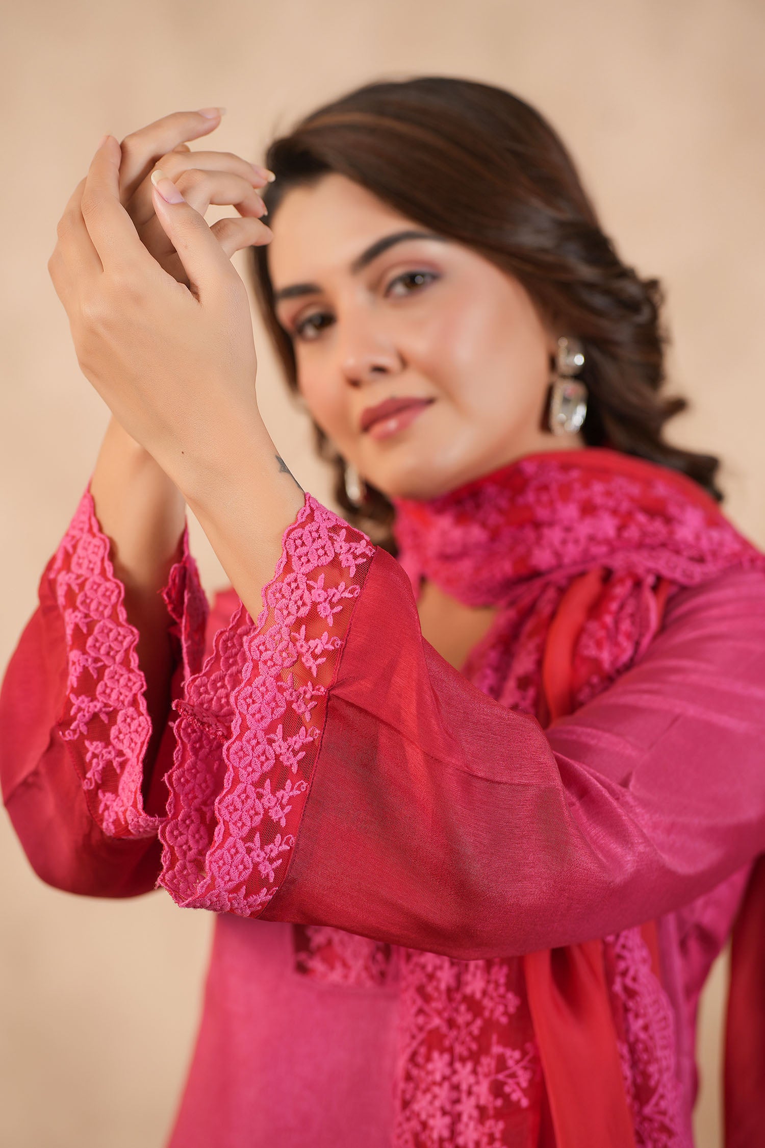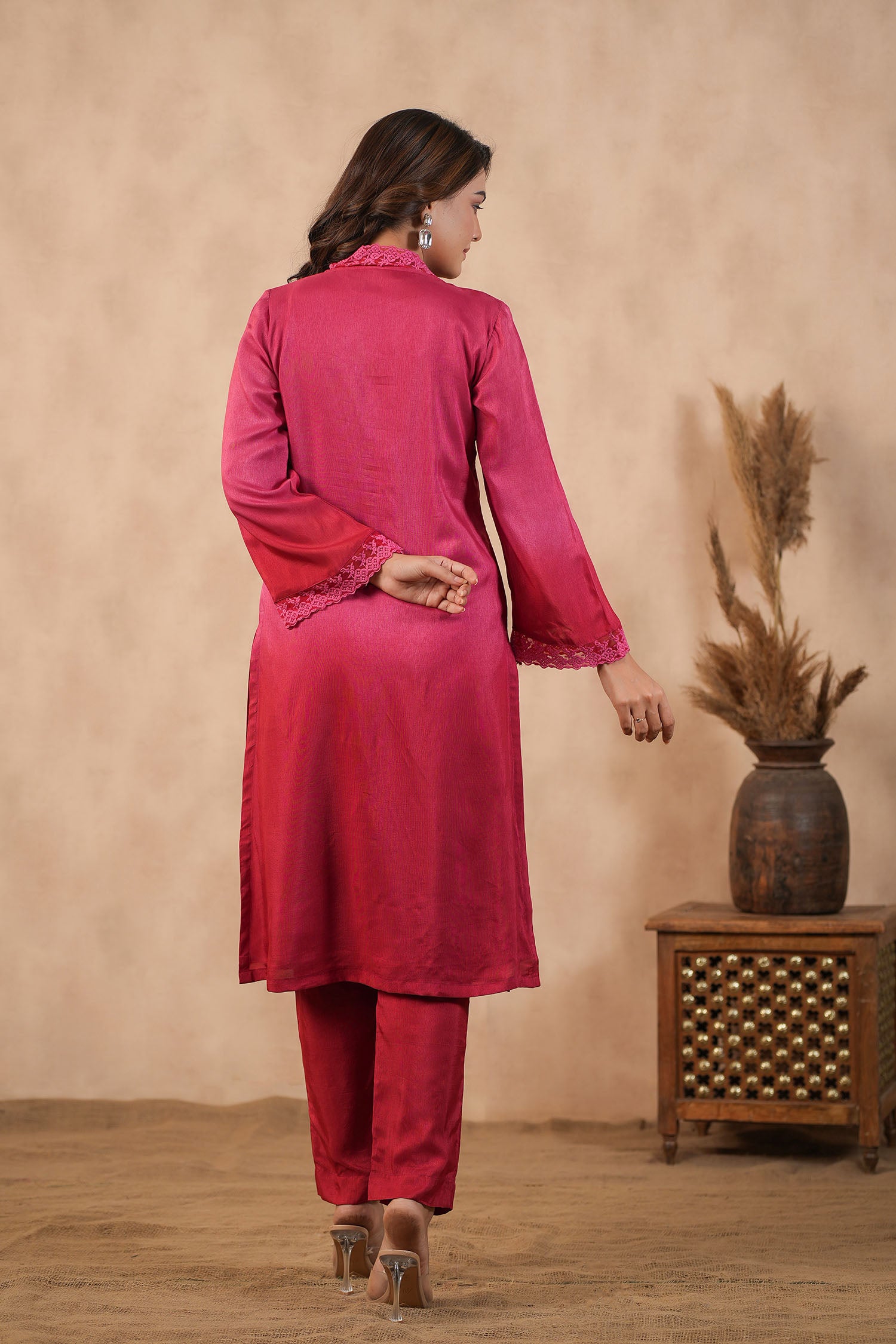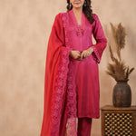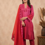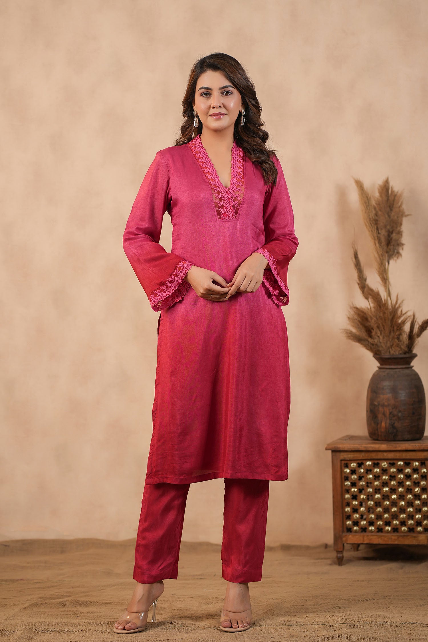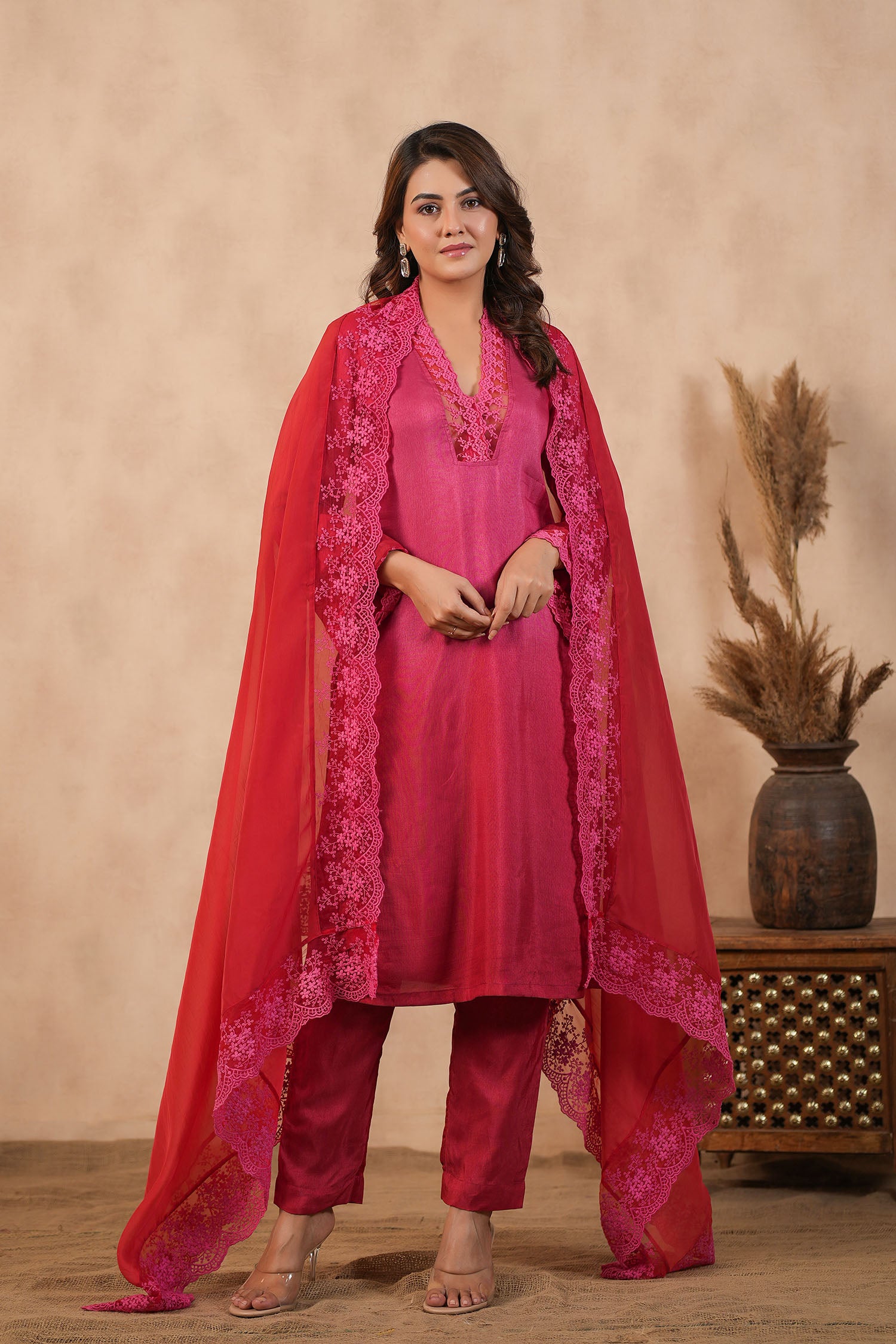 The deep pink russian silk solid kurti set with matching pant and an organza dupatta for an elegant look with subtle charm.