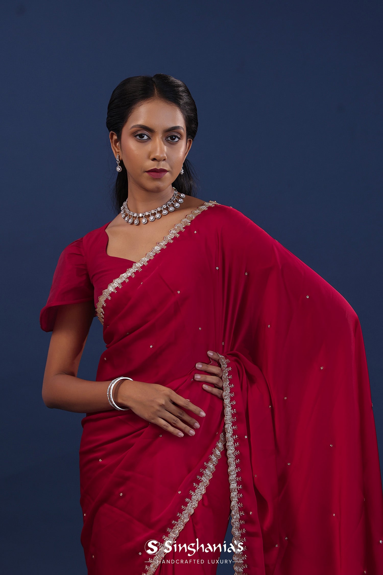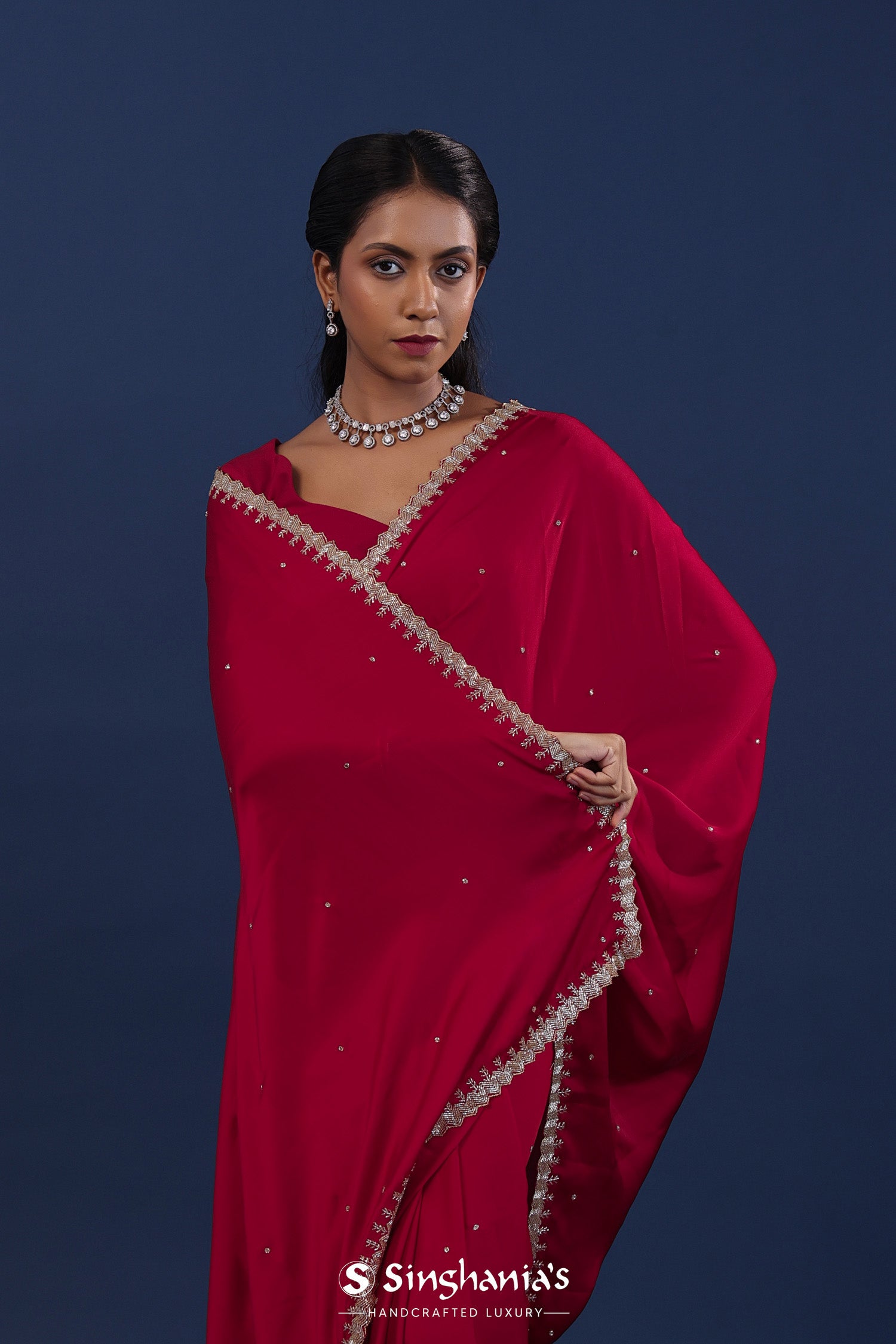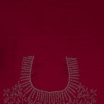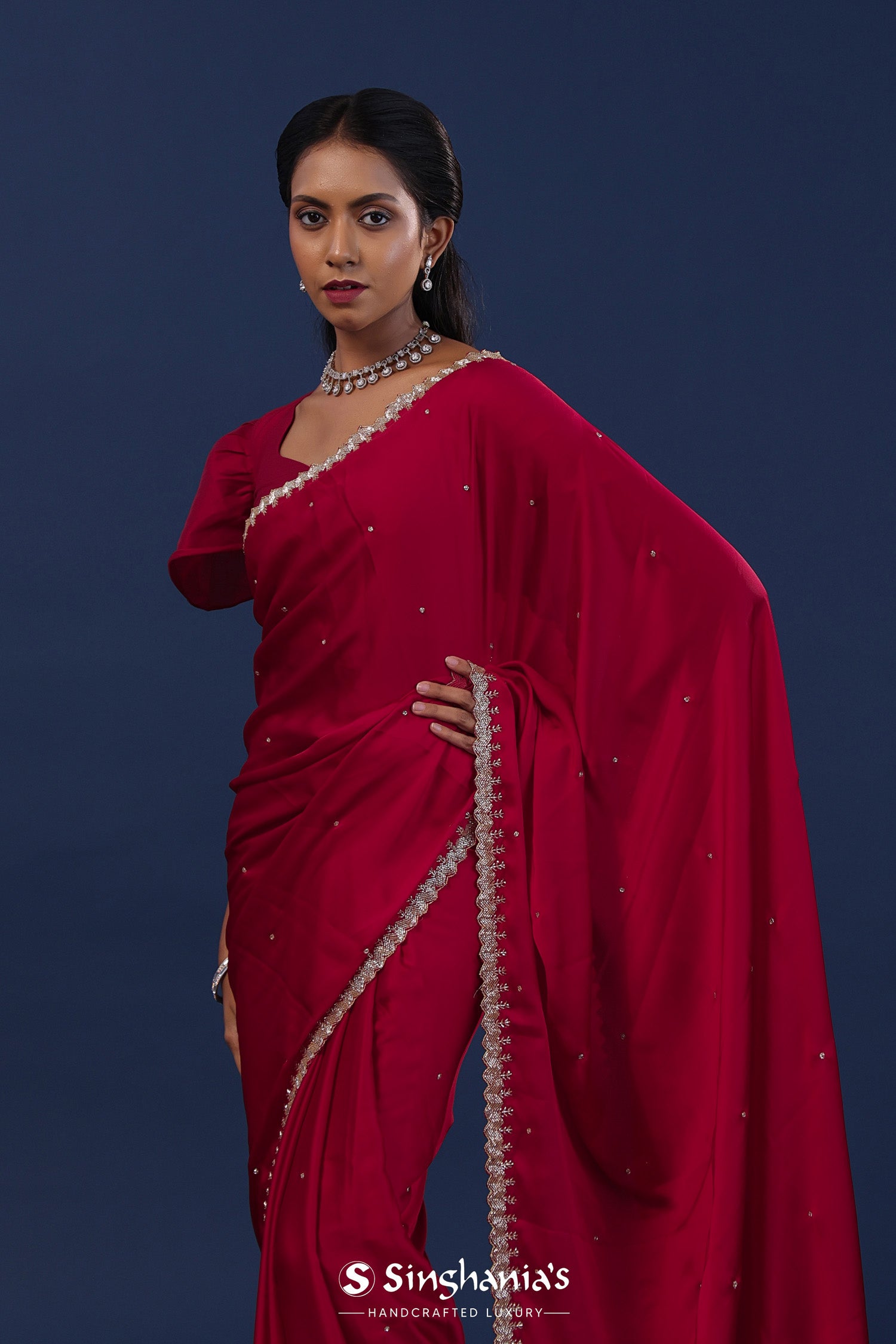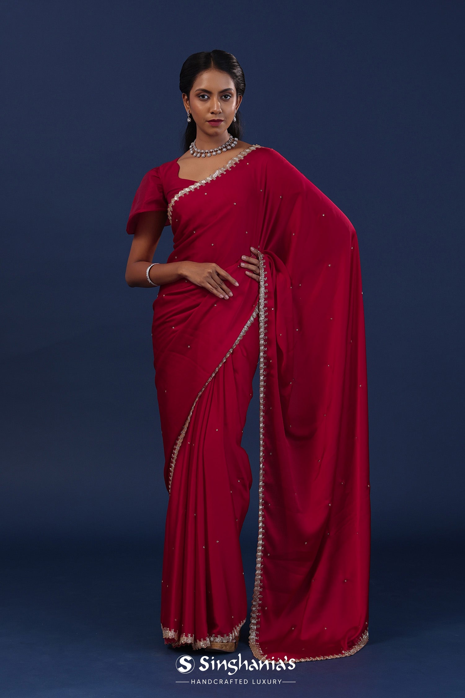 The deep red embroidered satin saree with cutdana work and an unstitched self blouse for a decent and dignified look.