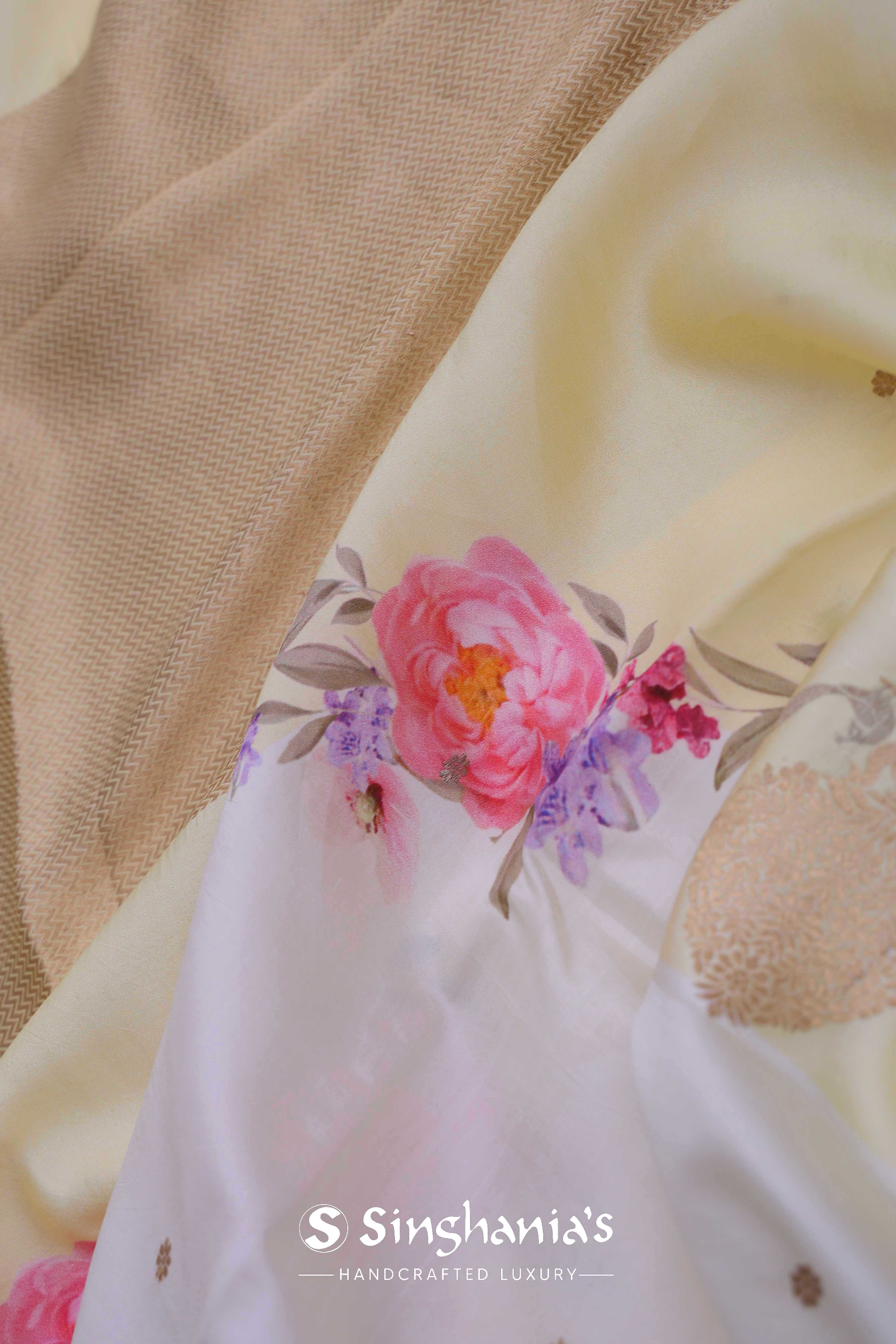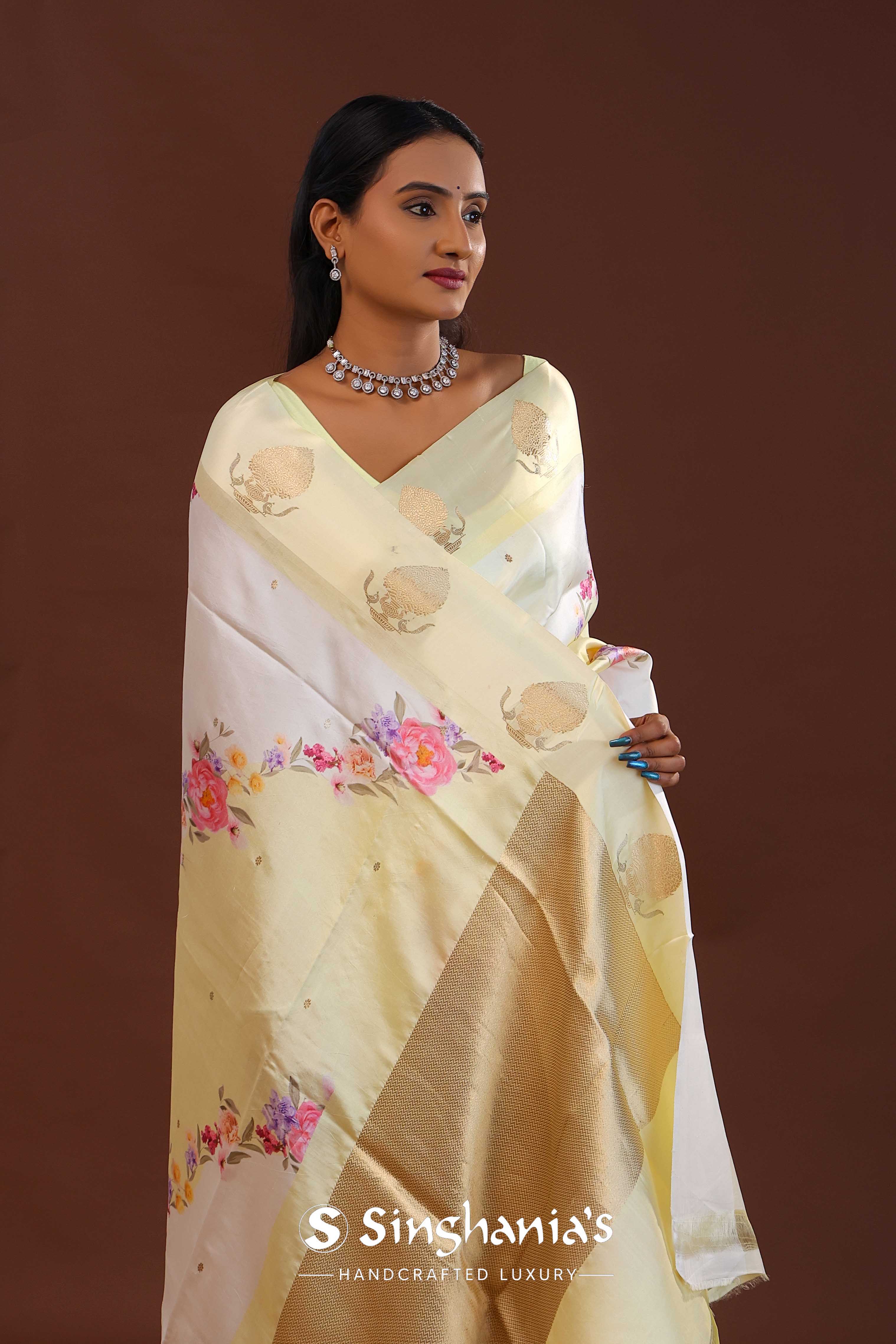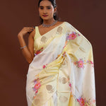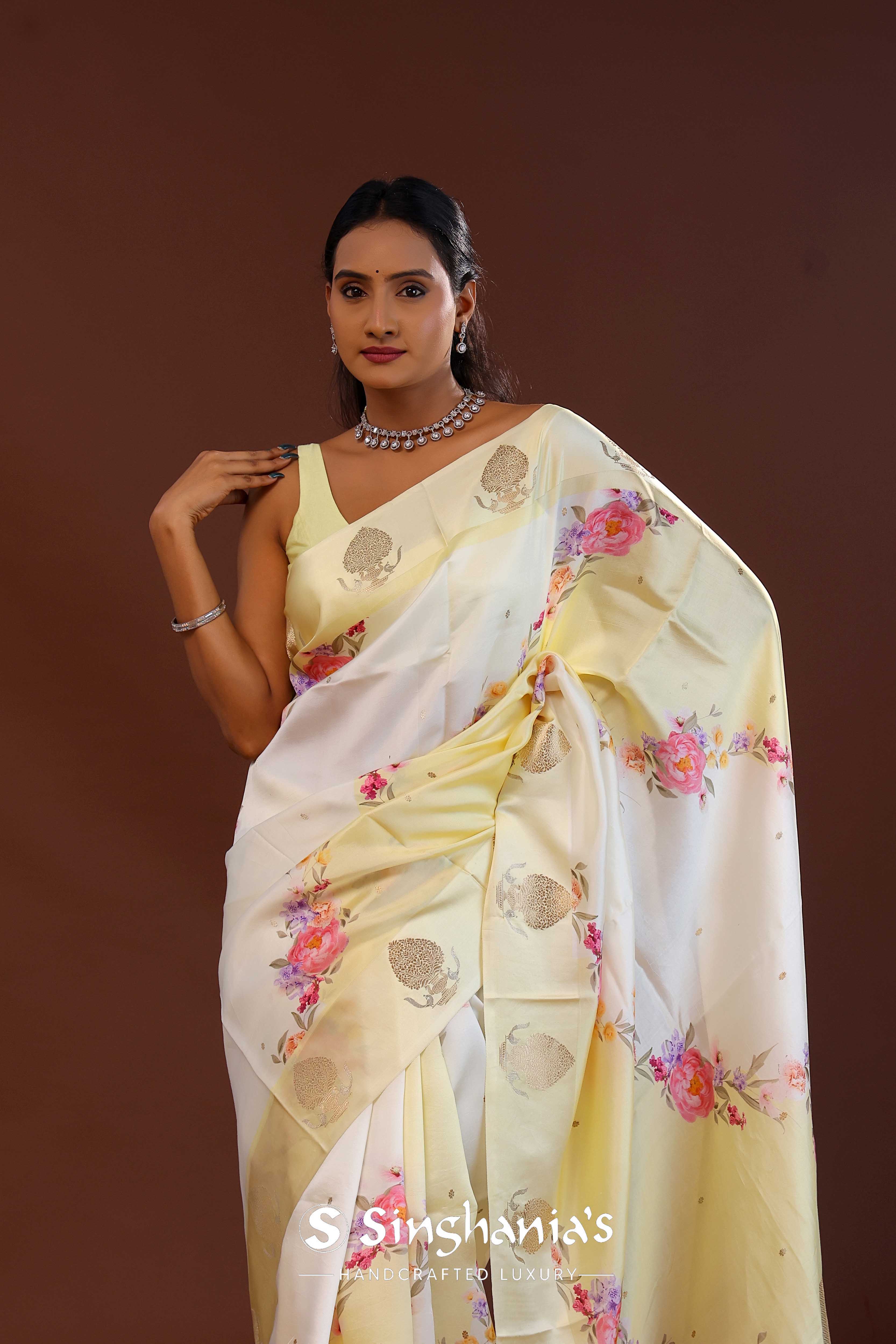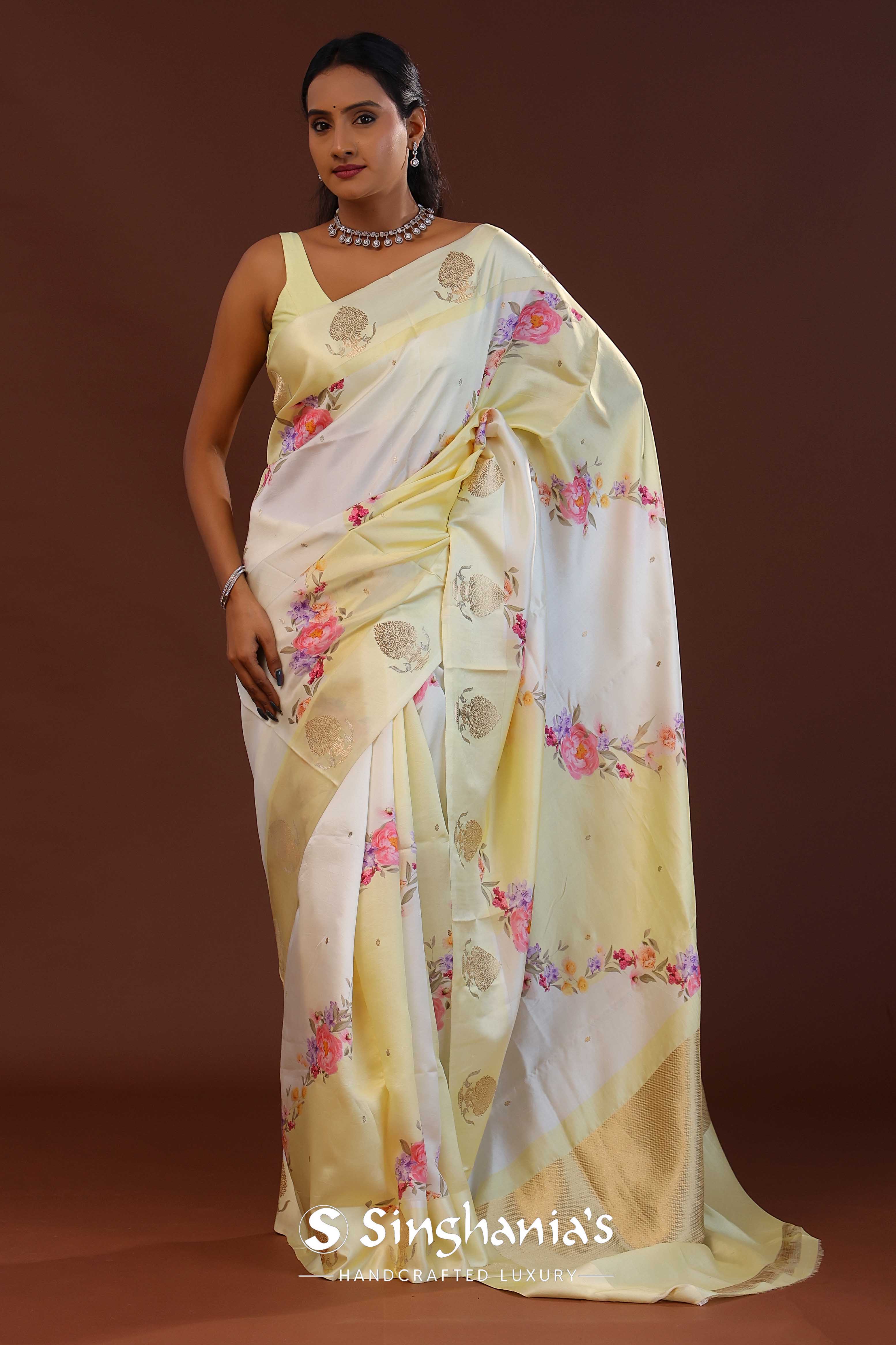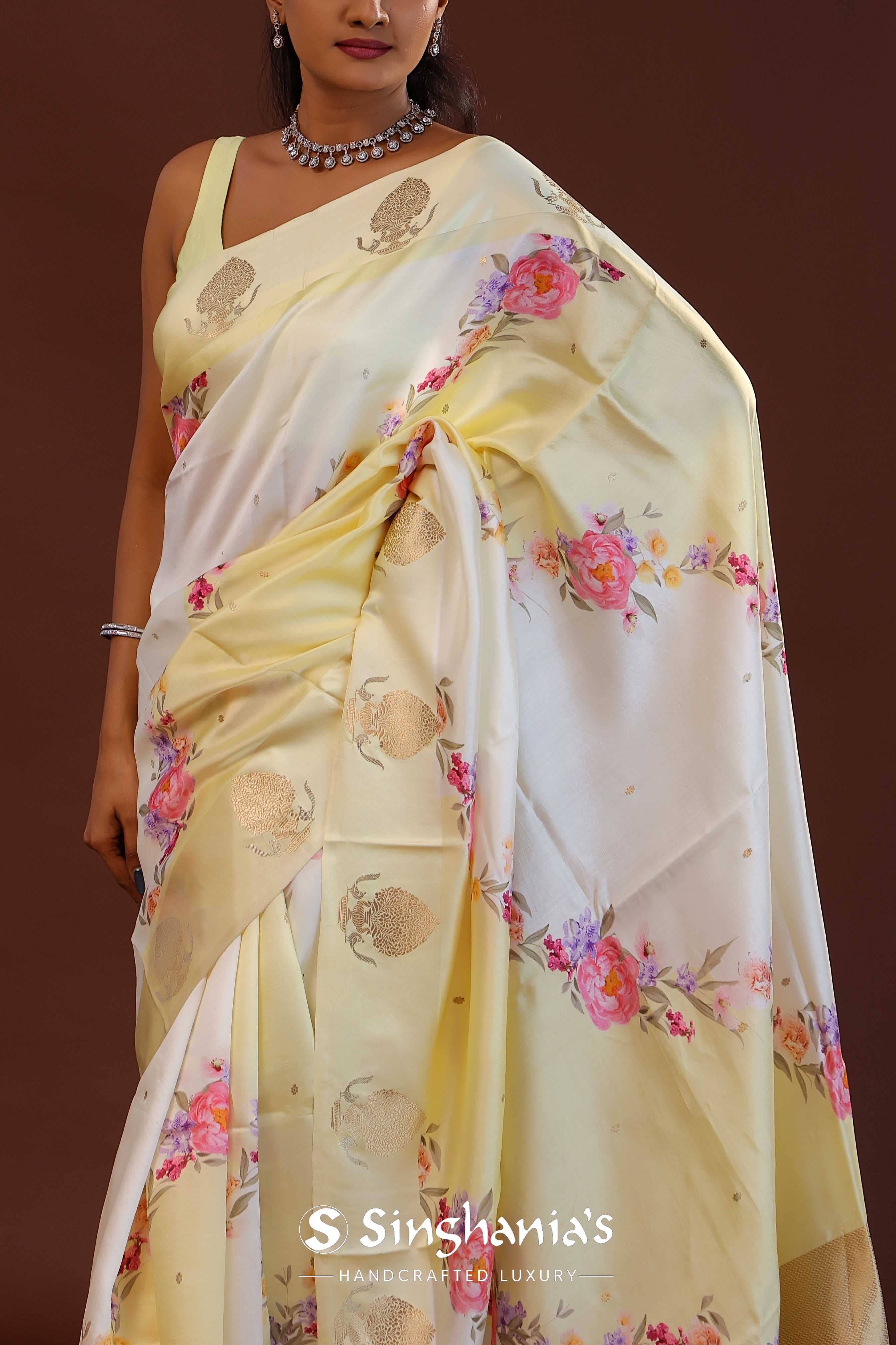 This Dual shade banarasi saree gold zari motifs at border and multi-color floral digital print on body which is ideal choice for formal and informal events.