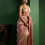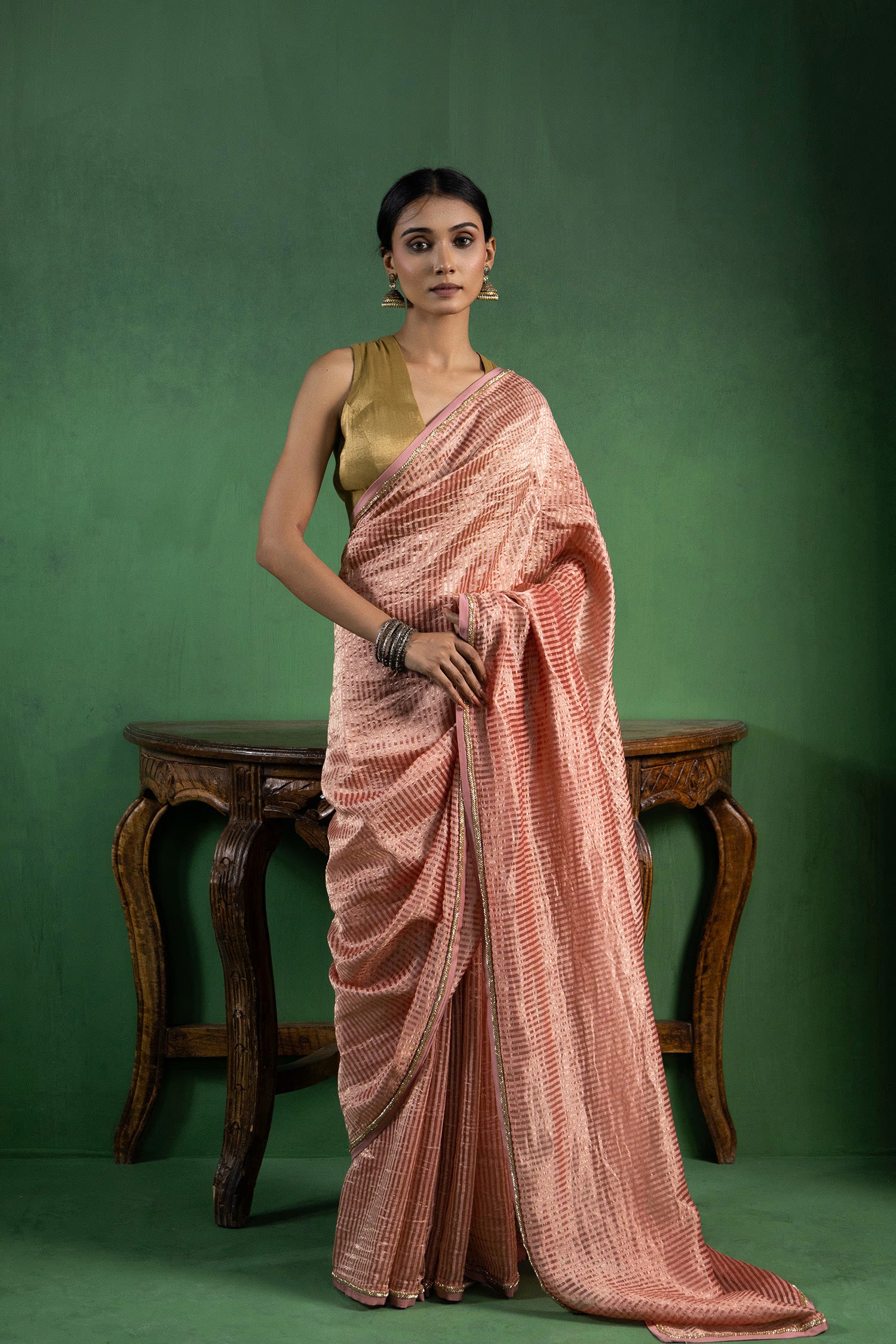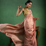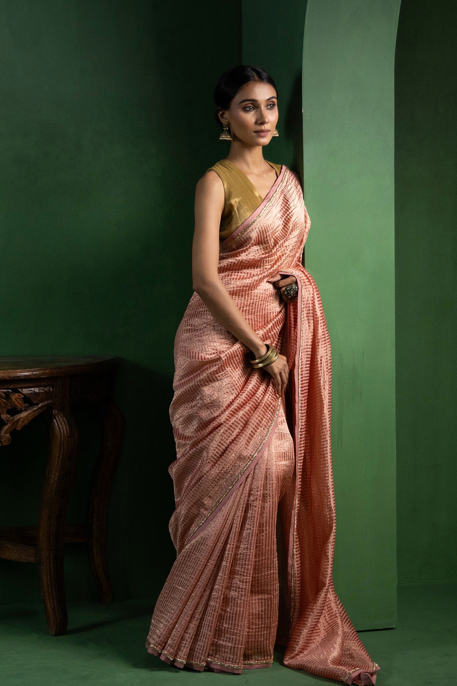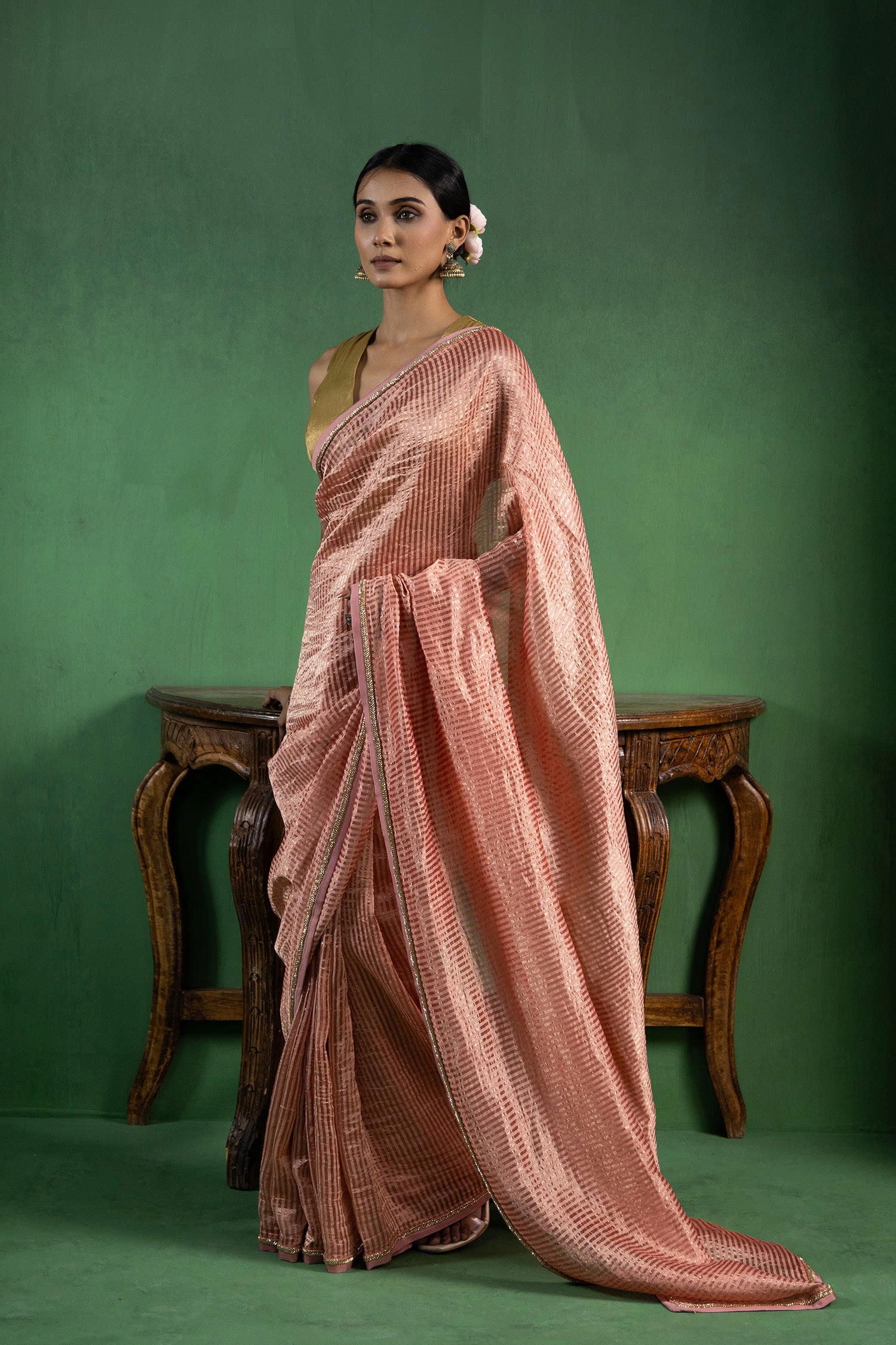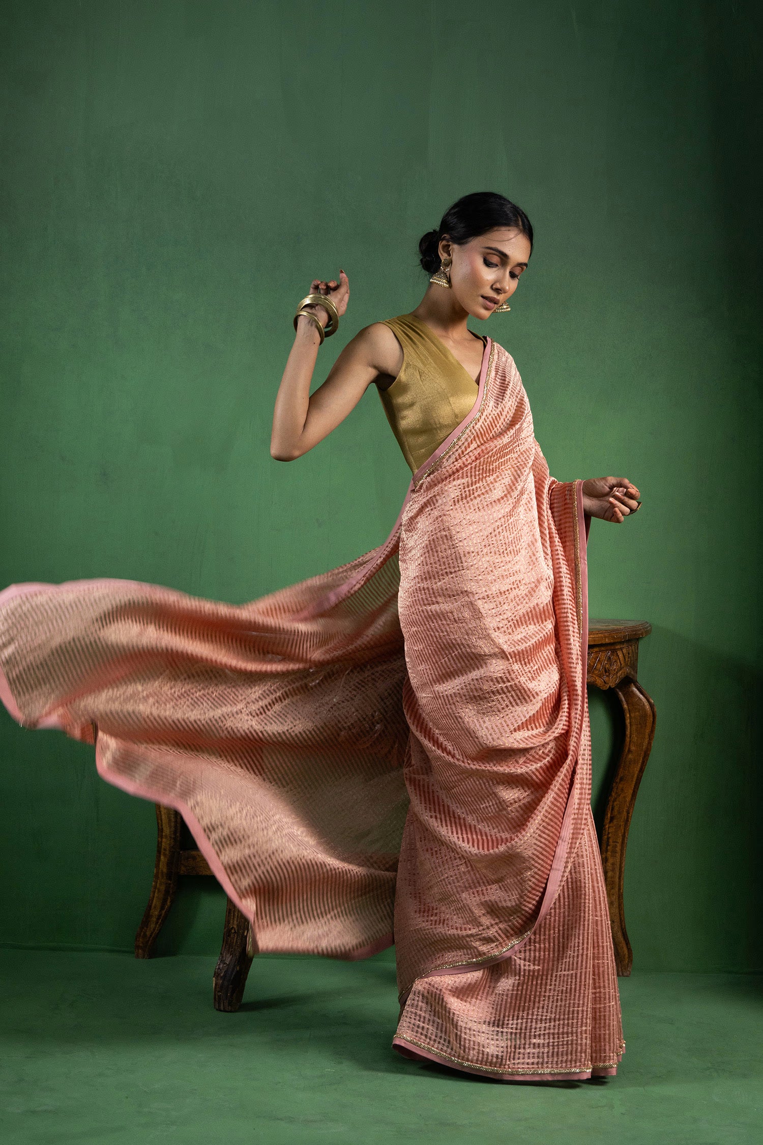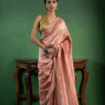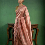 The zari stripes on the body of Dusty pink chanderi saree with scallop border complemented with chanderi jacquard unstitched blouse making it perfect choice for your special occasions .