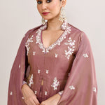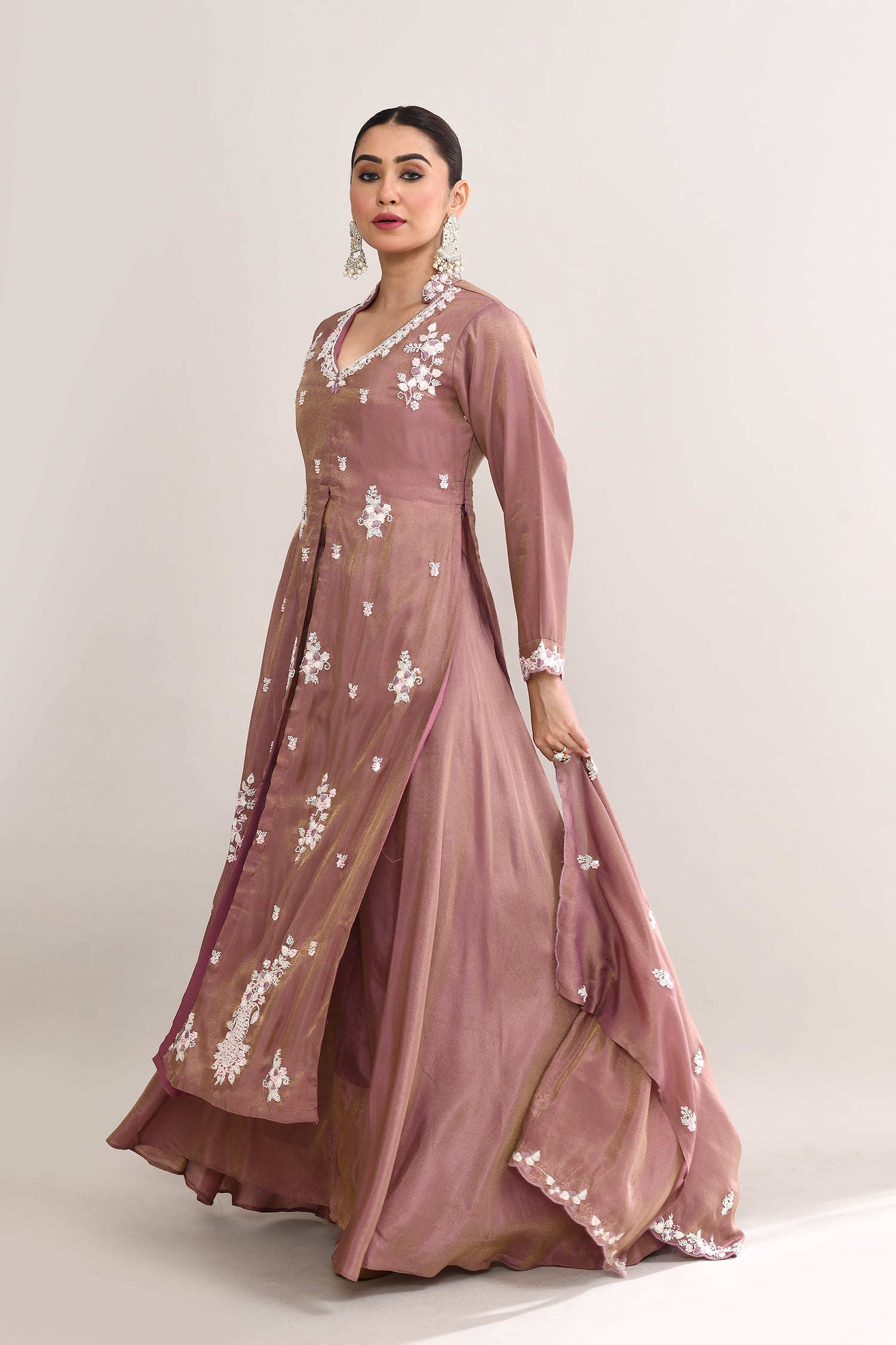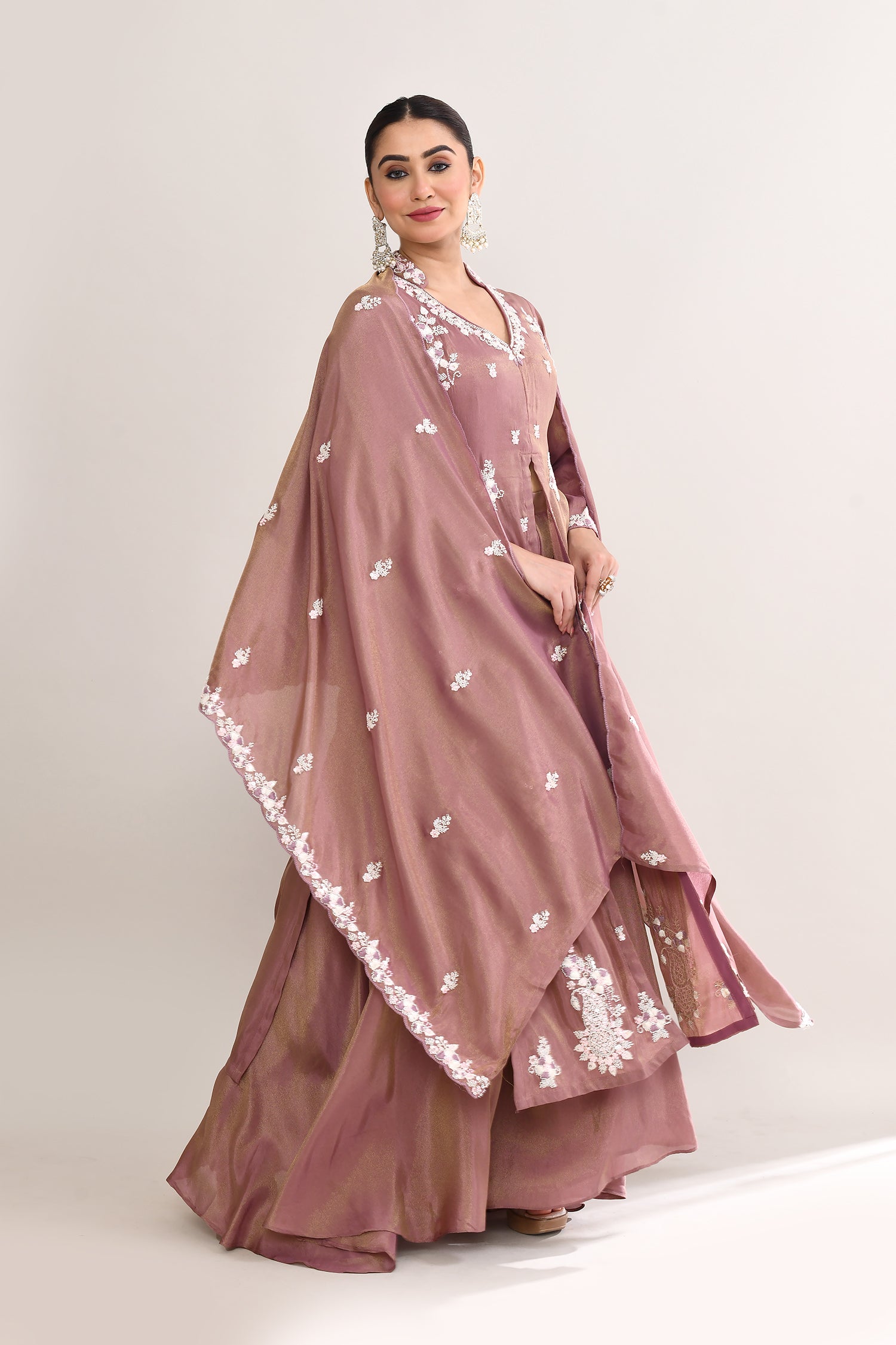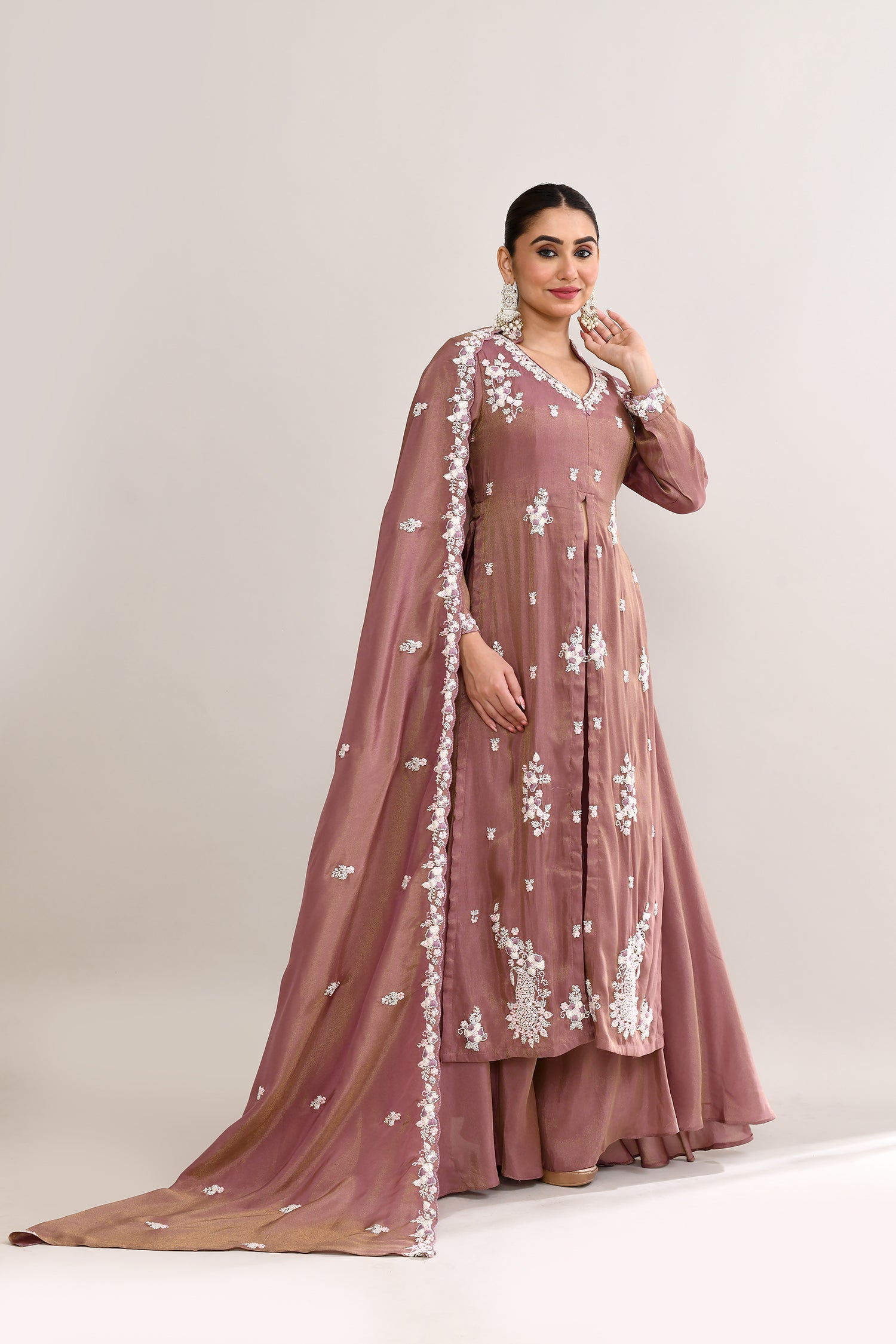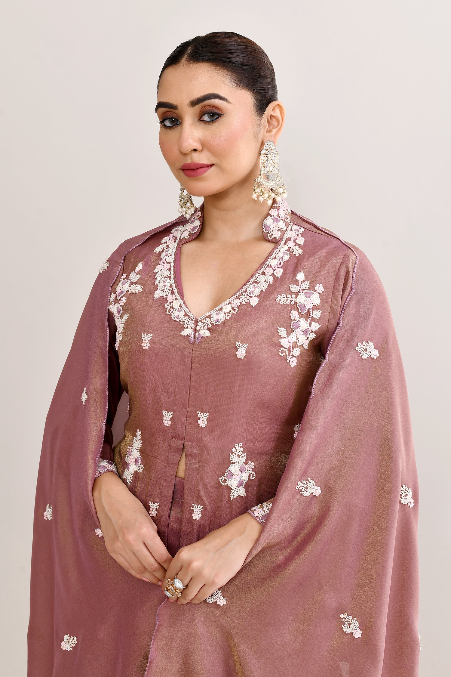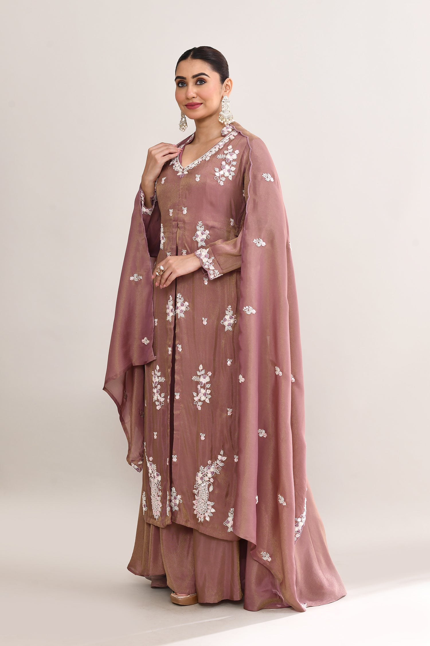 The dusty rose pink tissue georgette palazzo set with thread and pearl work kurti for an amazing look.