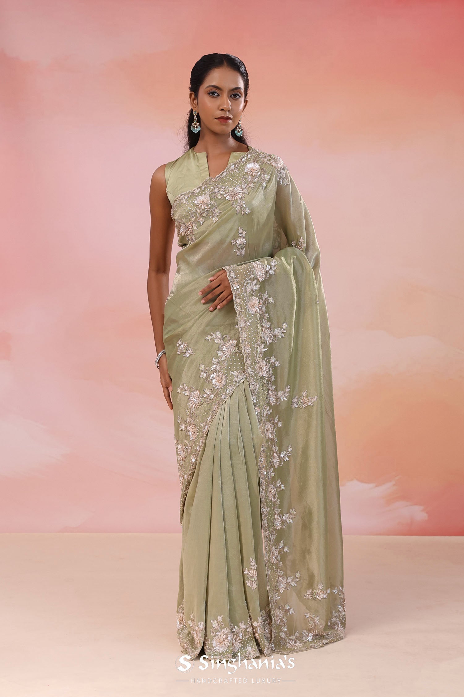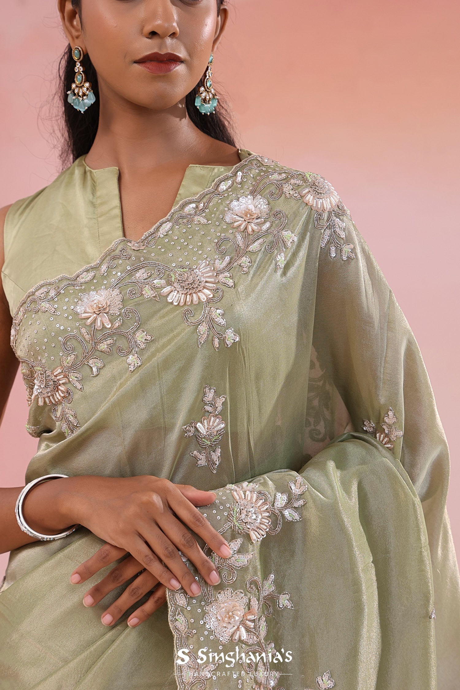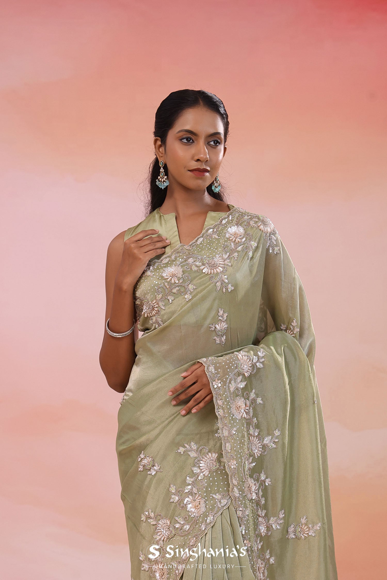 The floral butti's embroidered with sequins and beads work scattered on the body of Earthy sage green georgette tissue saree complemented with fancy border and unstitched blouse