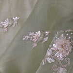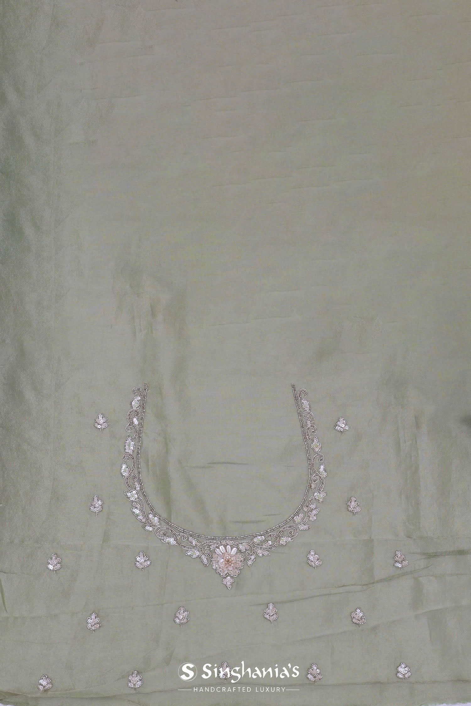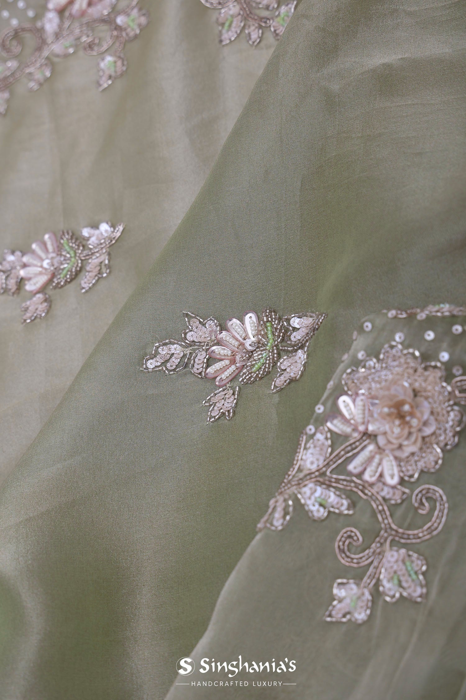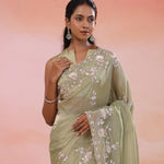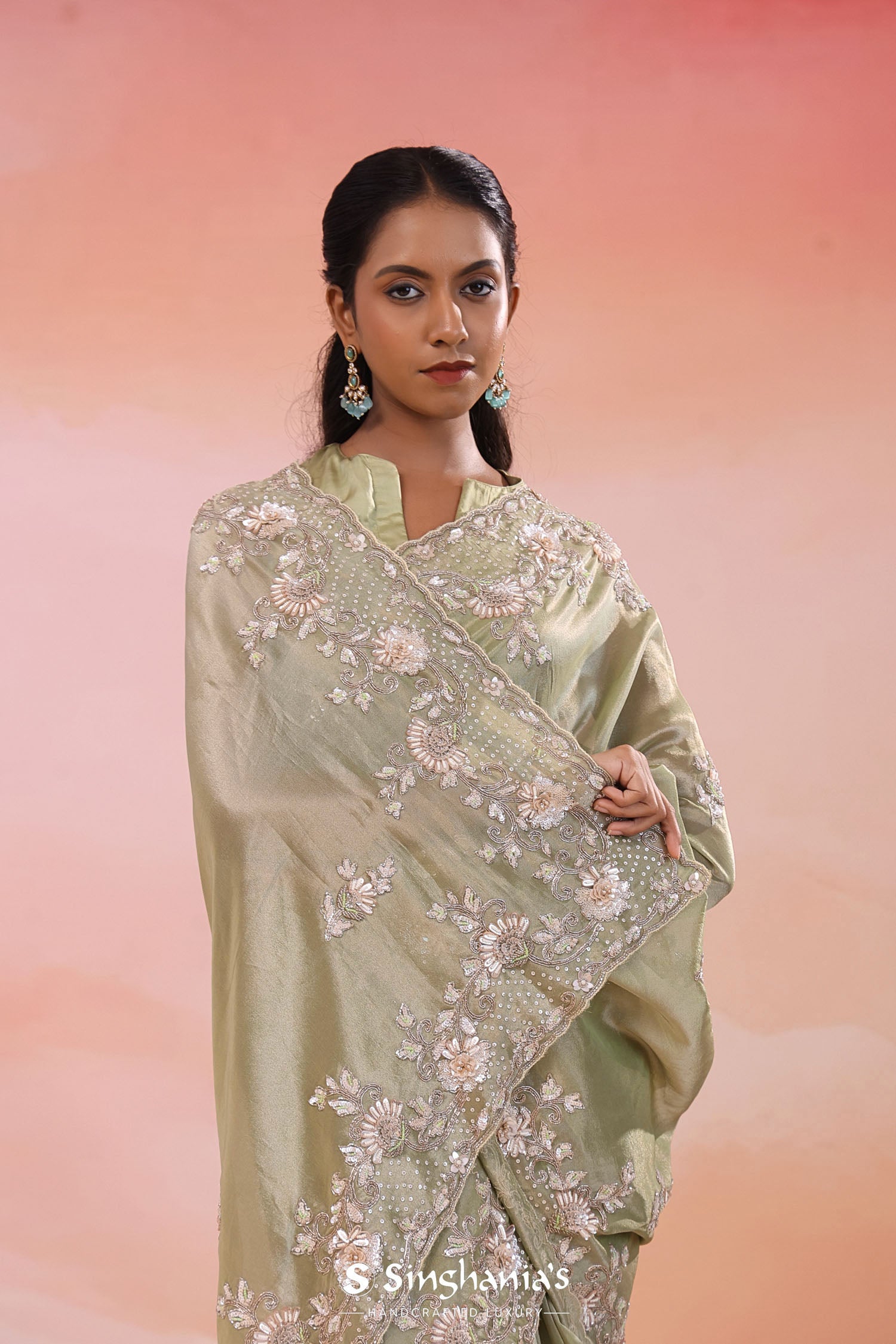 The floral butti's embroidered with sequins and beads work scattered on the body of Earthy sage green georgette tissue saree complemented with fancy border and unstitched blouse