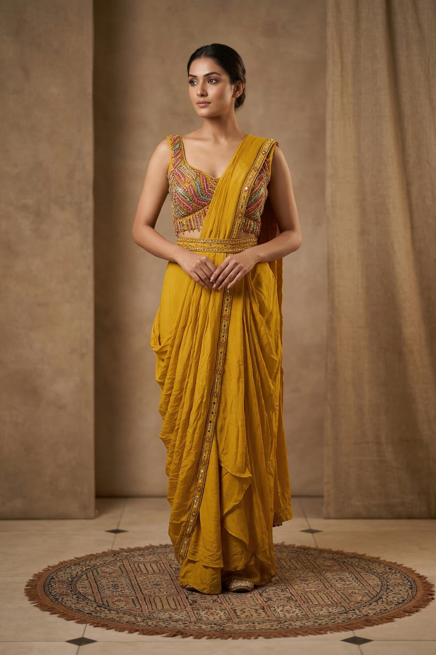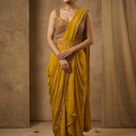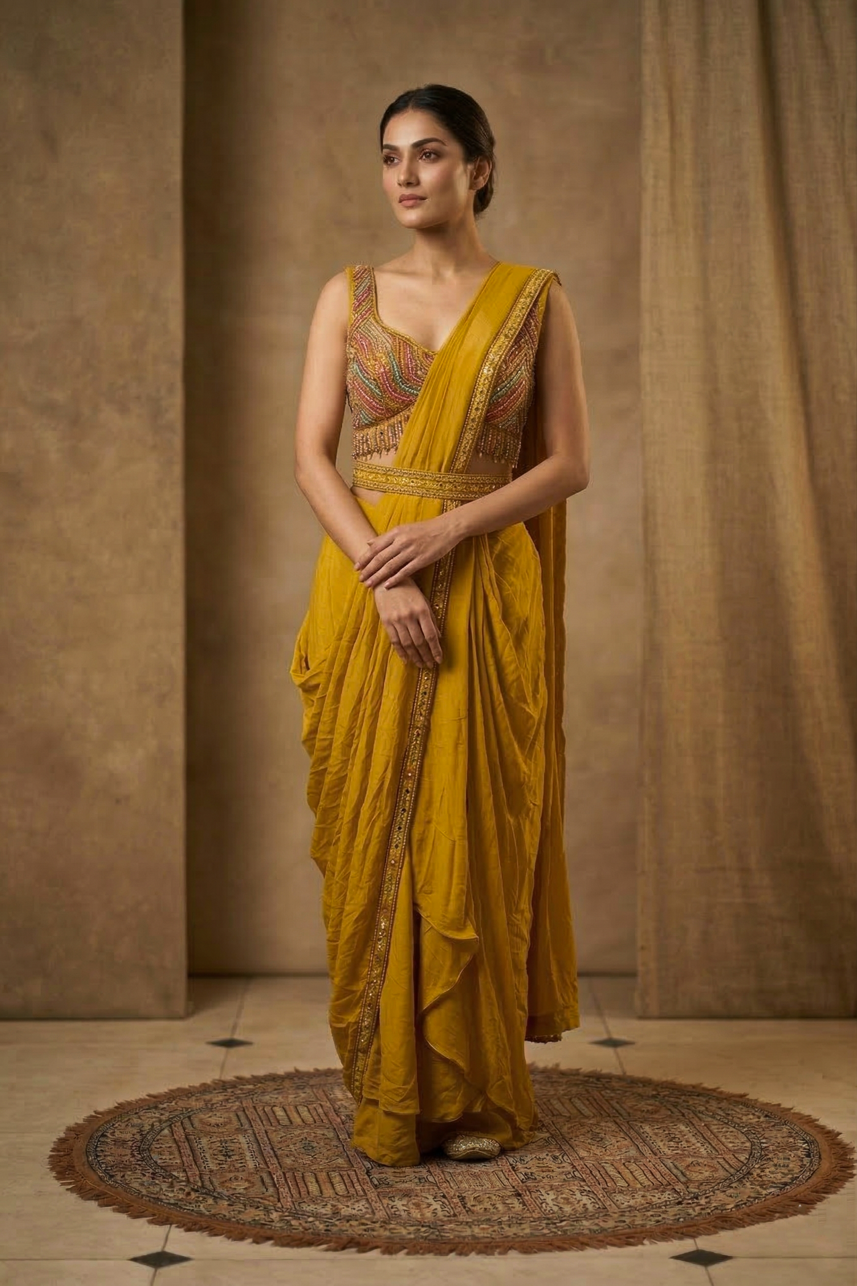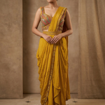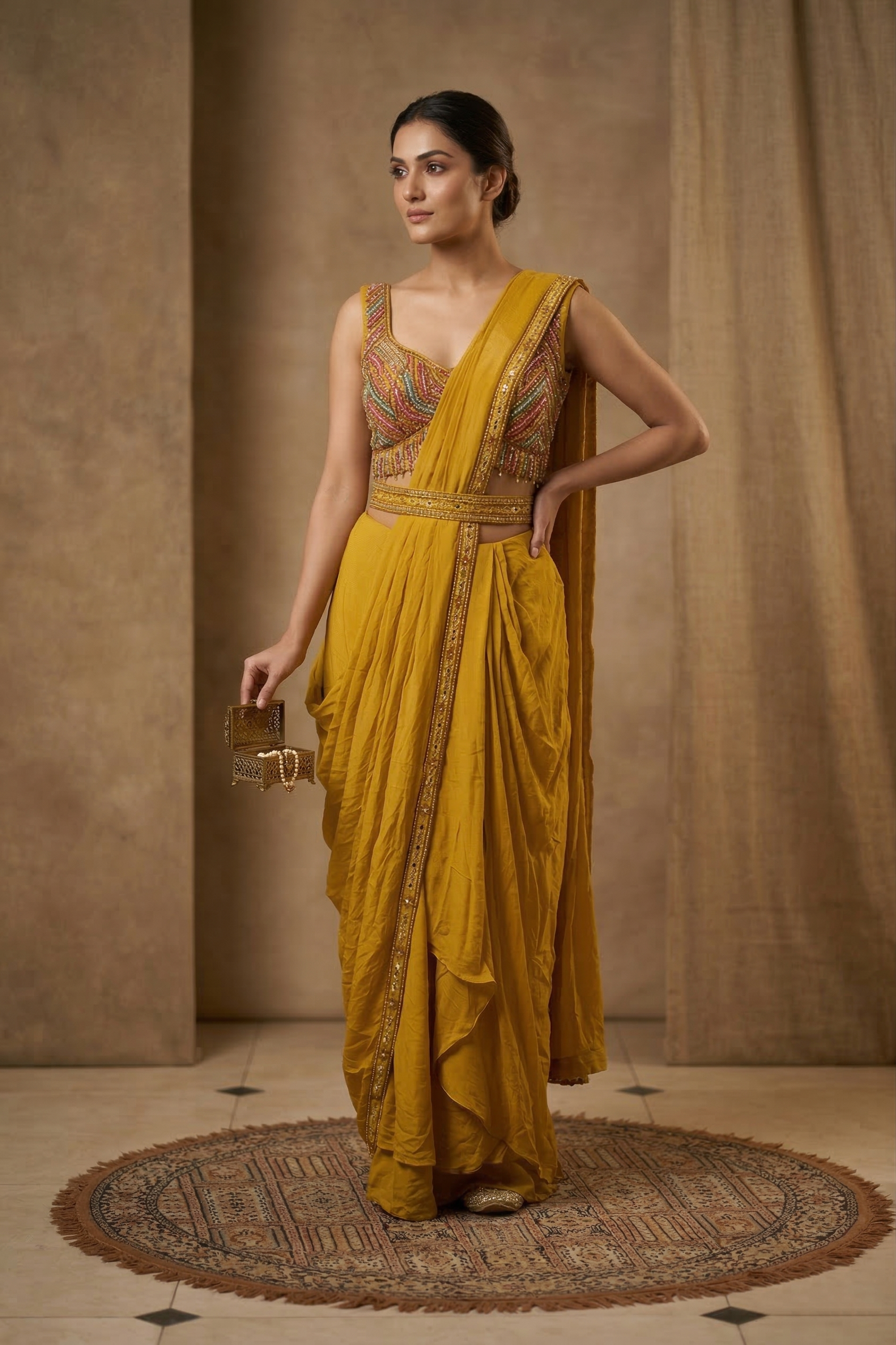 The earthy yellow tissue georgette draped saree with sequin work blouse for an amazing trendy look with elegant appearance.