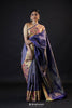 A rich Egyptian Blue Kanjivaram Silk Saree featuring meenakari work and gold zari motif all over the body, and a small border with tilfi embellishments featuring human life. A perfect choice for festive wear and wedding parties.