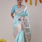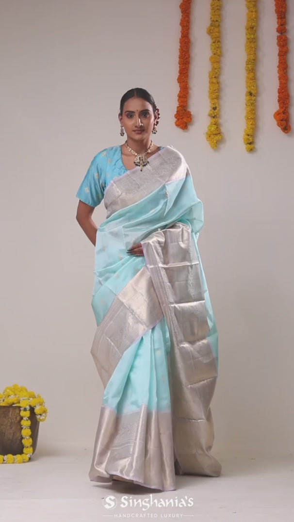 An electric blue kanjivaram silk saree where the body features delicate peacock motif in gold zari, complemented by a rich pallu displaying classical floral motifs. The contrasting silver border features floral and fauna motifs. Perfect choice for special occasions.