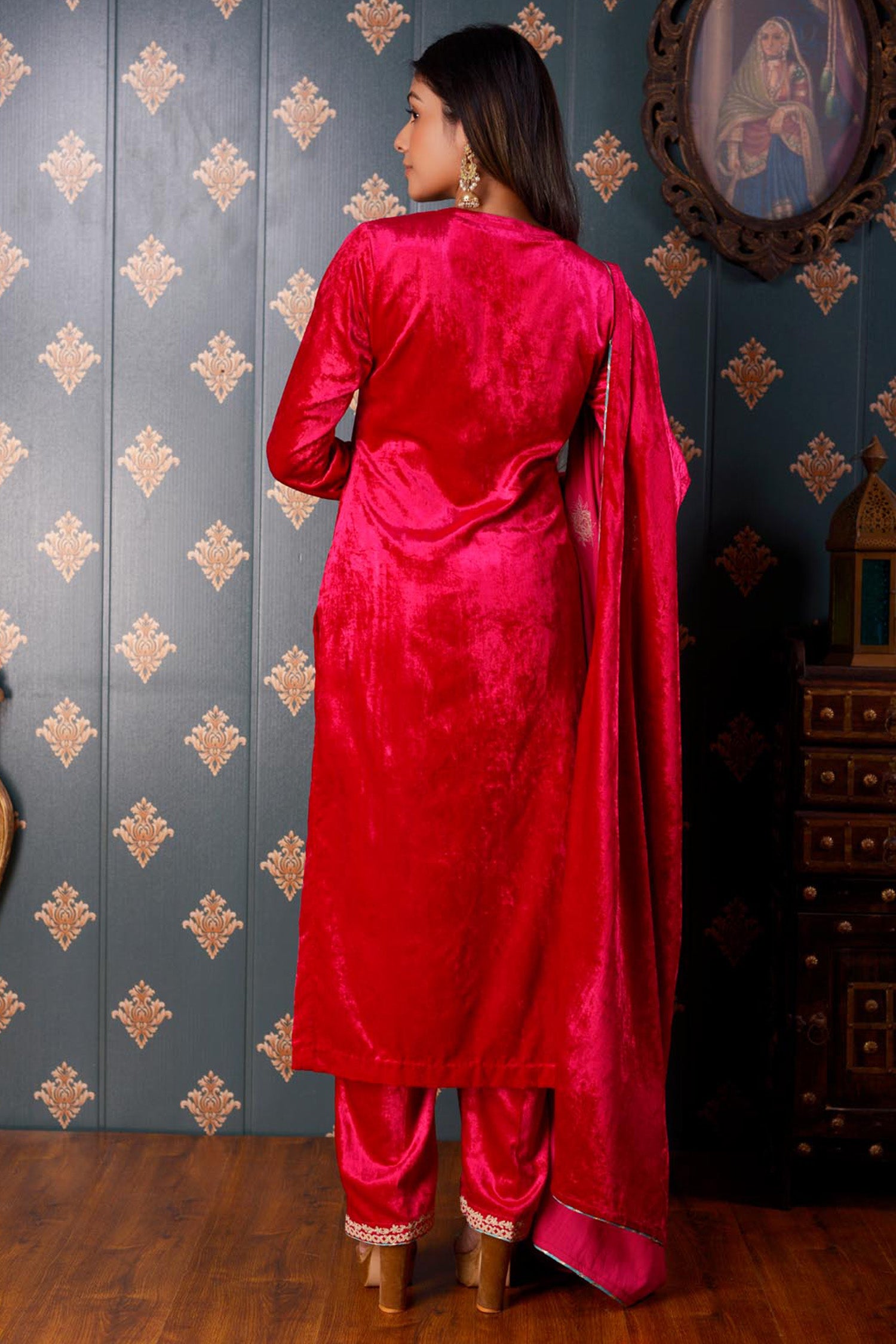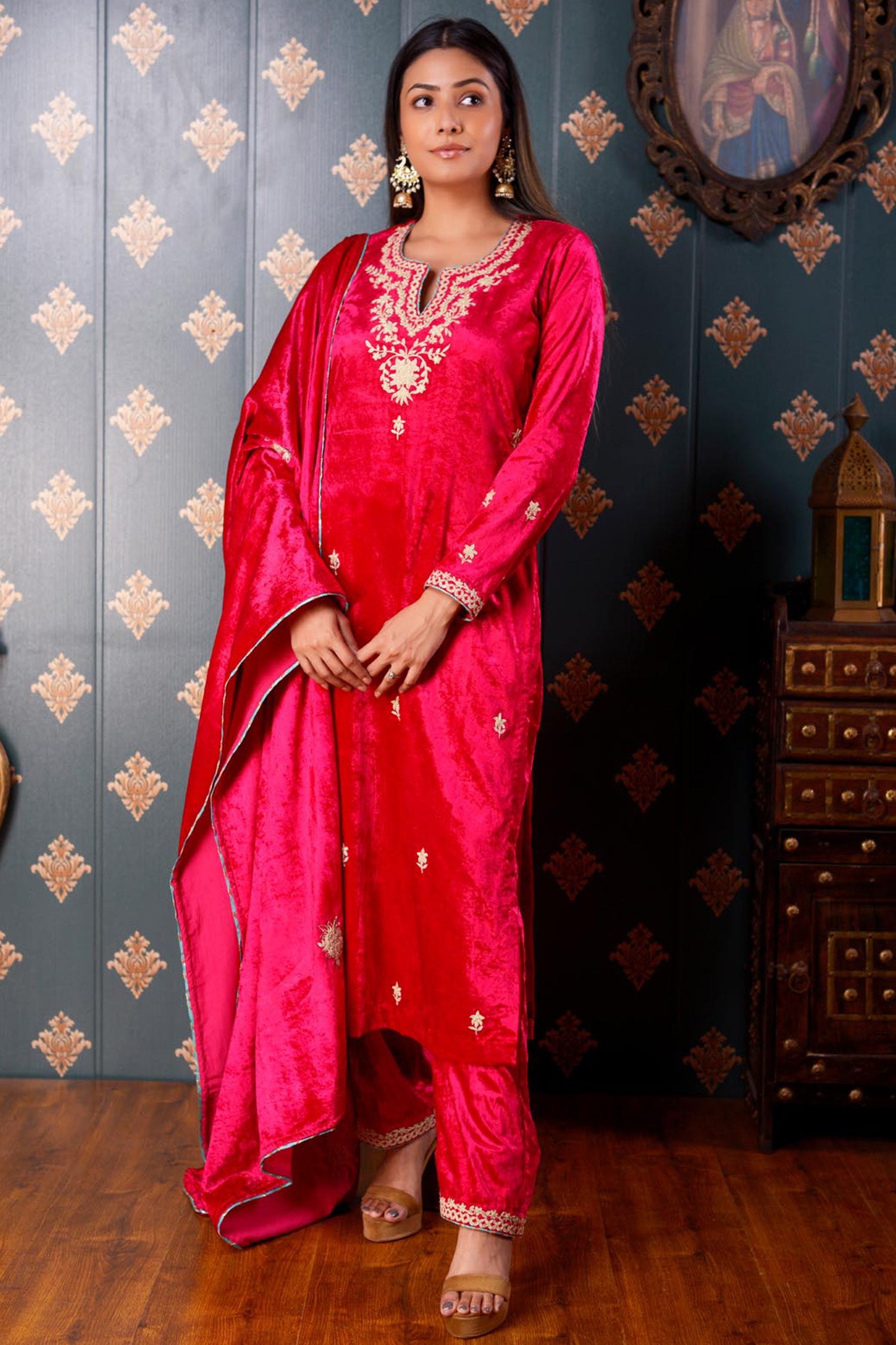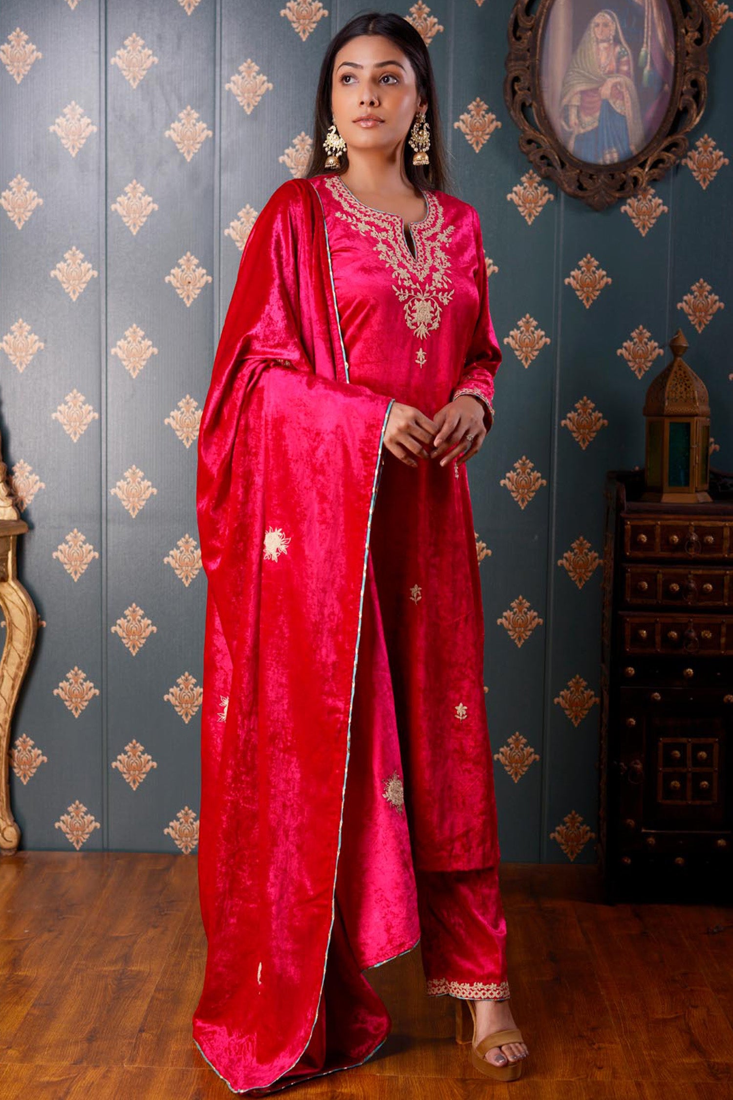 The three piece Velvet set includes Dark Pink Embroidered Neck Kurta ,Pant And Dupatta With Lace Finish for a rich and beautiful look with elegance.