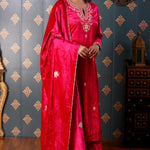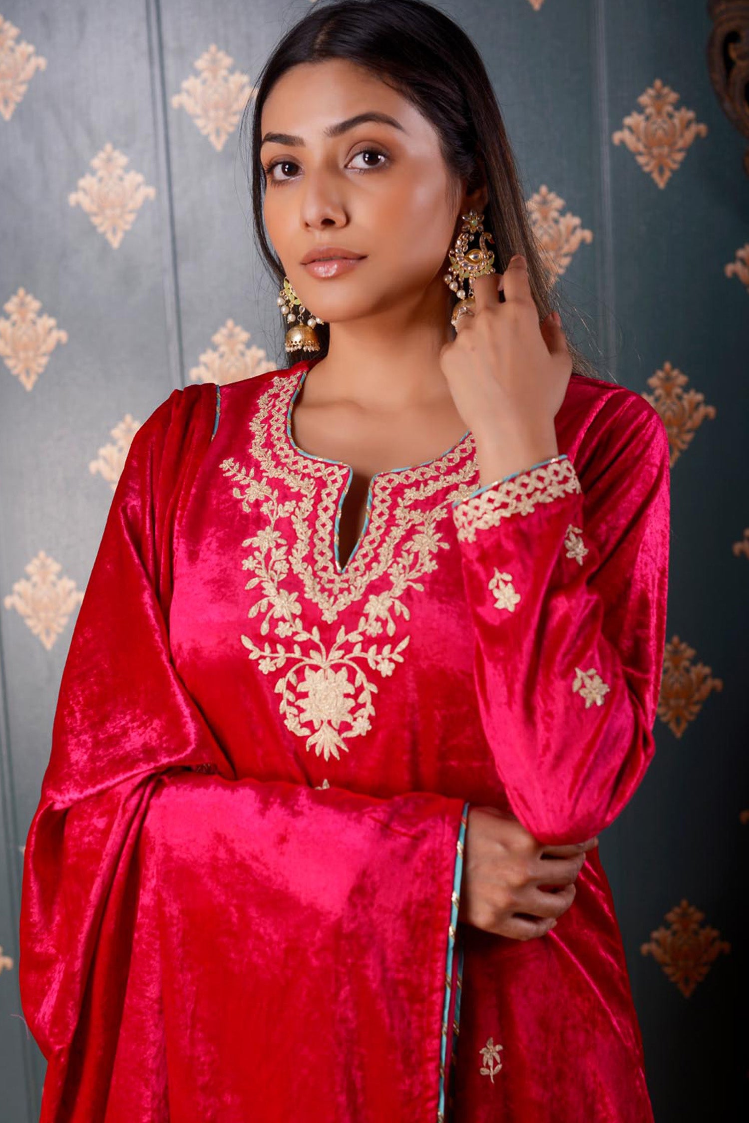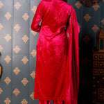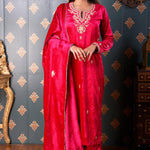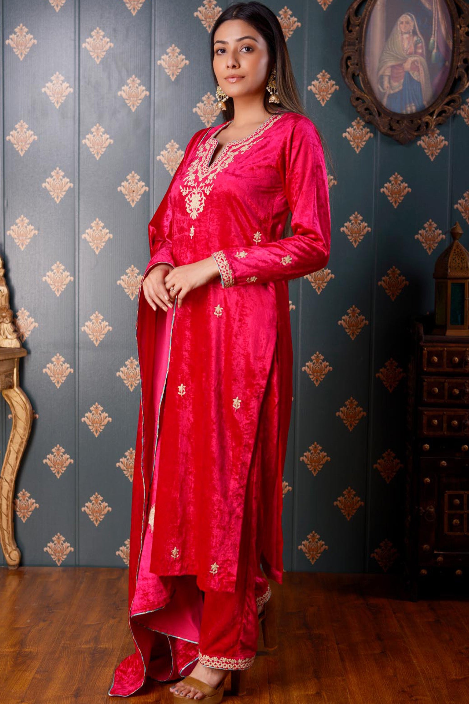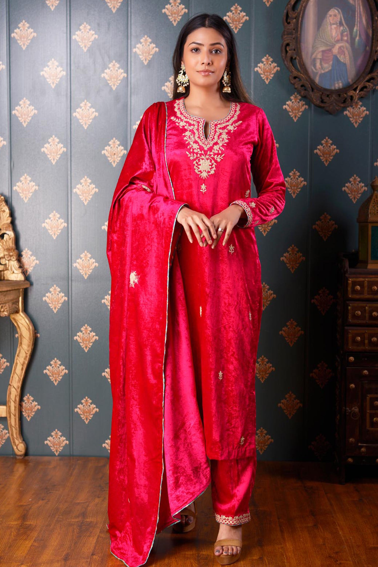 The three piece Velvet set includes Dark Pink Embroidered Neck Kurta ,Pant And Dupatta With Lace Finish for a rich and beautiful look with elegance.