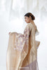 An english violet banarasi saree with an organza base, designed with gold and tilfi zari, floral butta jangla pattern all over body. Adorned with small, intricately woven golden zari border in geometrical pattern that adds to the look. Perfect for wedding, festive occasions, etc.