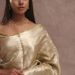 this fawn yellow tissue organza banarsi saree presents a delicate gold zari border and floral design. The soft, leightweight fabric makes it perfect for weddings and festive occasions.