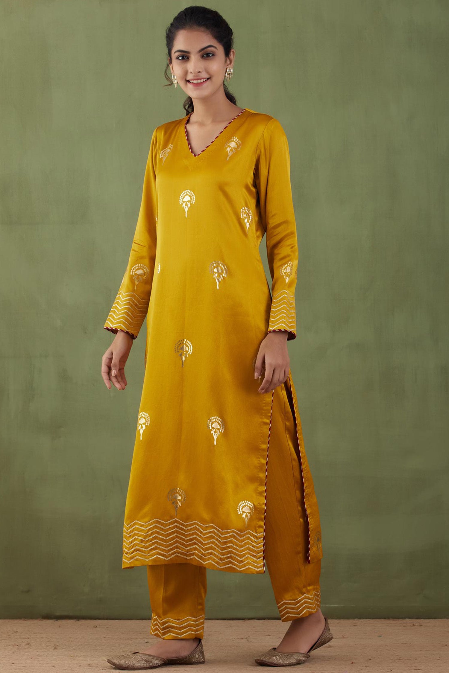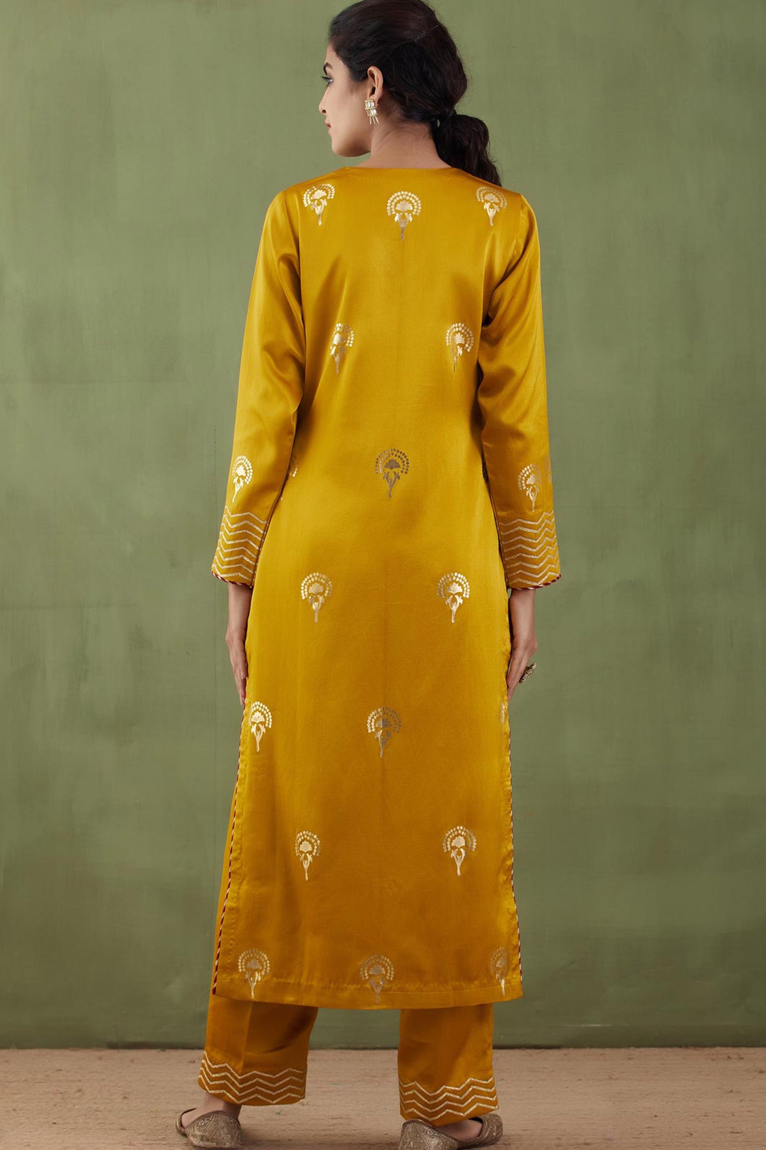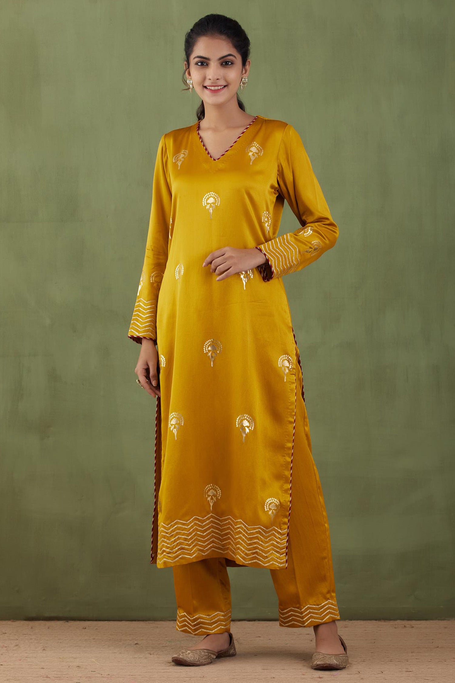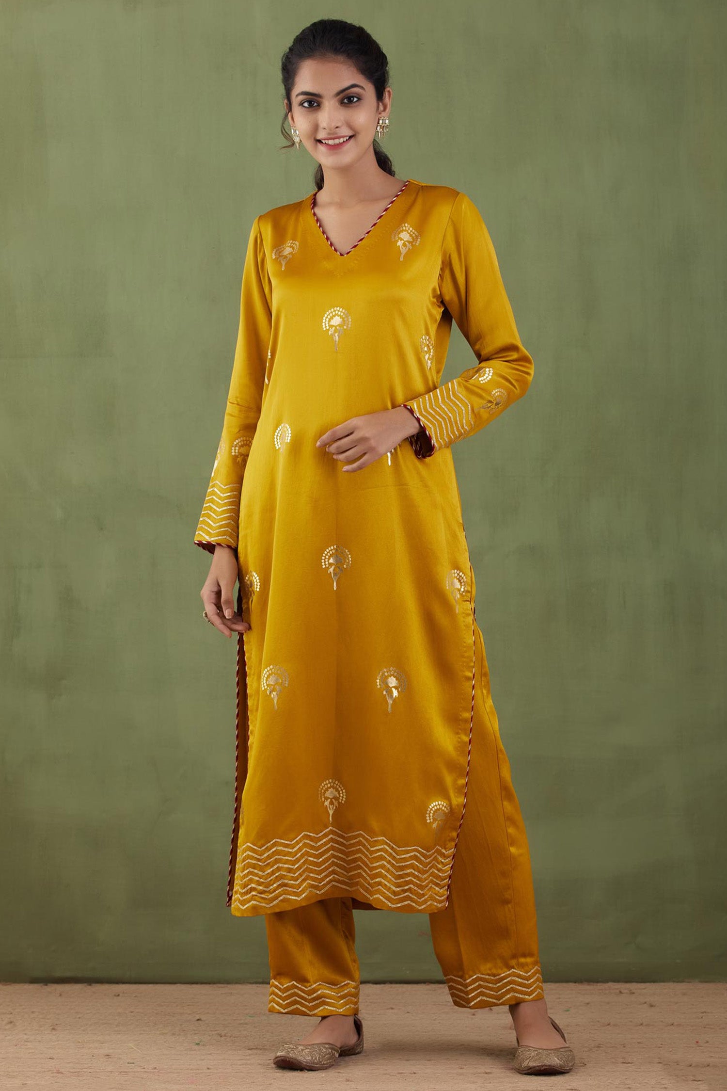 The elegant mustard mashru silk straight kurta set with the matching pants set along with the foil printed design for a rich look in casual and festive occasions with the desired comfort for the dignified touch.